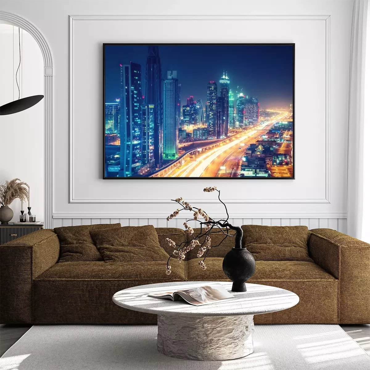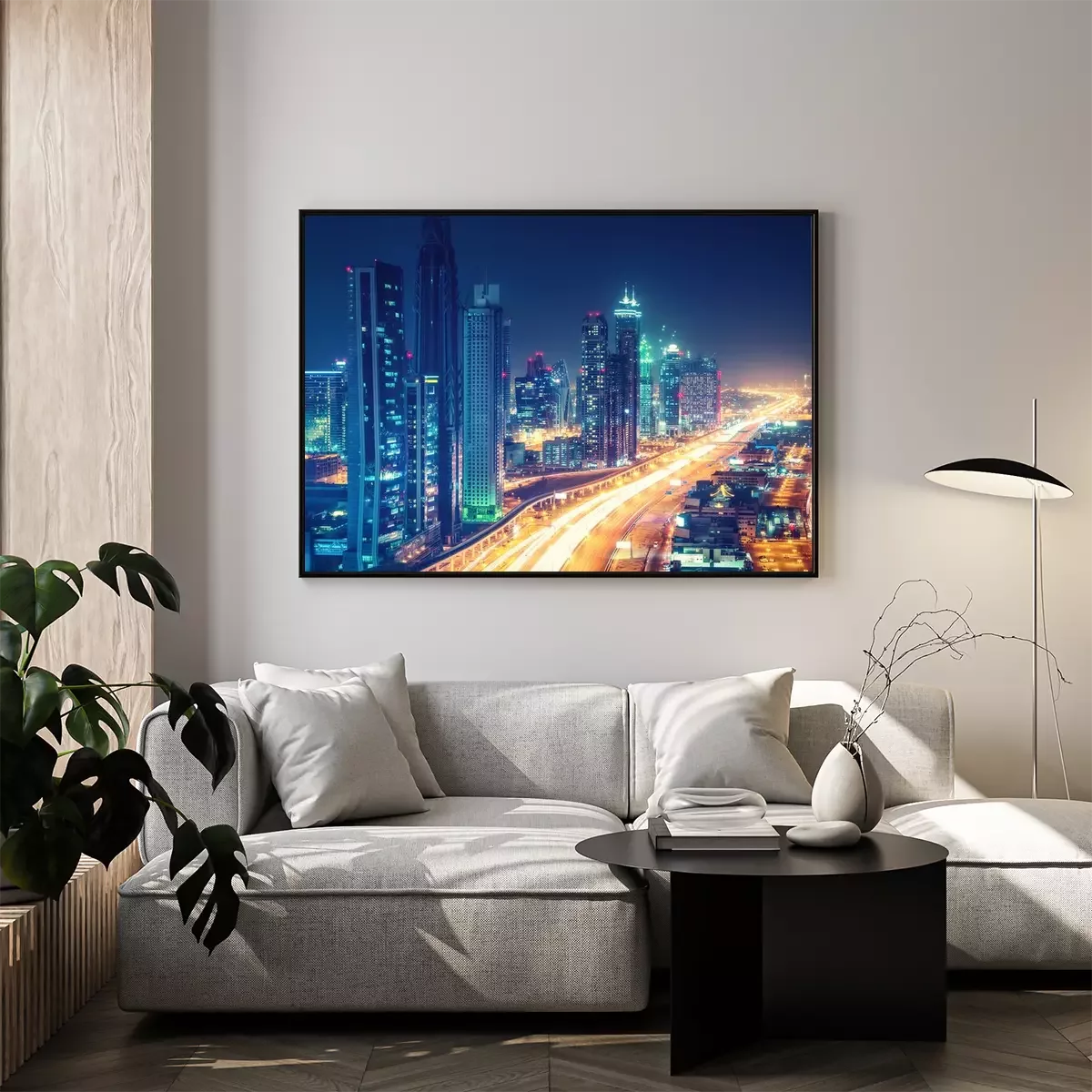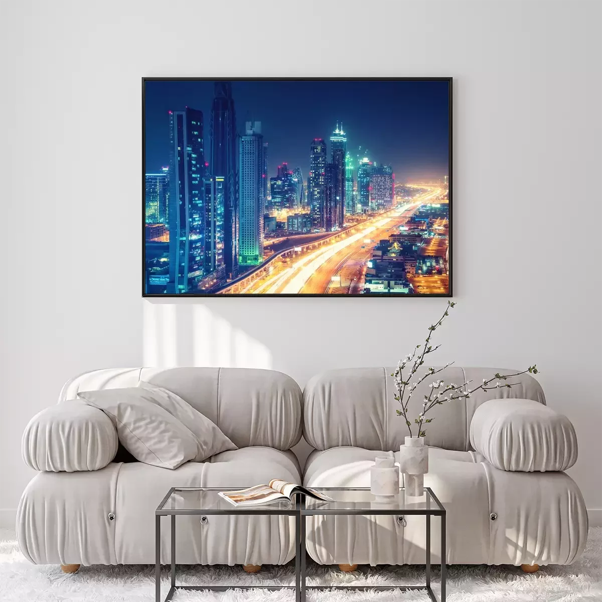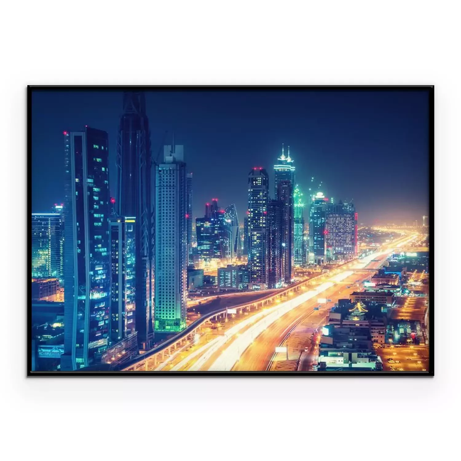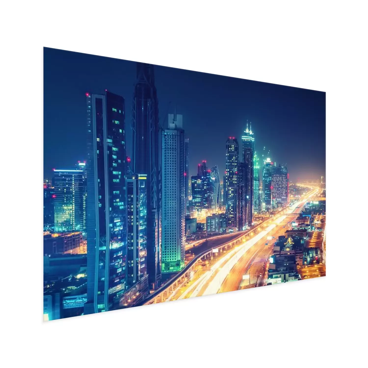 Poster: Verlichte Dubai straat en hoge gebouwen