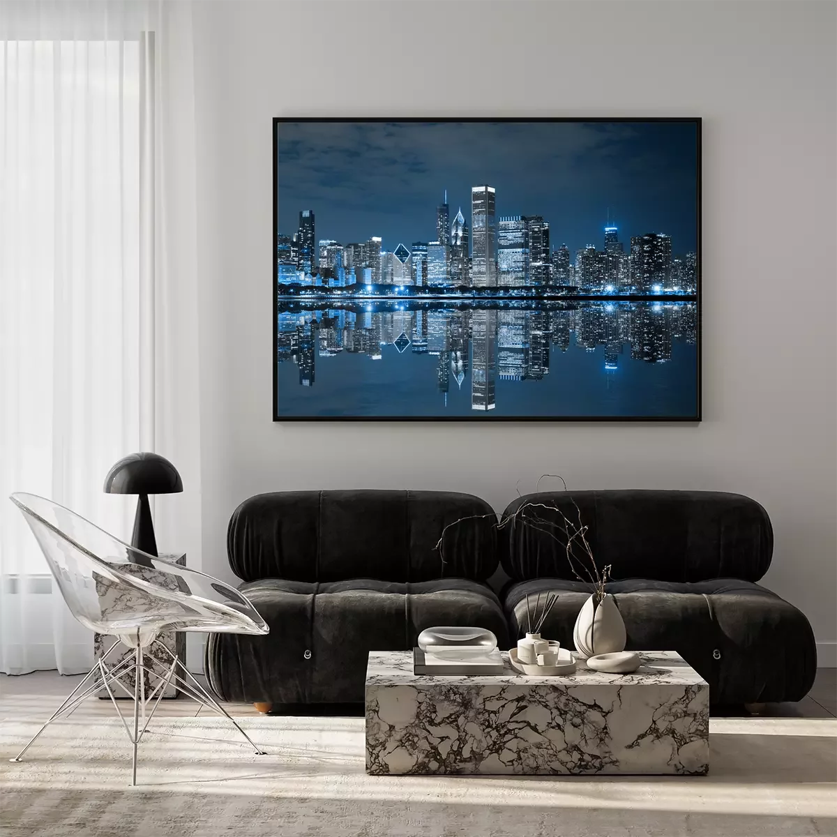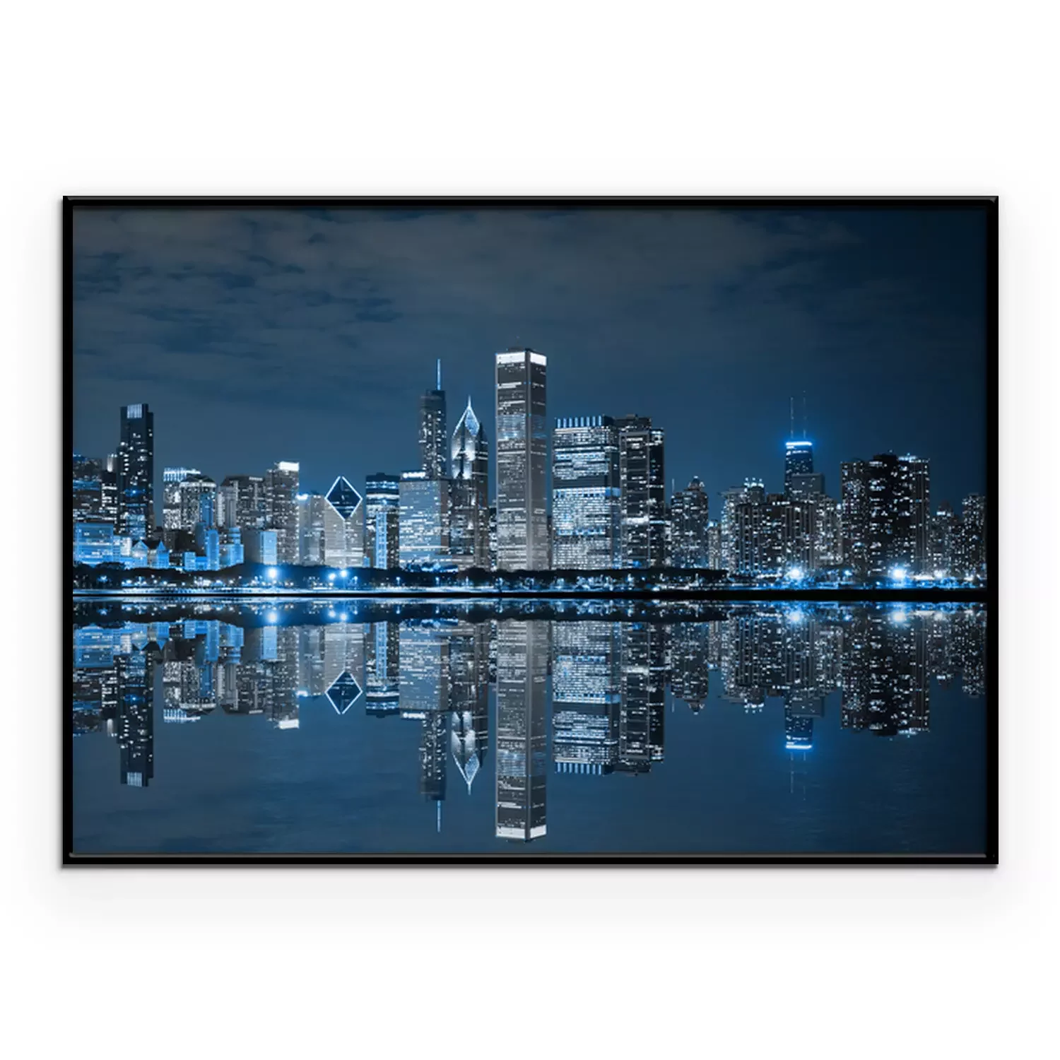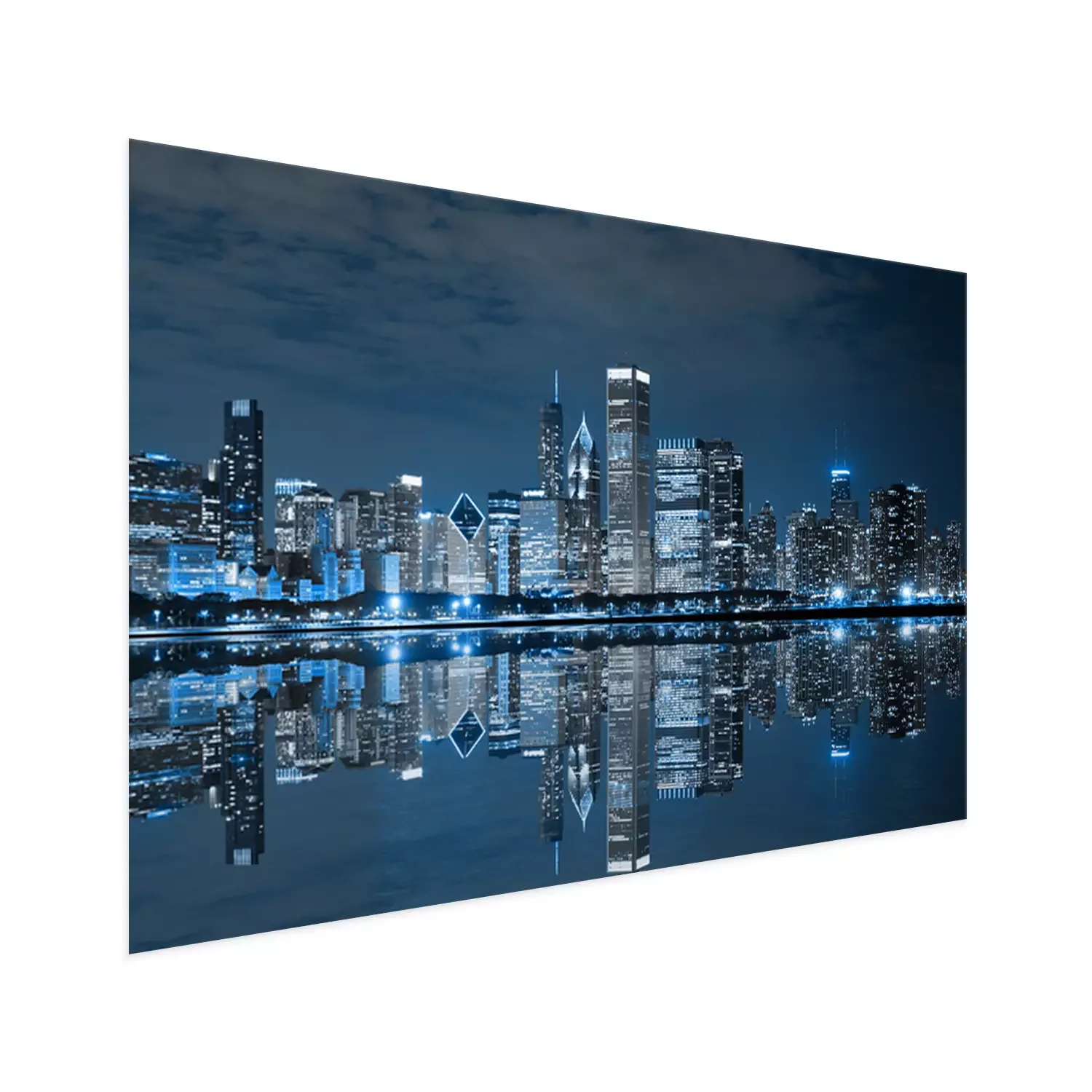 Poster: Verlichte wolkenkrabbers van Chicago weerspiegeld in het water 's nachts