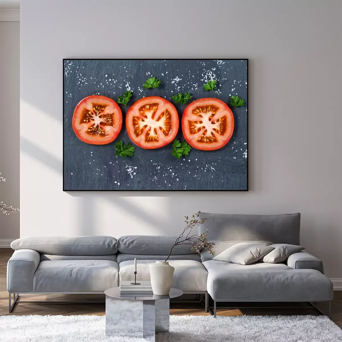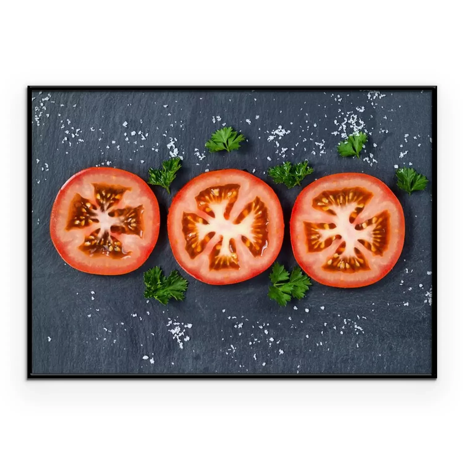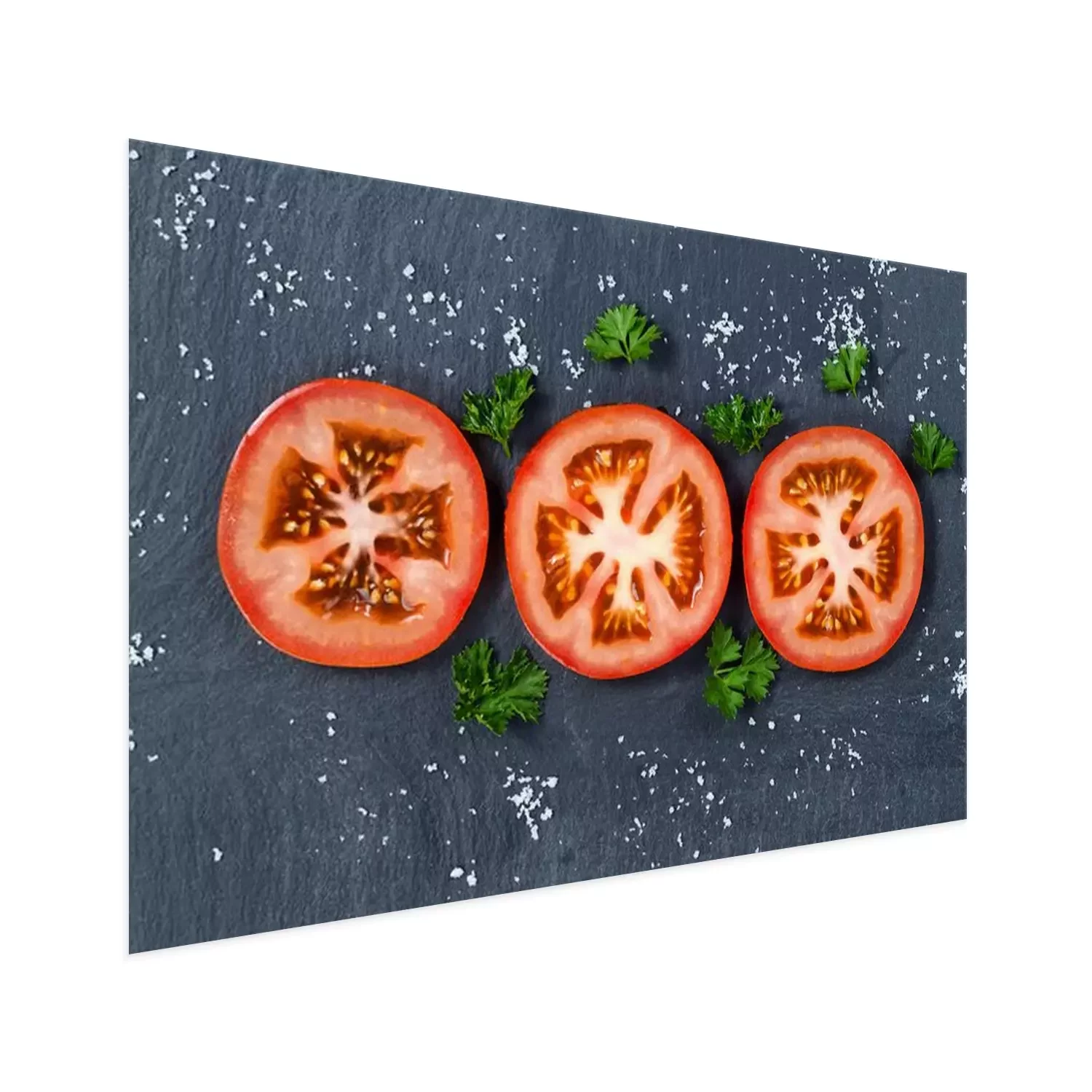 Poster: Vers gesneden tomaat op een zwarte leisteen achtergrond