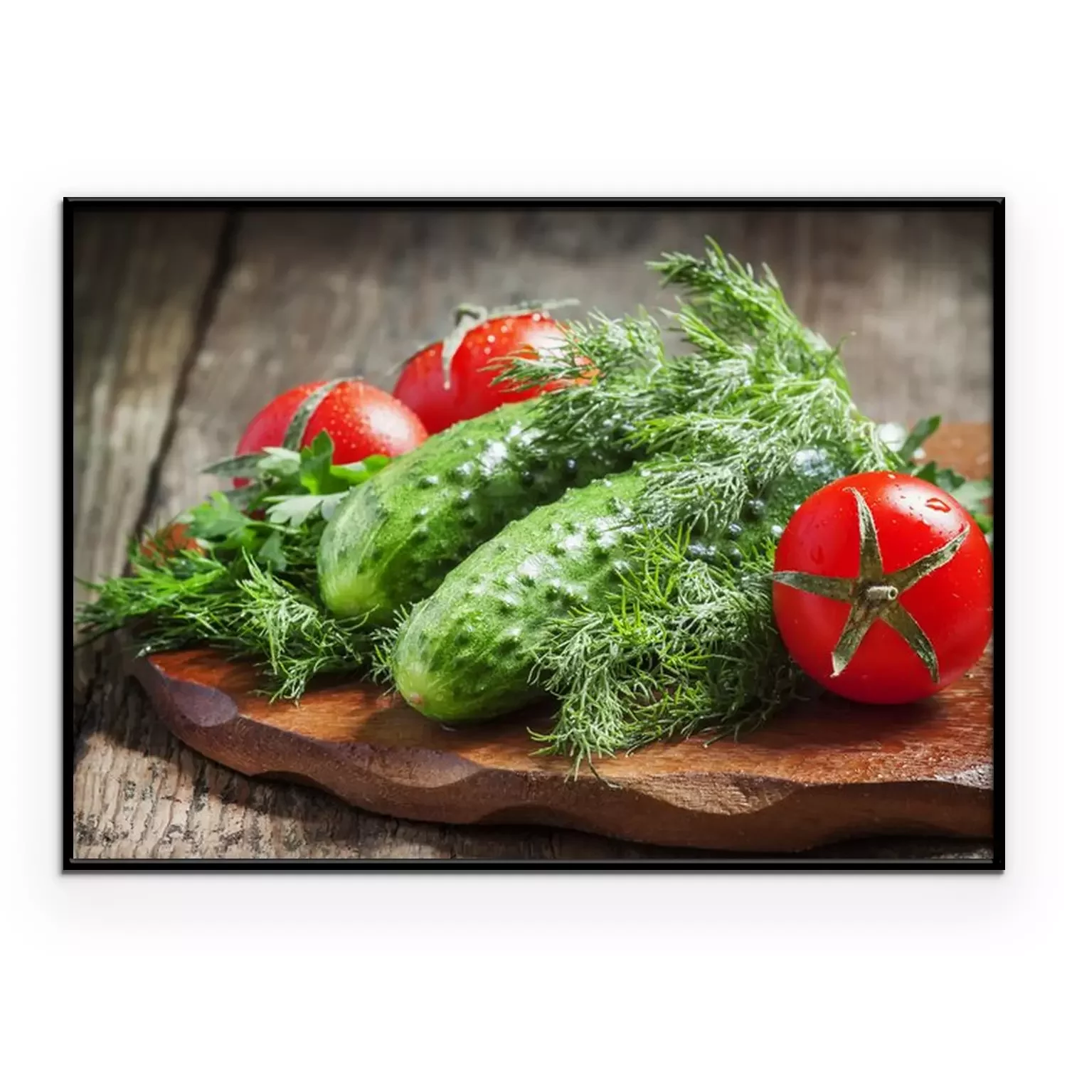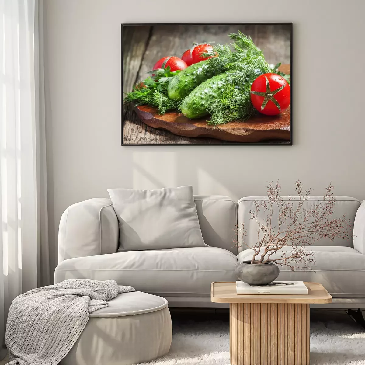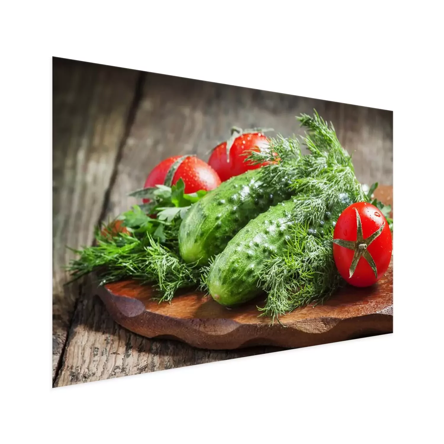 Poster: Verse komkommers, tomaten, dille en peterselie op de oude houten ba