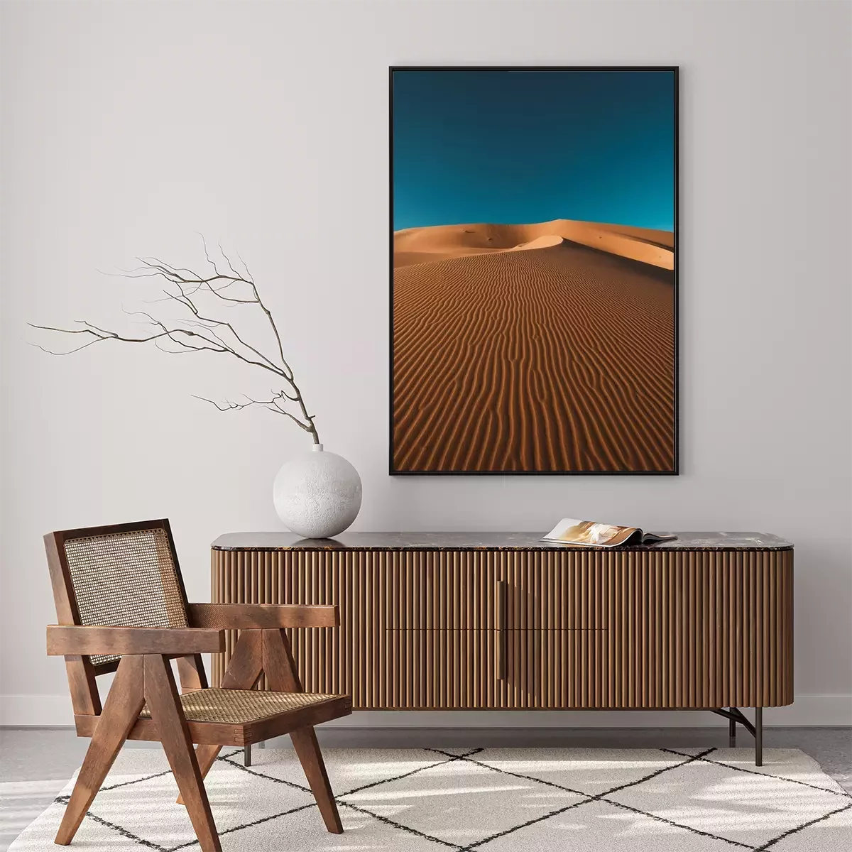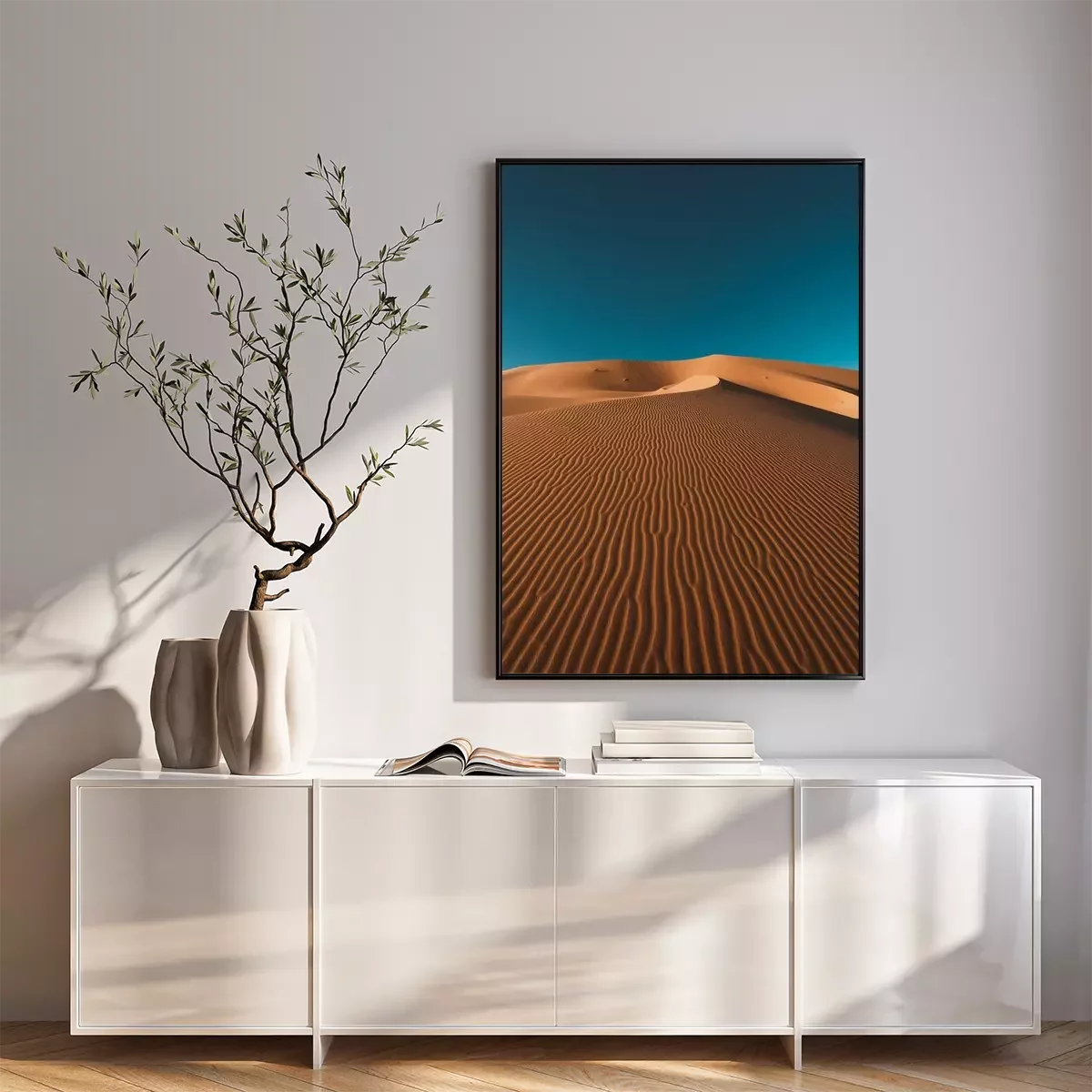 Poster: Vertical shot of a peaceful desert under the clear blue sky captured in Morocco