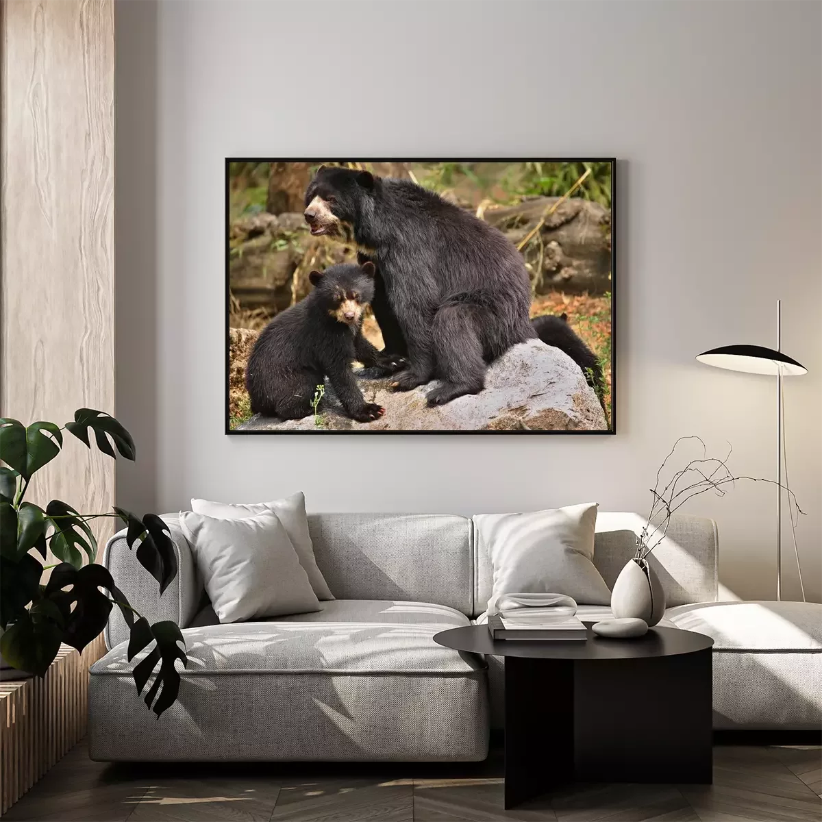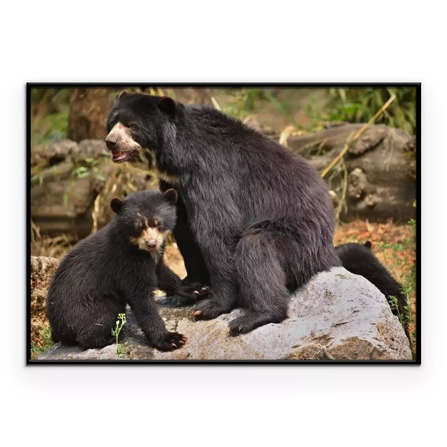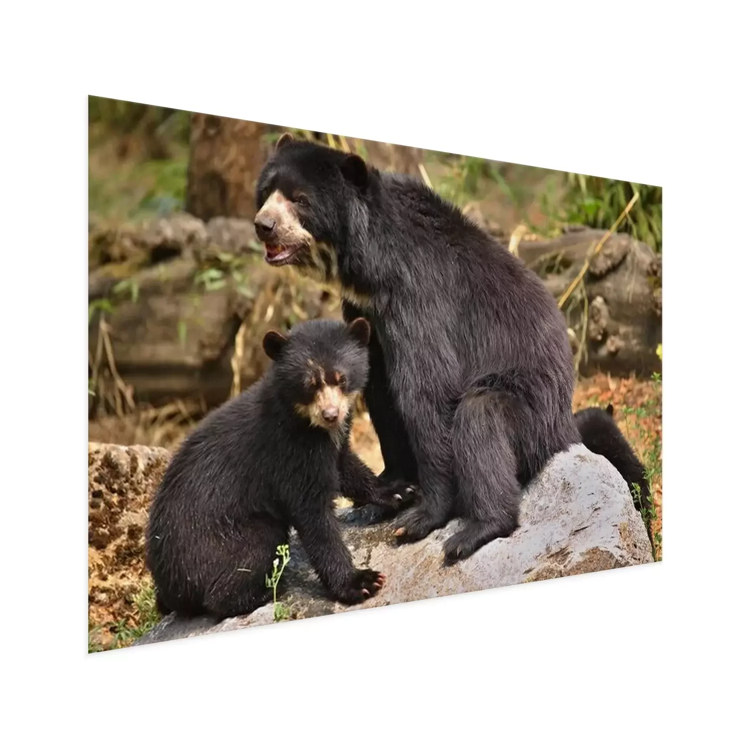 Poster: Very rare and shy andean bear in nature habitat. Unique photo of andean or spectacled bears. Tremarctos ornatus.