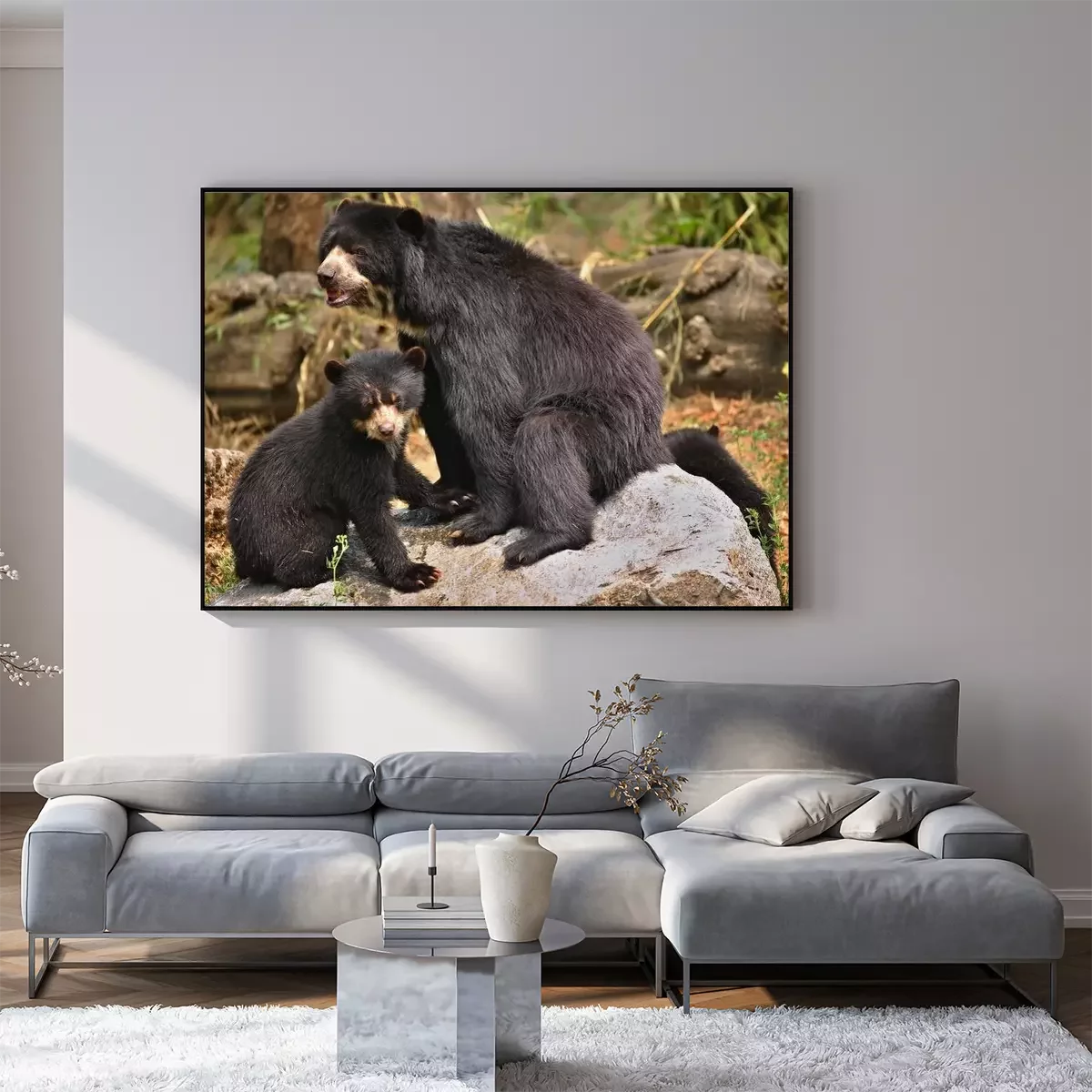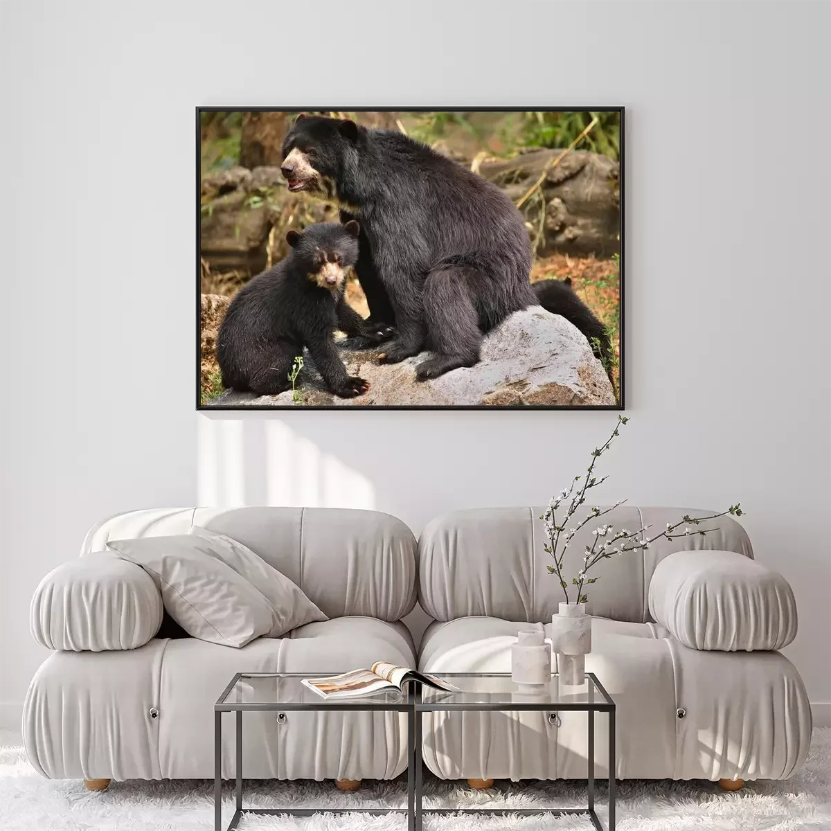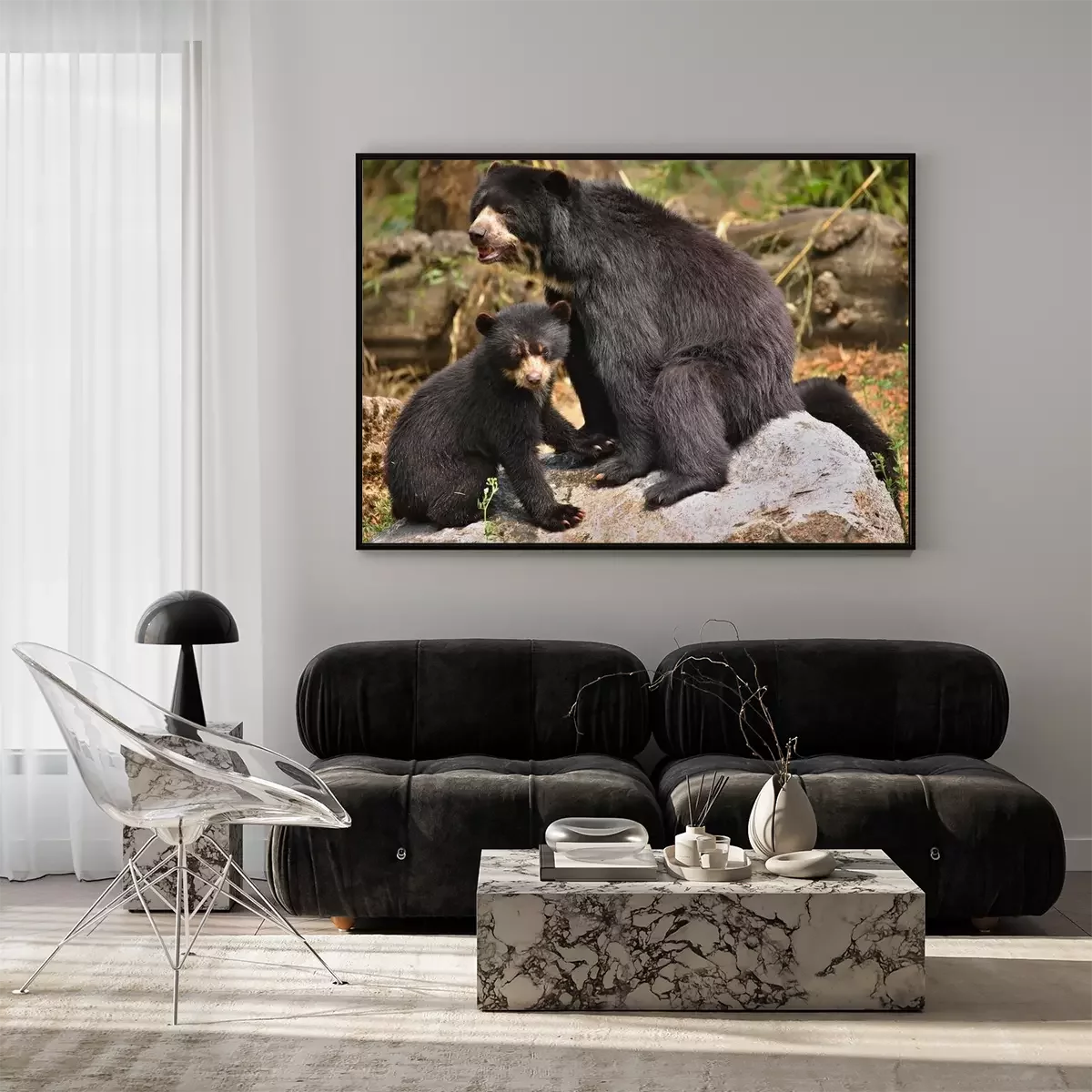 Poster: Very rare and shy andean bear in nature habitat. Unique photo of andean or spectacled bears. Tremarctos ornatus.