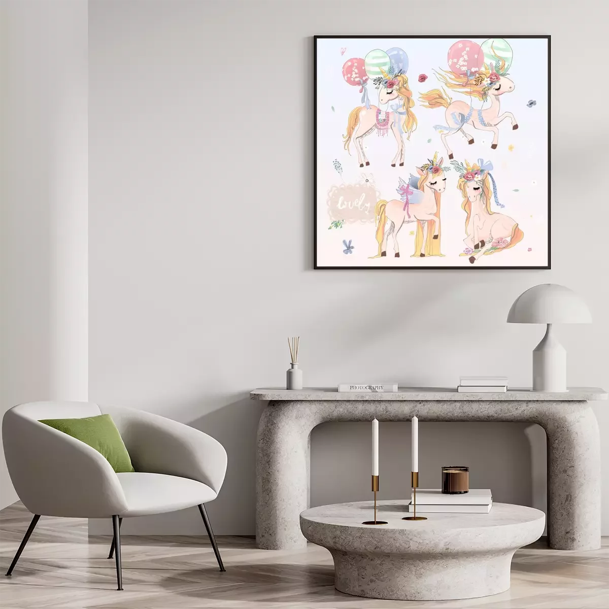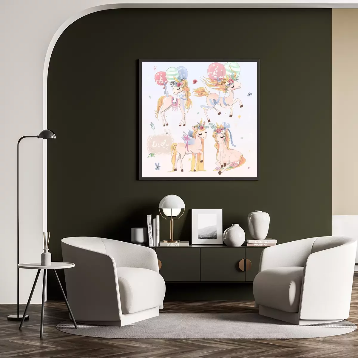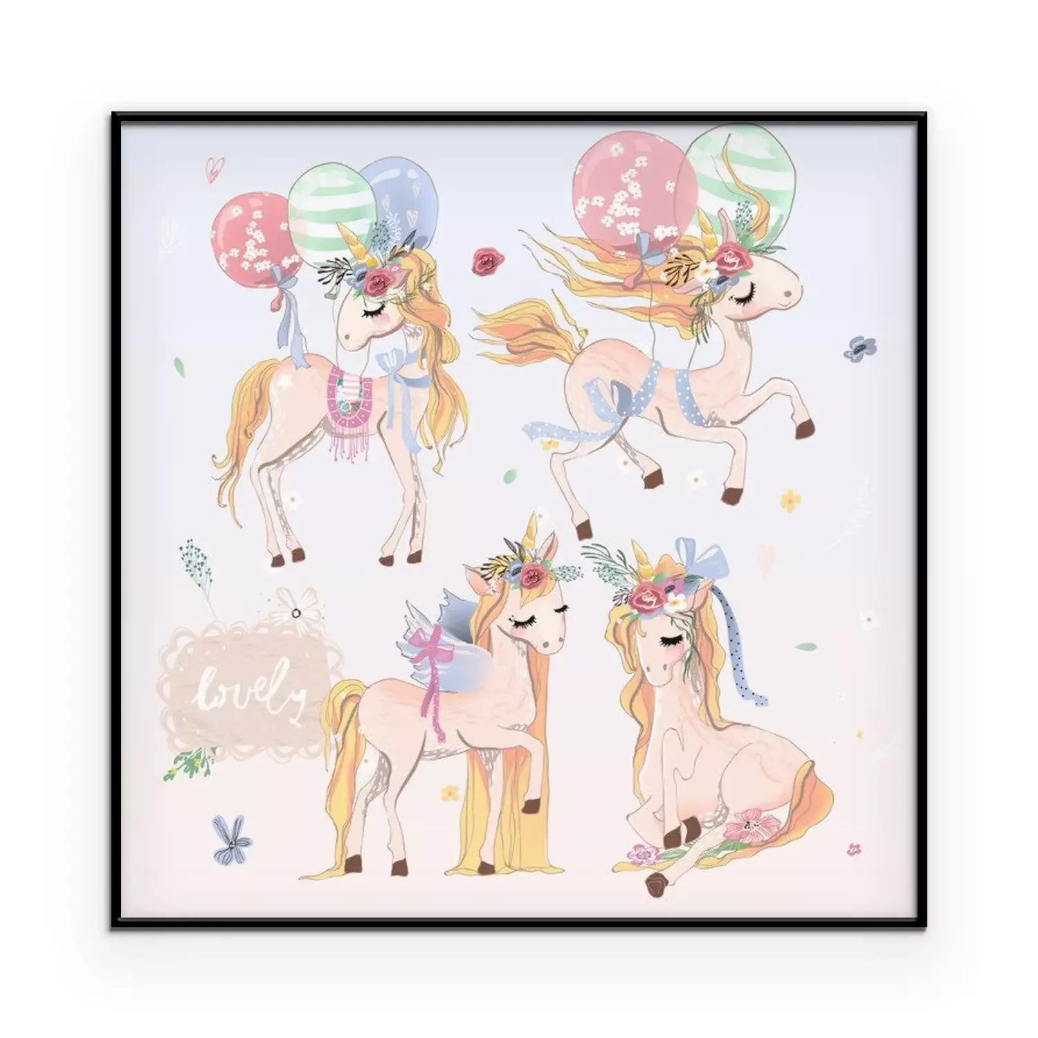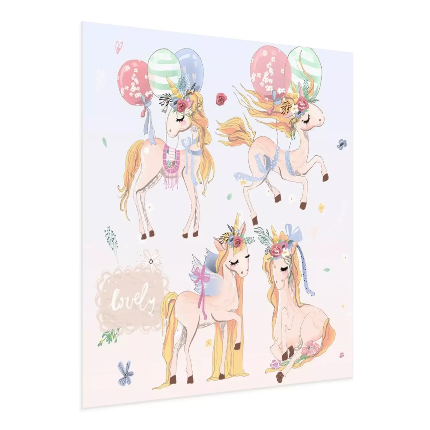 Poster Vier eenhoorns in verschillende poses en ballonnen