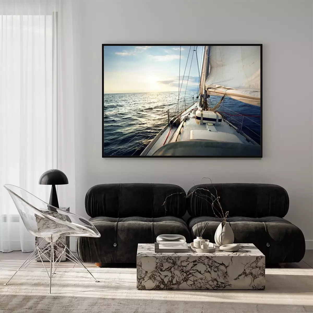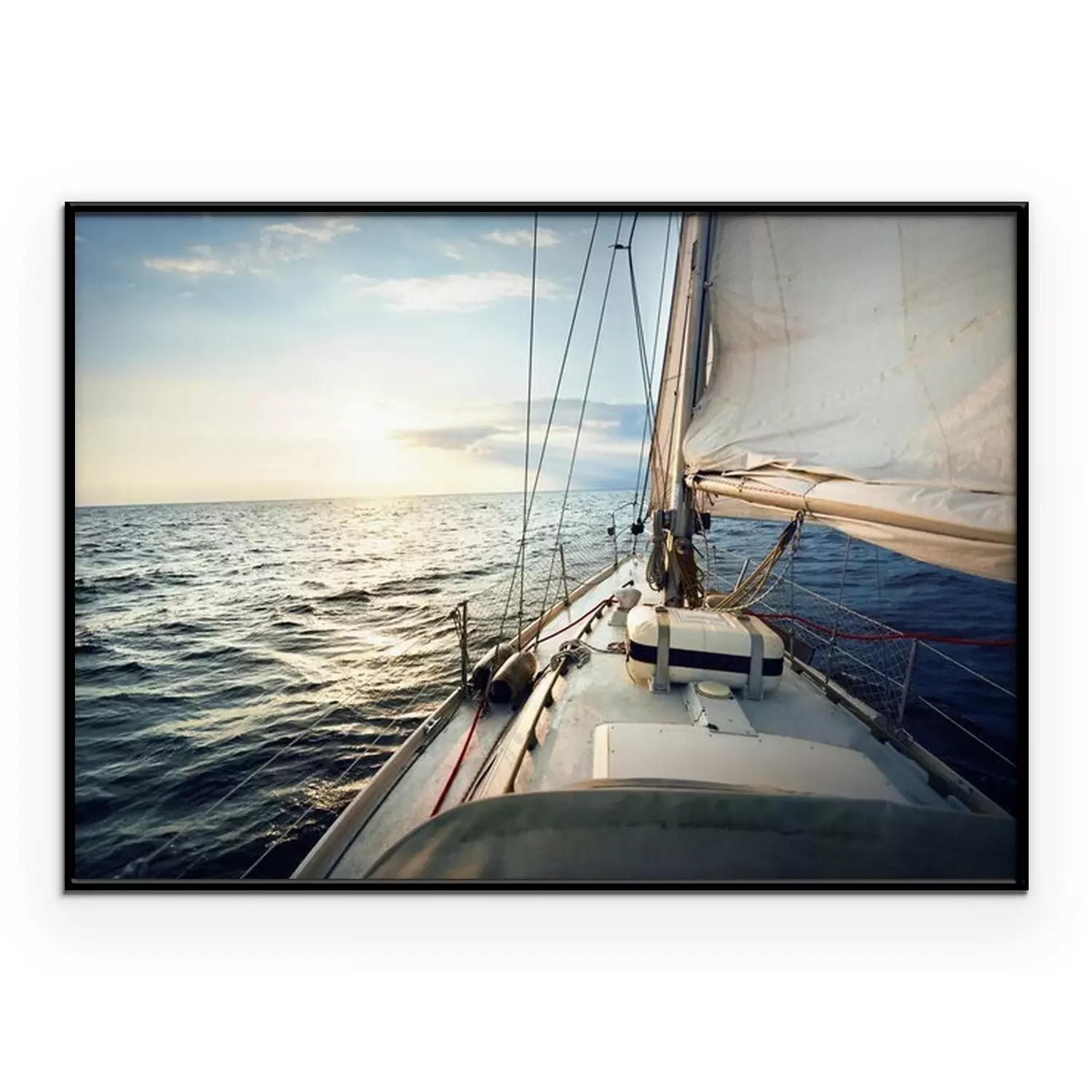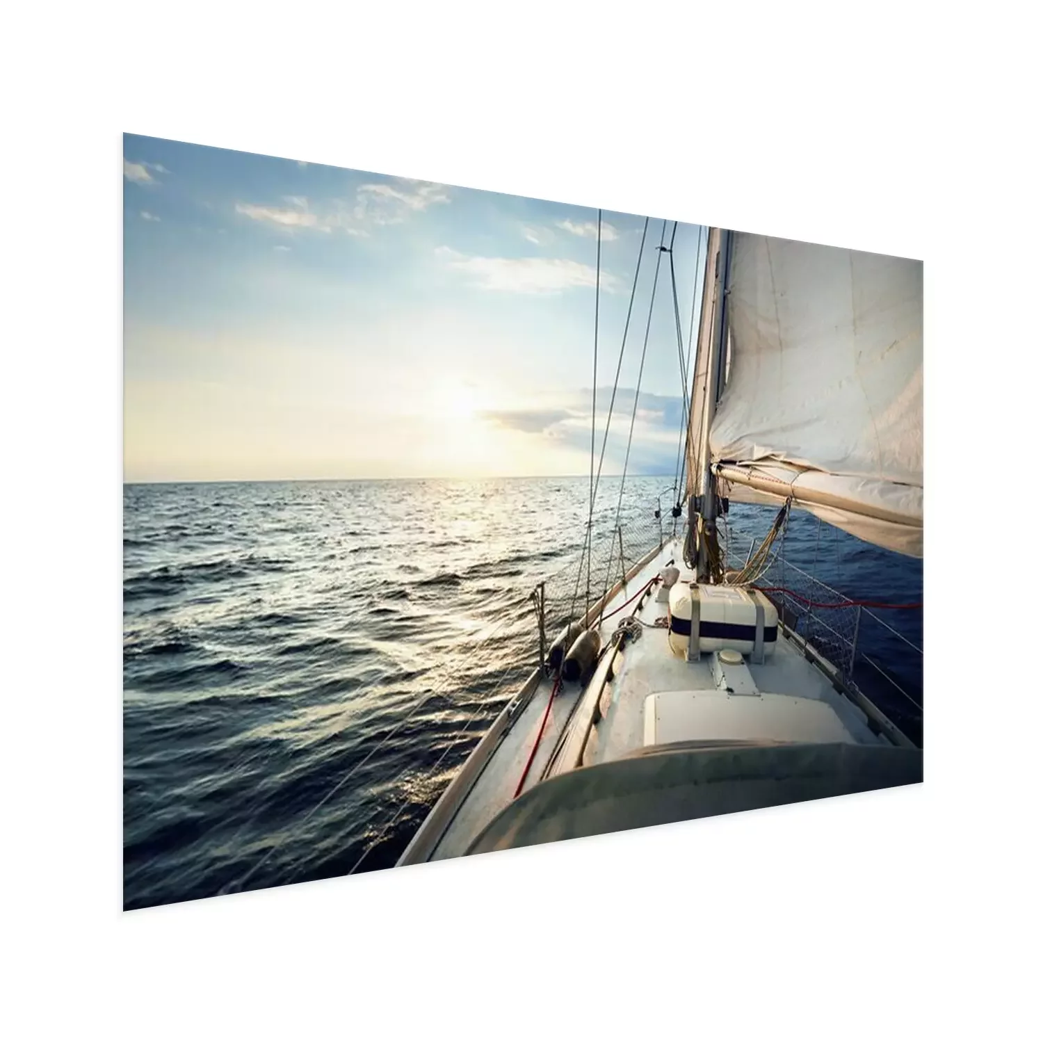 Poster View from the deck to the bow of a sail yacht tilted in a wind on a sunset