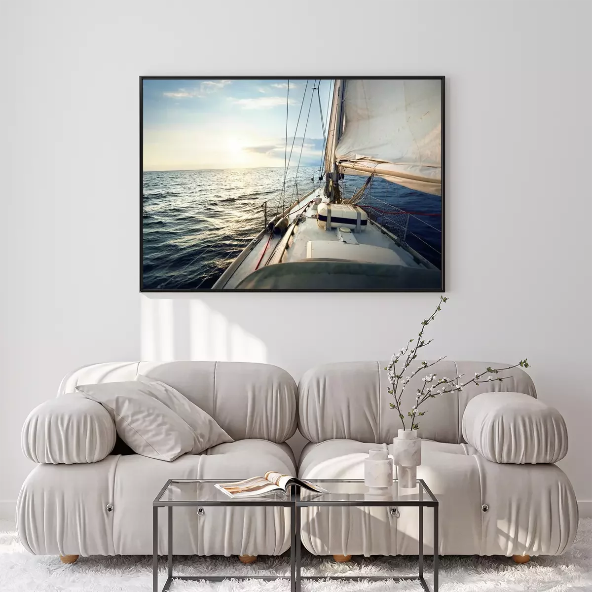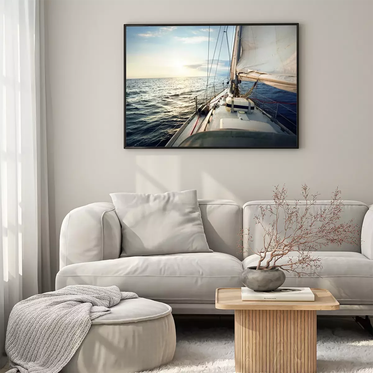 Poster: View from the deck to the bow of a sail yacht tilted in a wind on a sunset