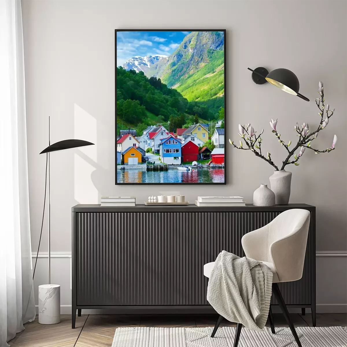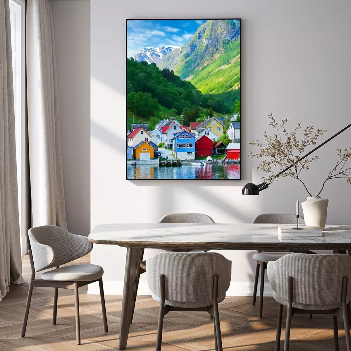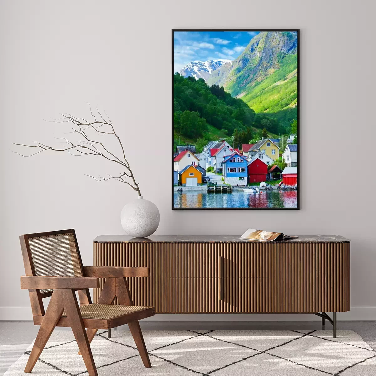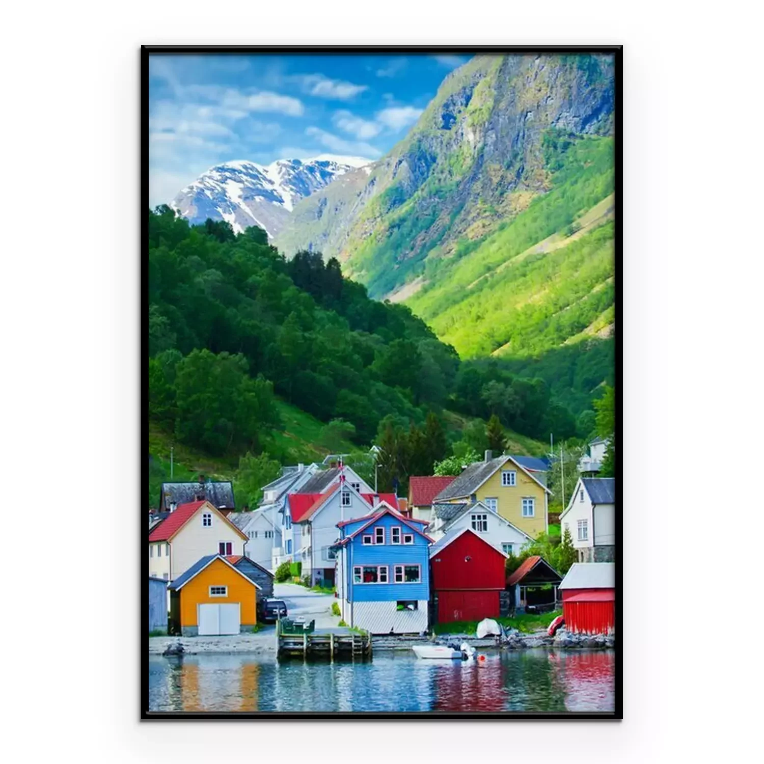 Poster Village en Zeezicht op de bergen in Geiranger fjord, Noorwegen