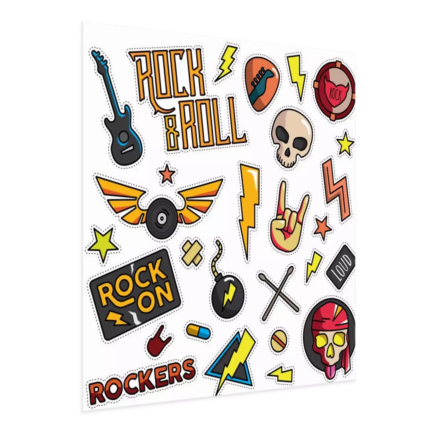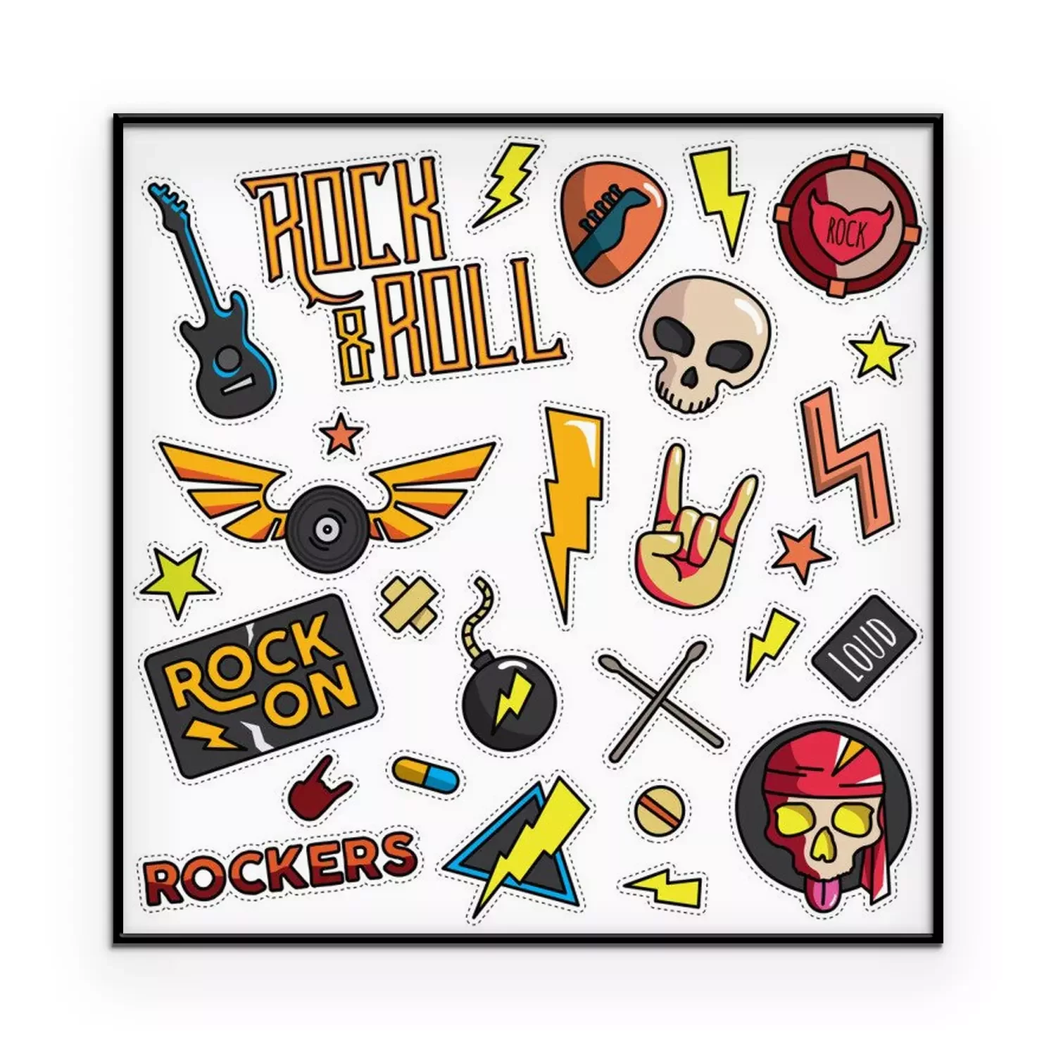 Poster: Vintage 80s-90s Rock & Roll mode cartoon illustratie set geschikt voor badges, pinnen, sticker, patches, stof, denim, borduurwerk en andere mode gerelateerde doel
