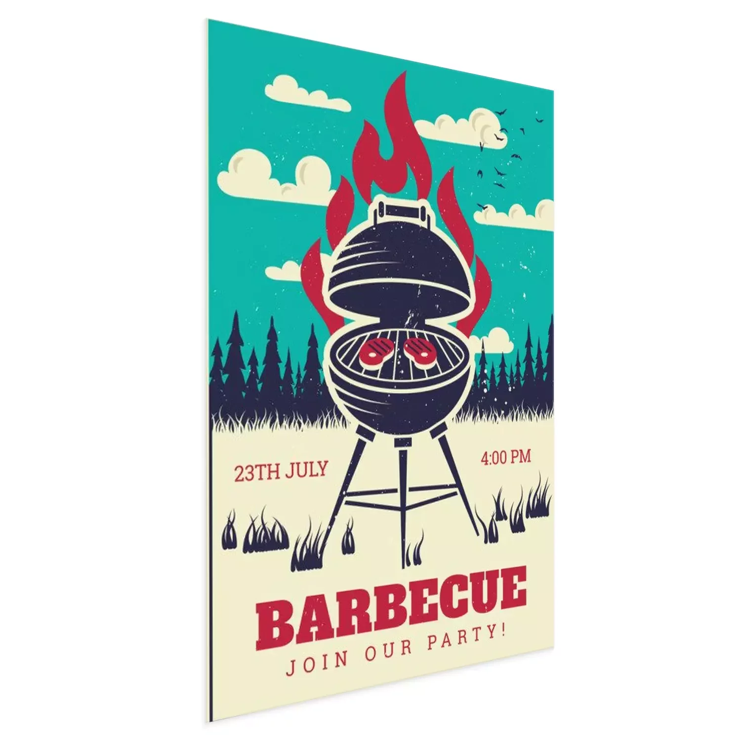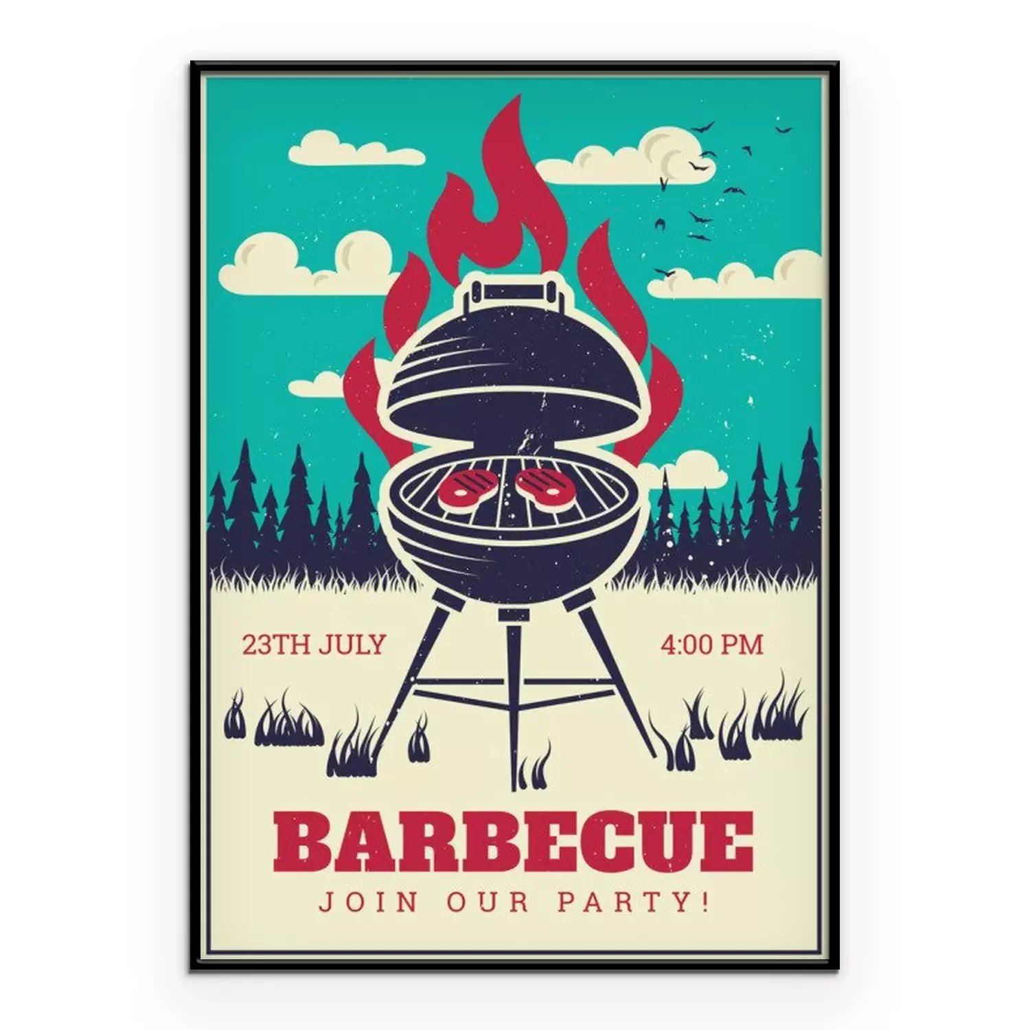 Poster Vintage BBQ-grill partij poster. Heerlijke gegrilde burgers, familie barbecue vector uitnodigingskaart