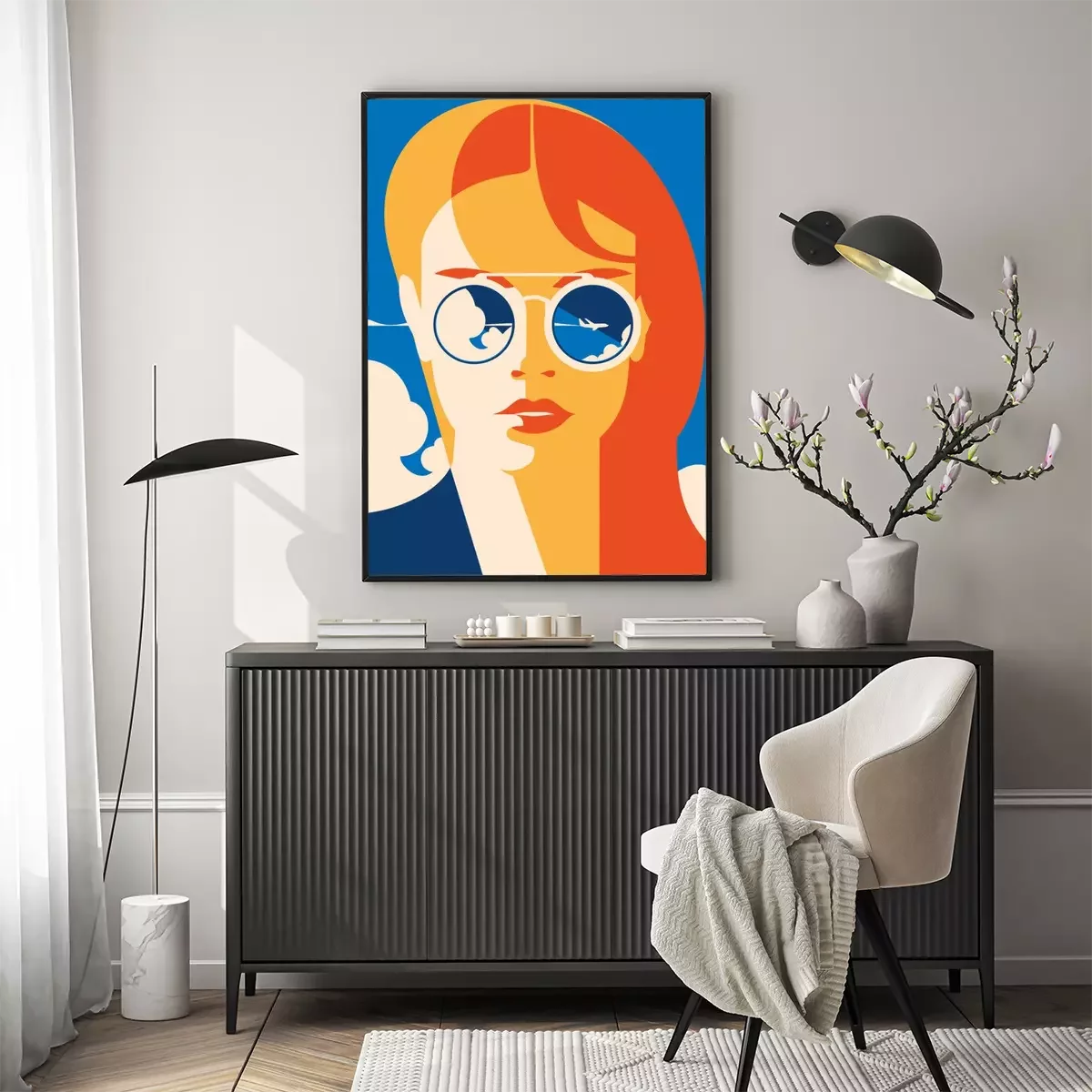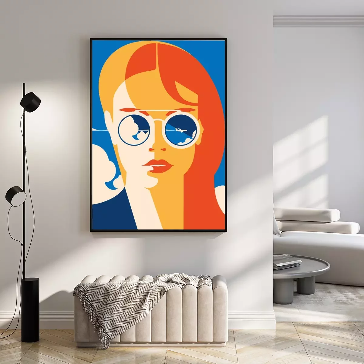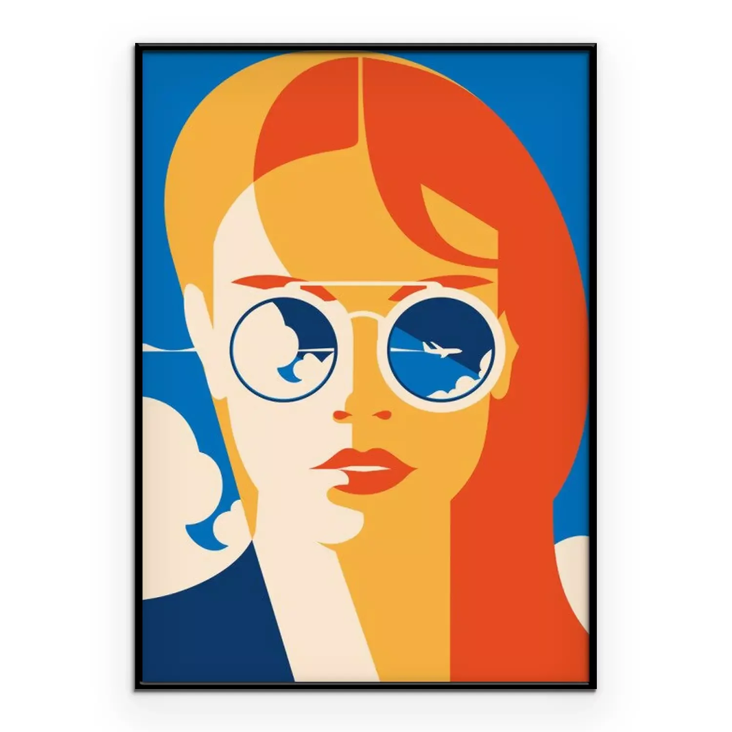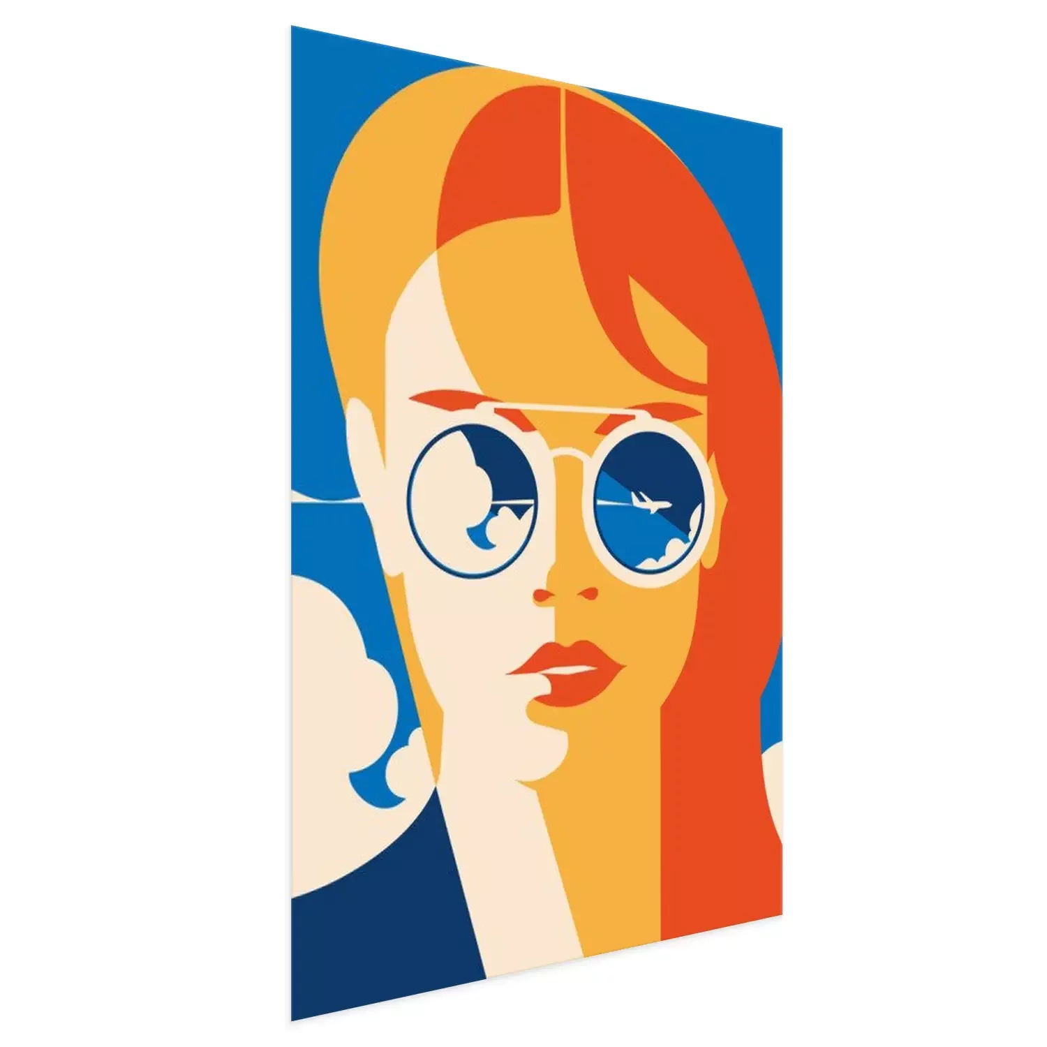 Het portret van de manier van een modelmeisje met zonnebril. Retro trendy kleurenposter of vlieger.