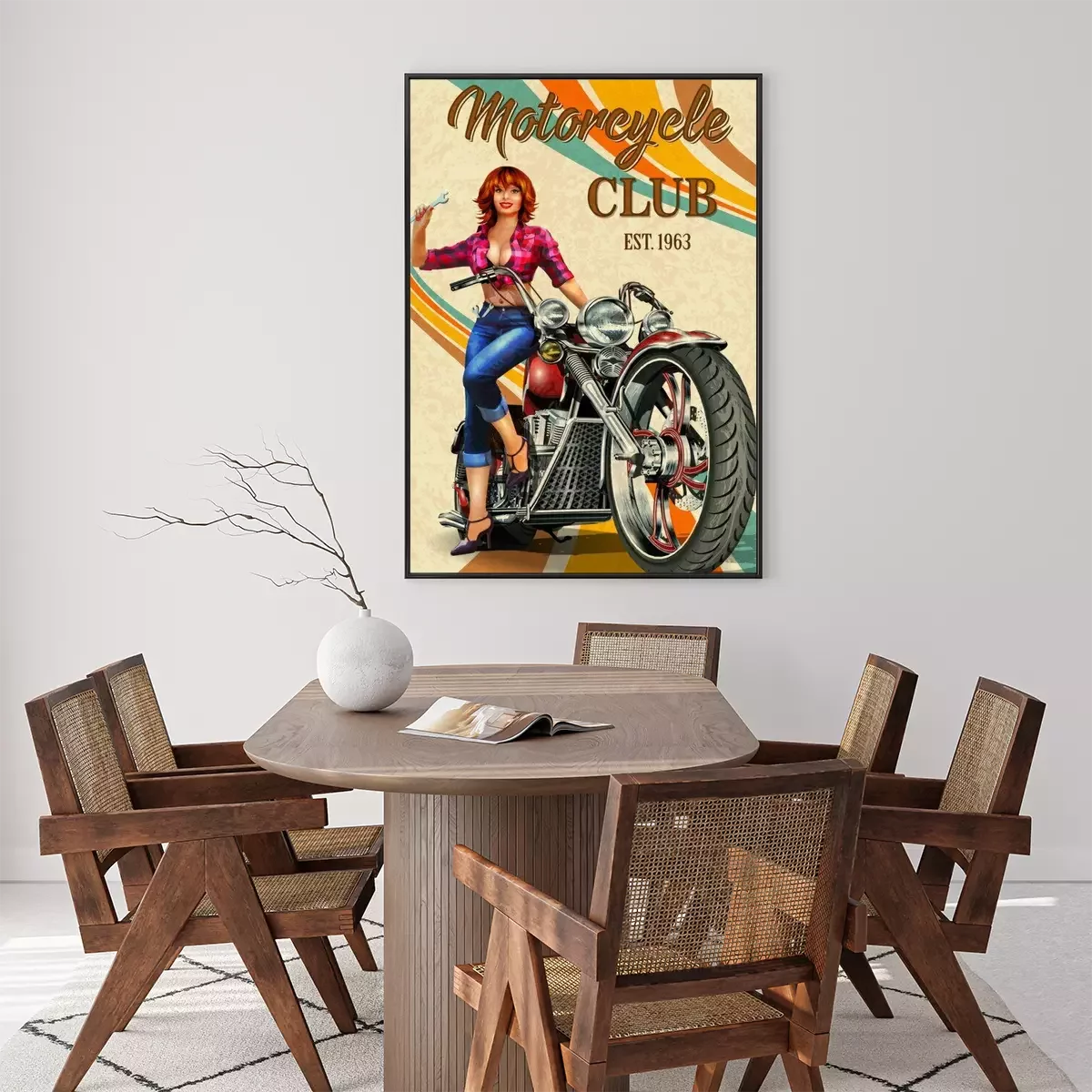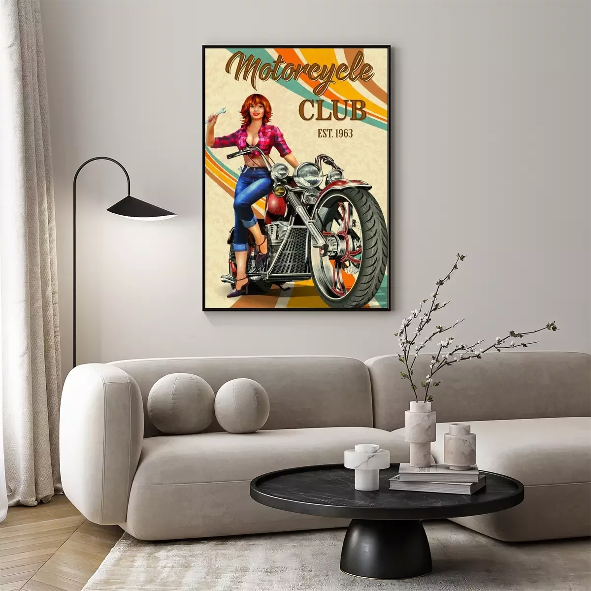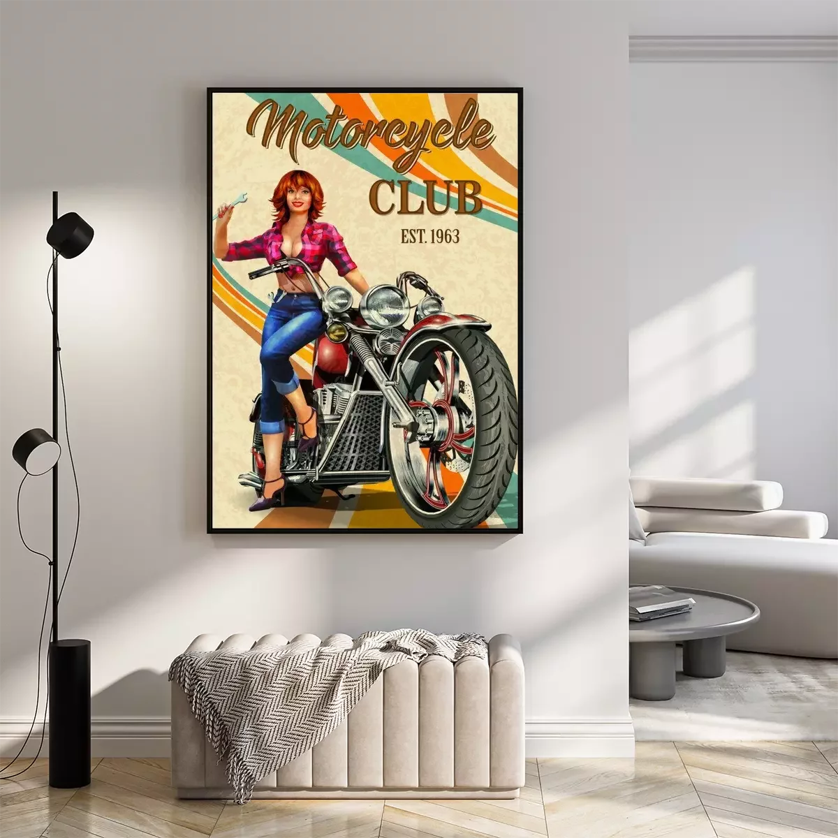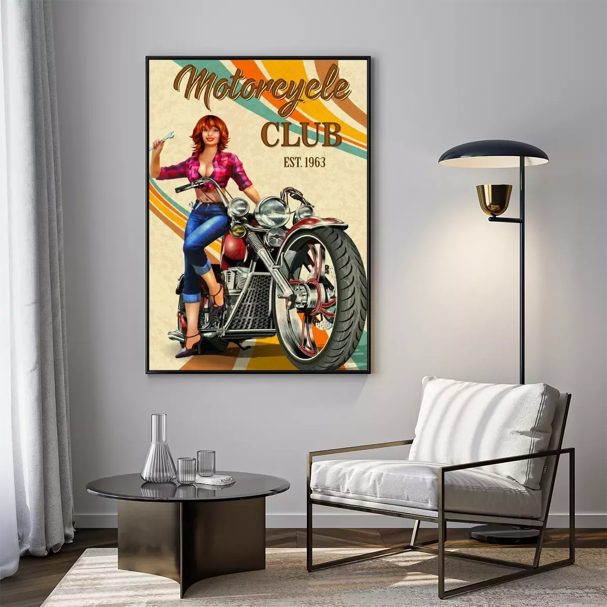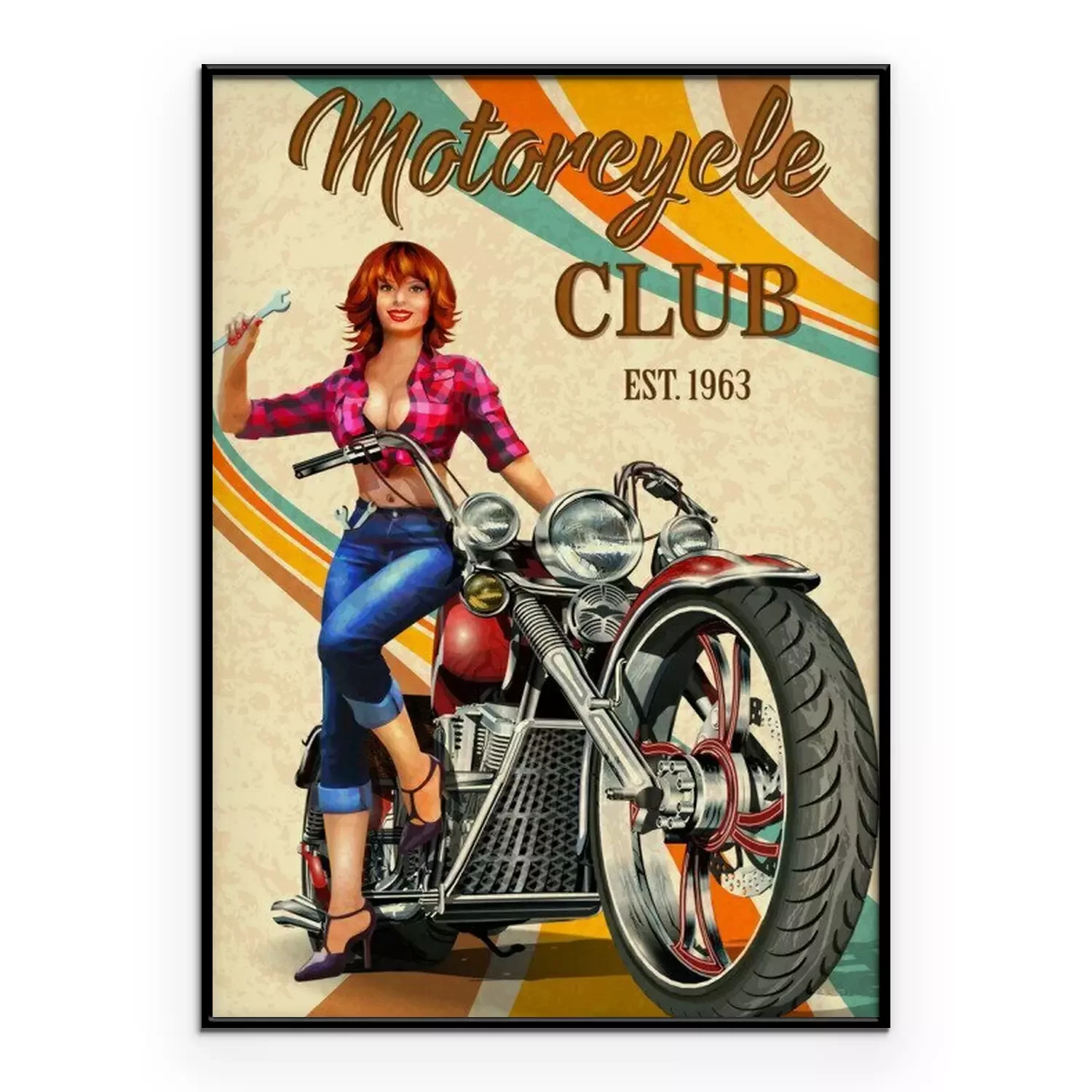 Poster Vintage Motorcycles poster with sexy girl  sitting on retro motorcycle.