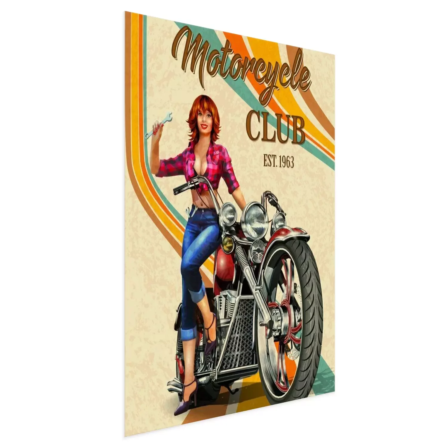 Poster: Vintage Motorcycles poster with sexy girl sitting on retro motorcycle.