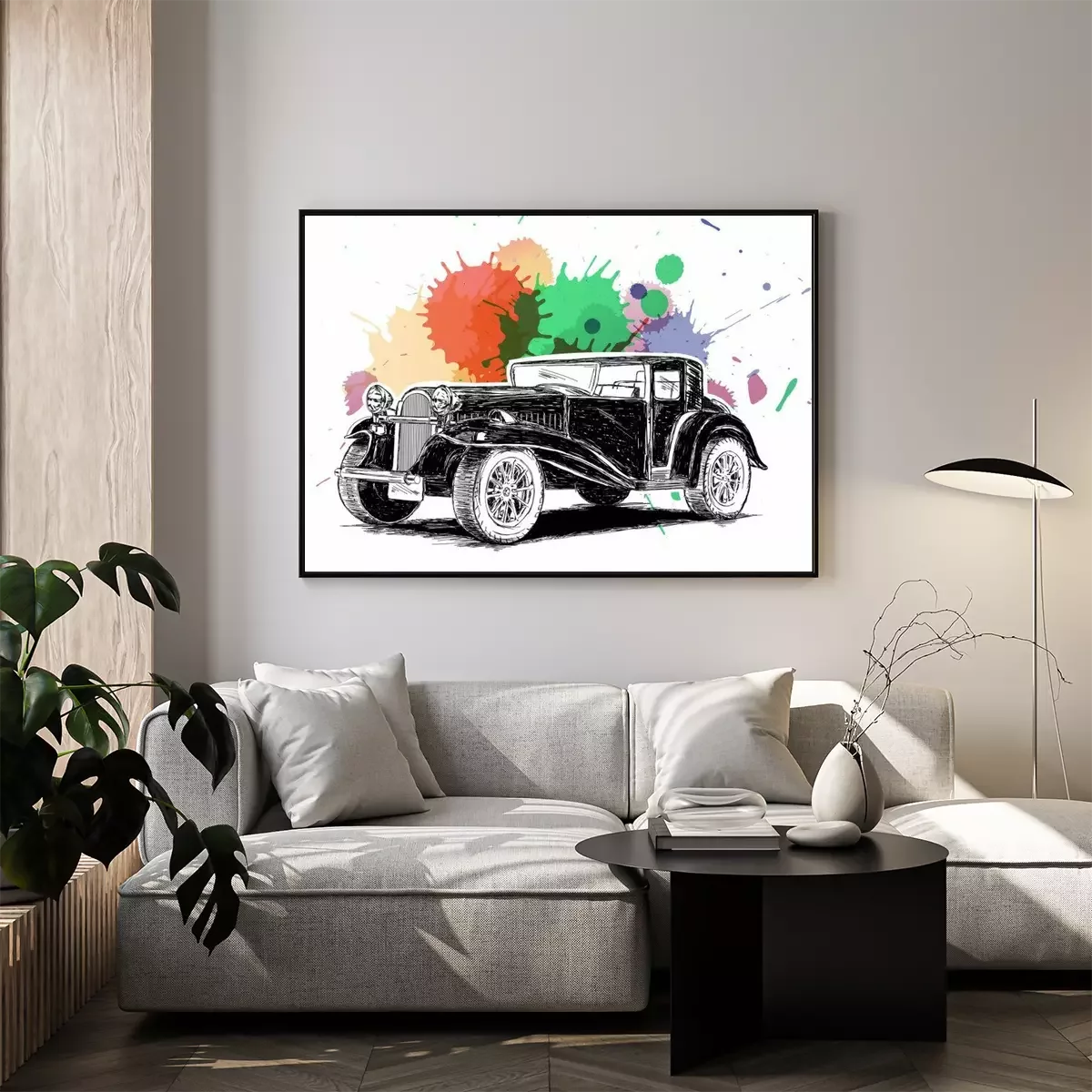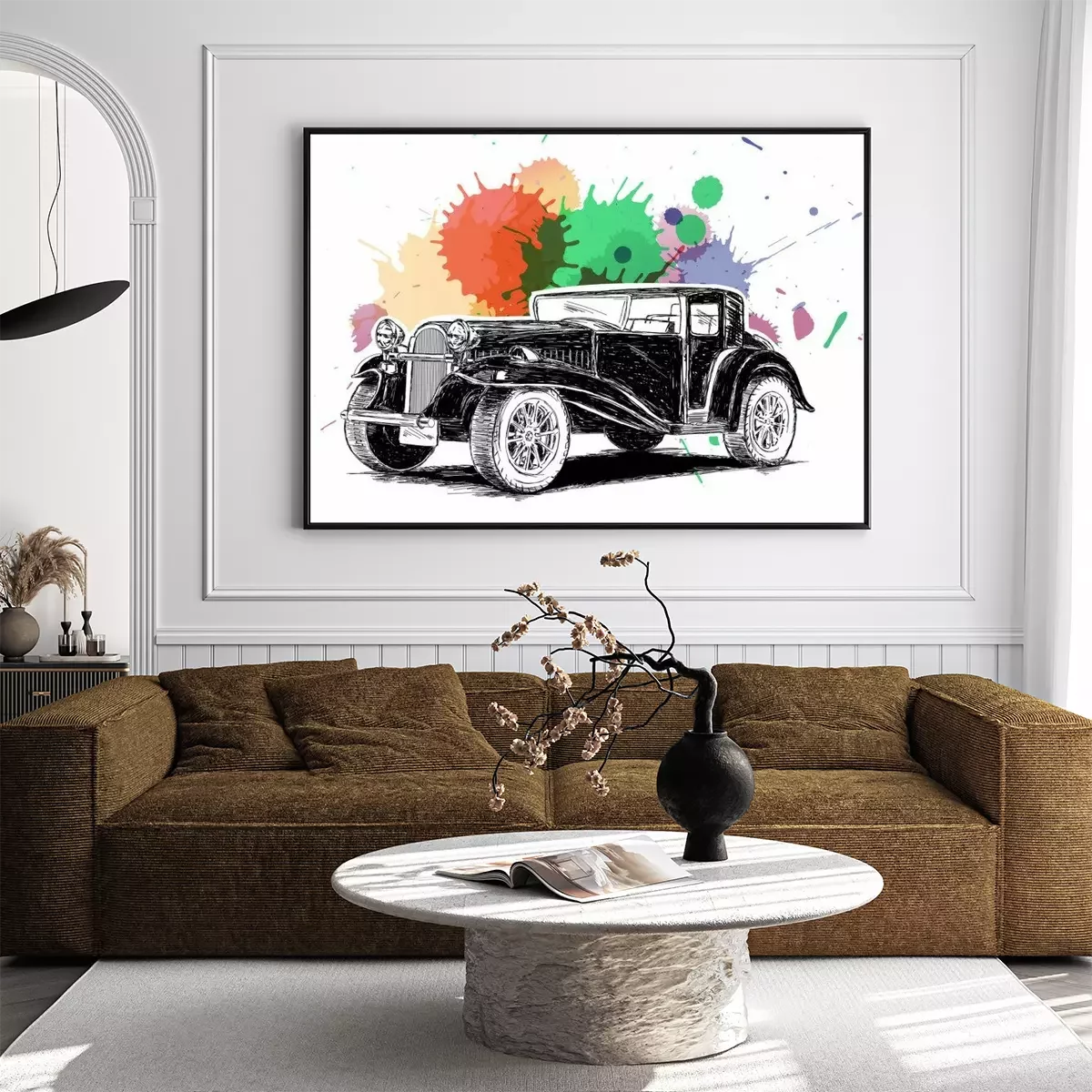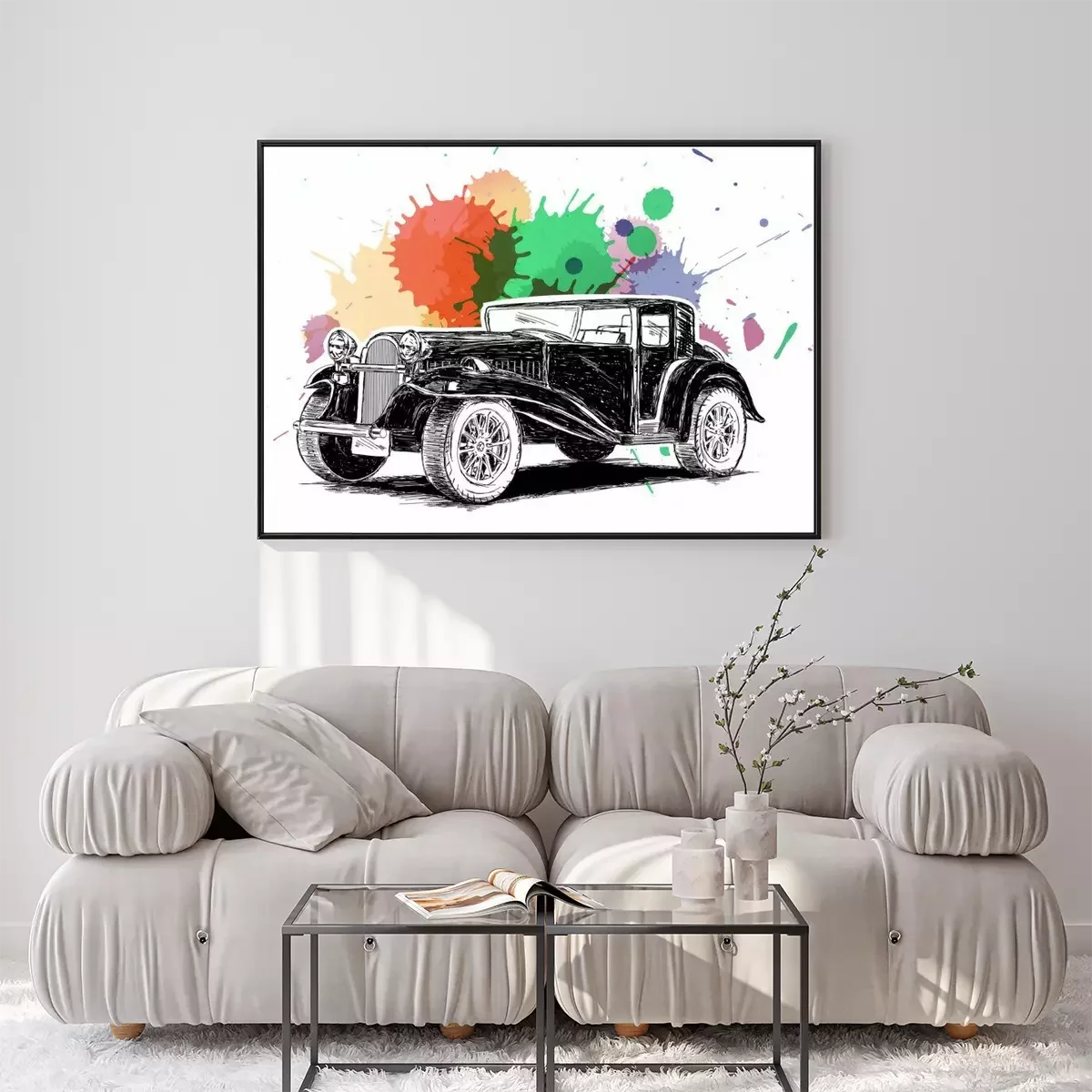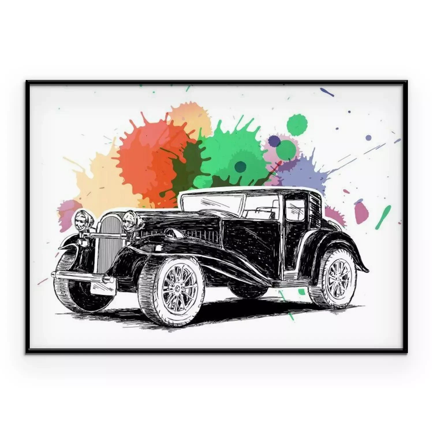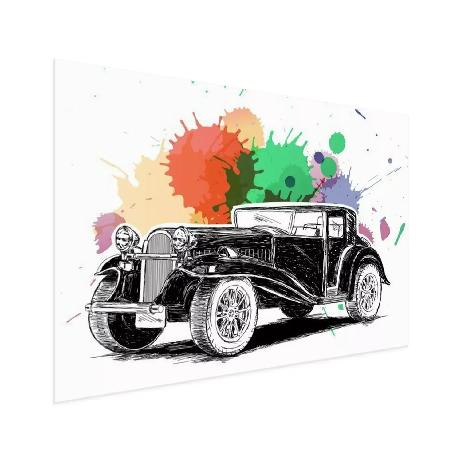 Poster: Vintage Retro Klassieke Oude Auto met kleurrijke inkt spatten Vector I