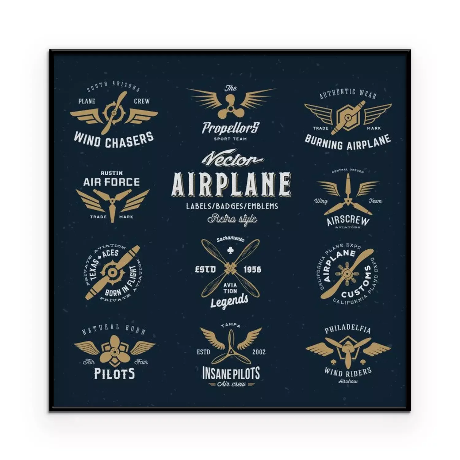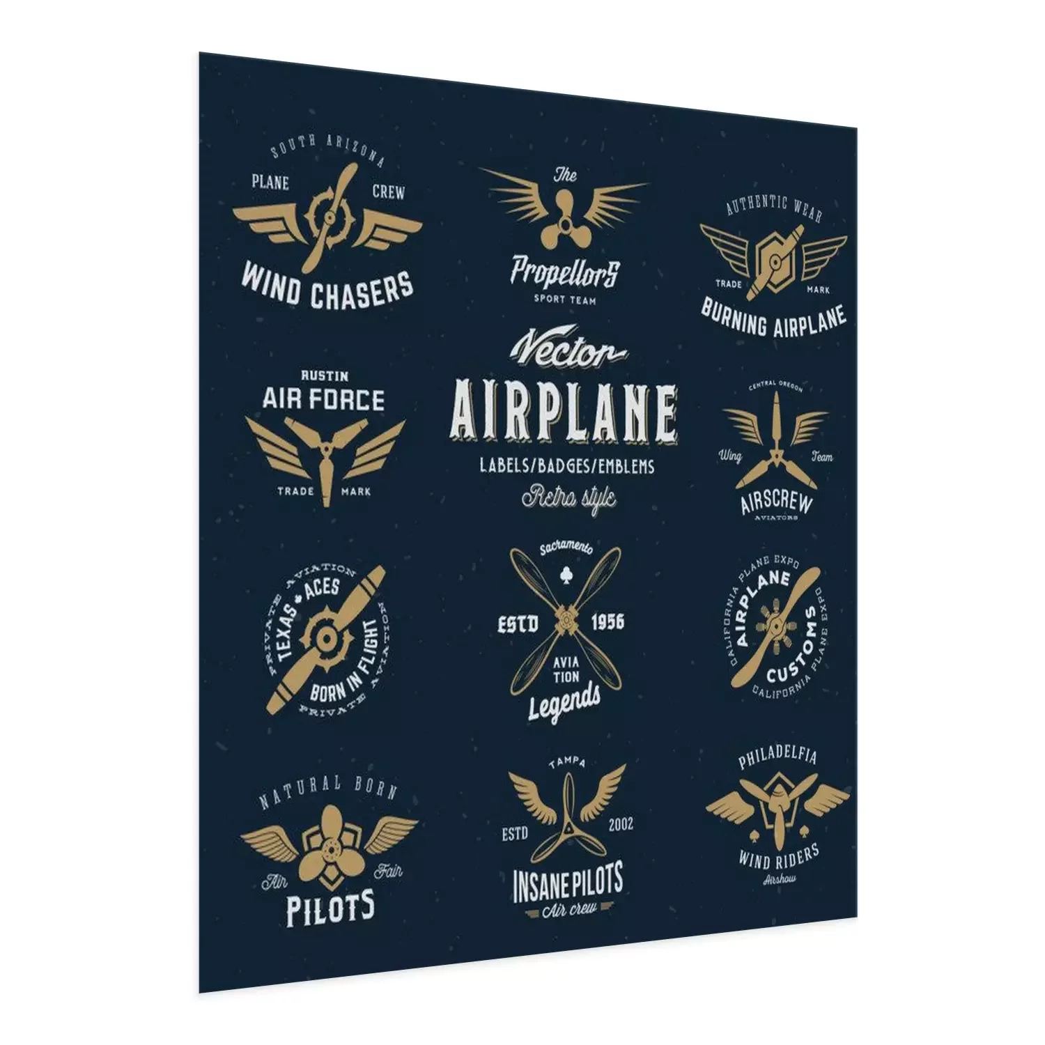 Poster: Vintage Vector Airplane etiketten set met Retro Typografie. Shabby Textuur op blauwe achtergrond