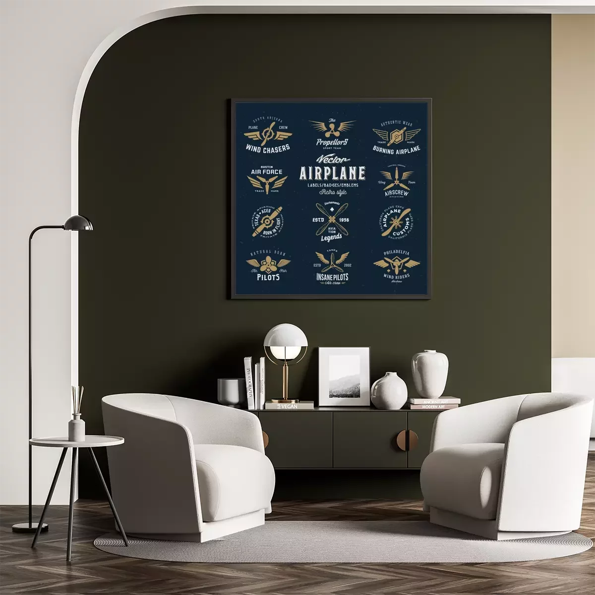 Poster Vintage Vector Airplane etiketten set met Retro Typografie. Shabby Textuur op blauwe achtergrond