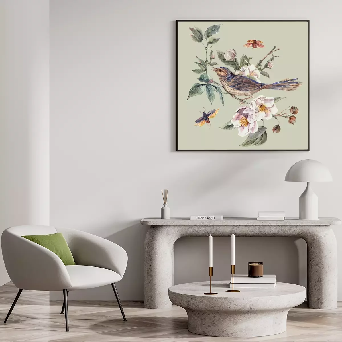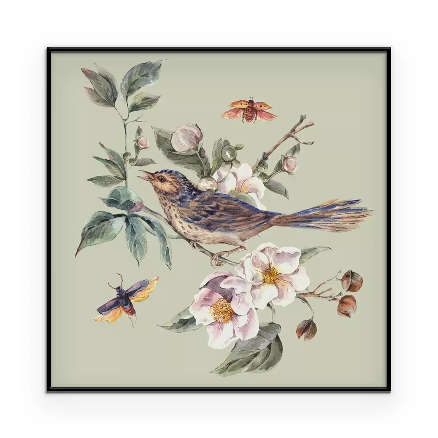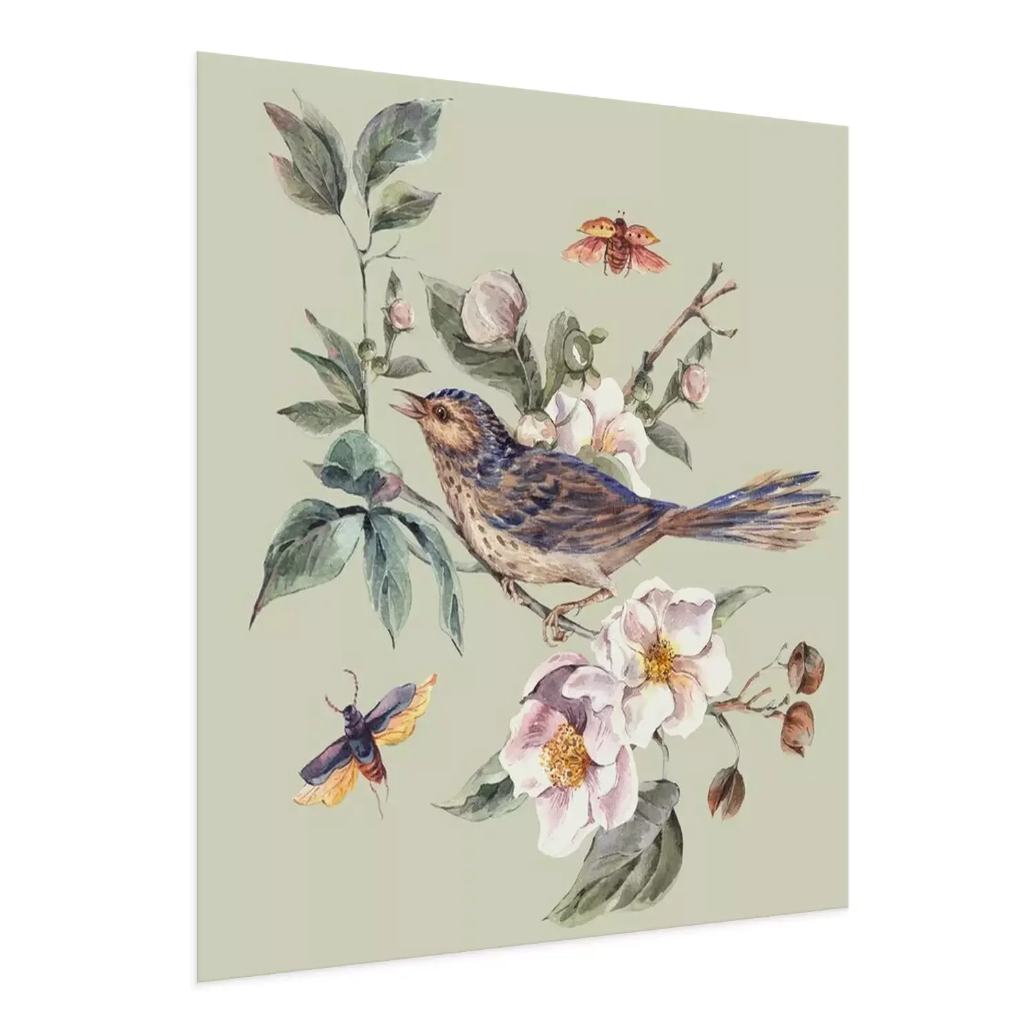 Poster: Vintage wenskaart met bloeiende appelbomen en Vogels