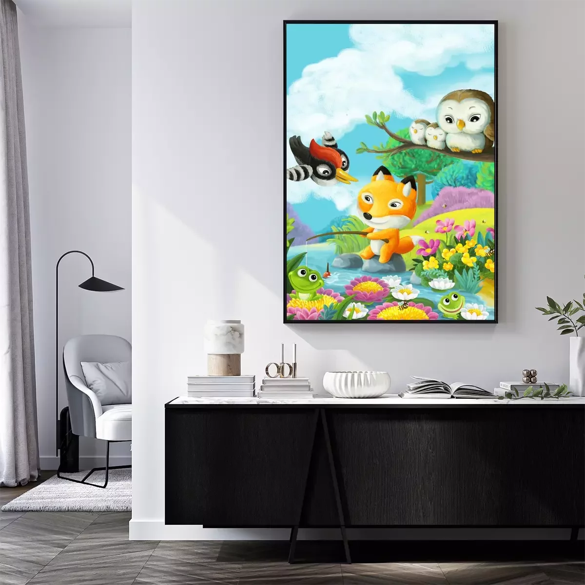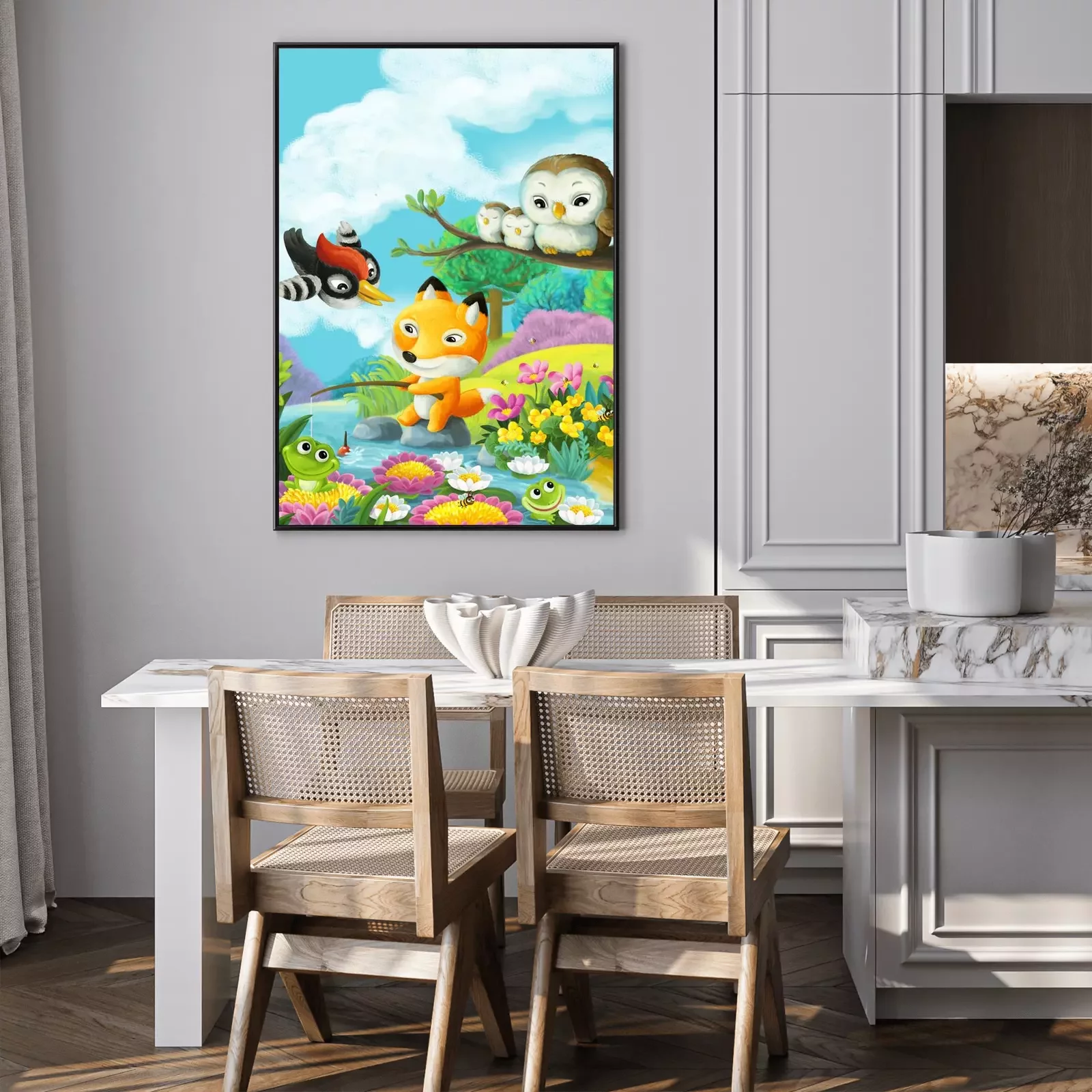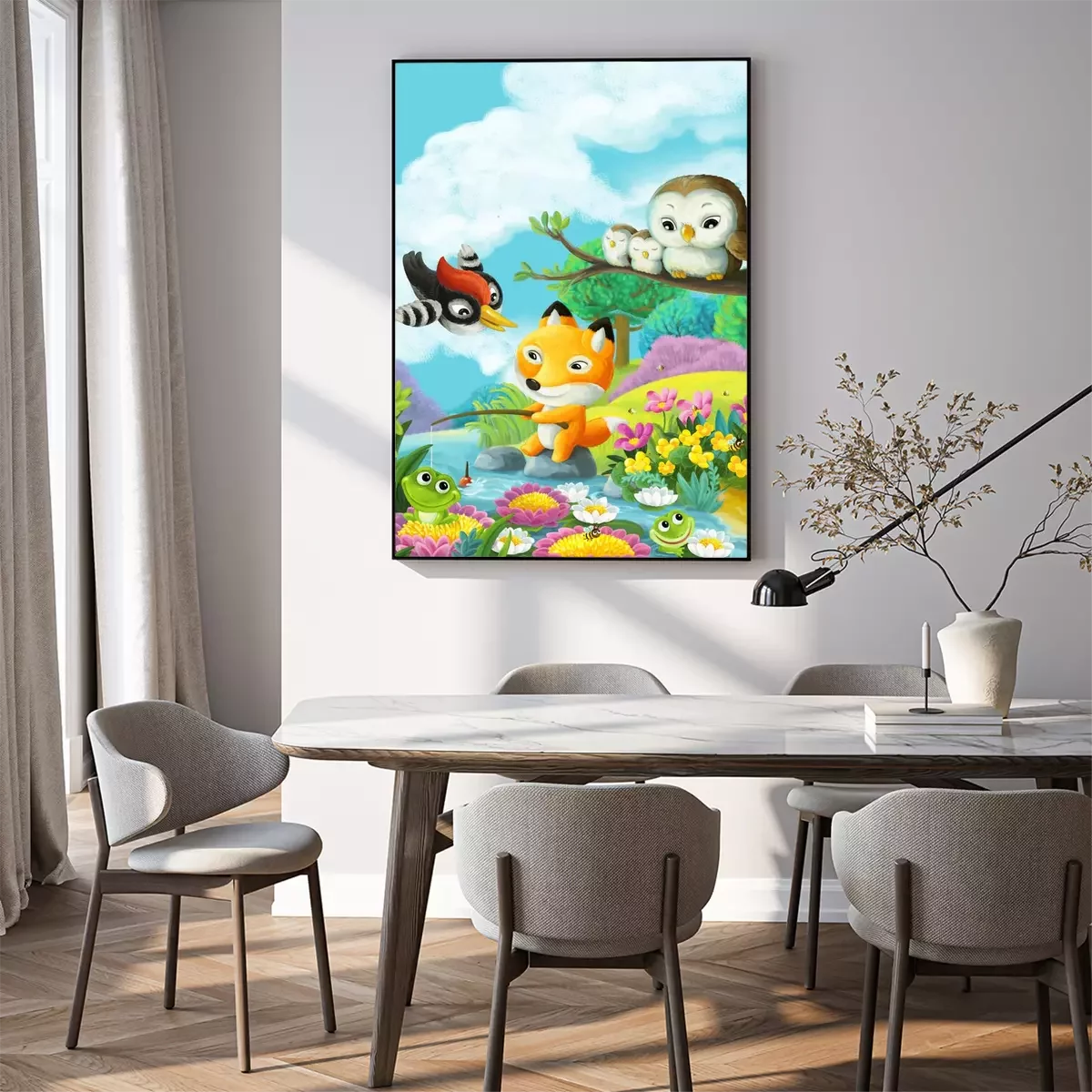 Poster Vissende vos met vrienden bij de rivier