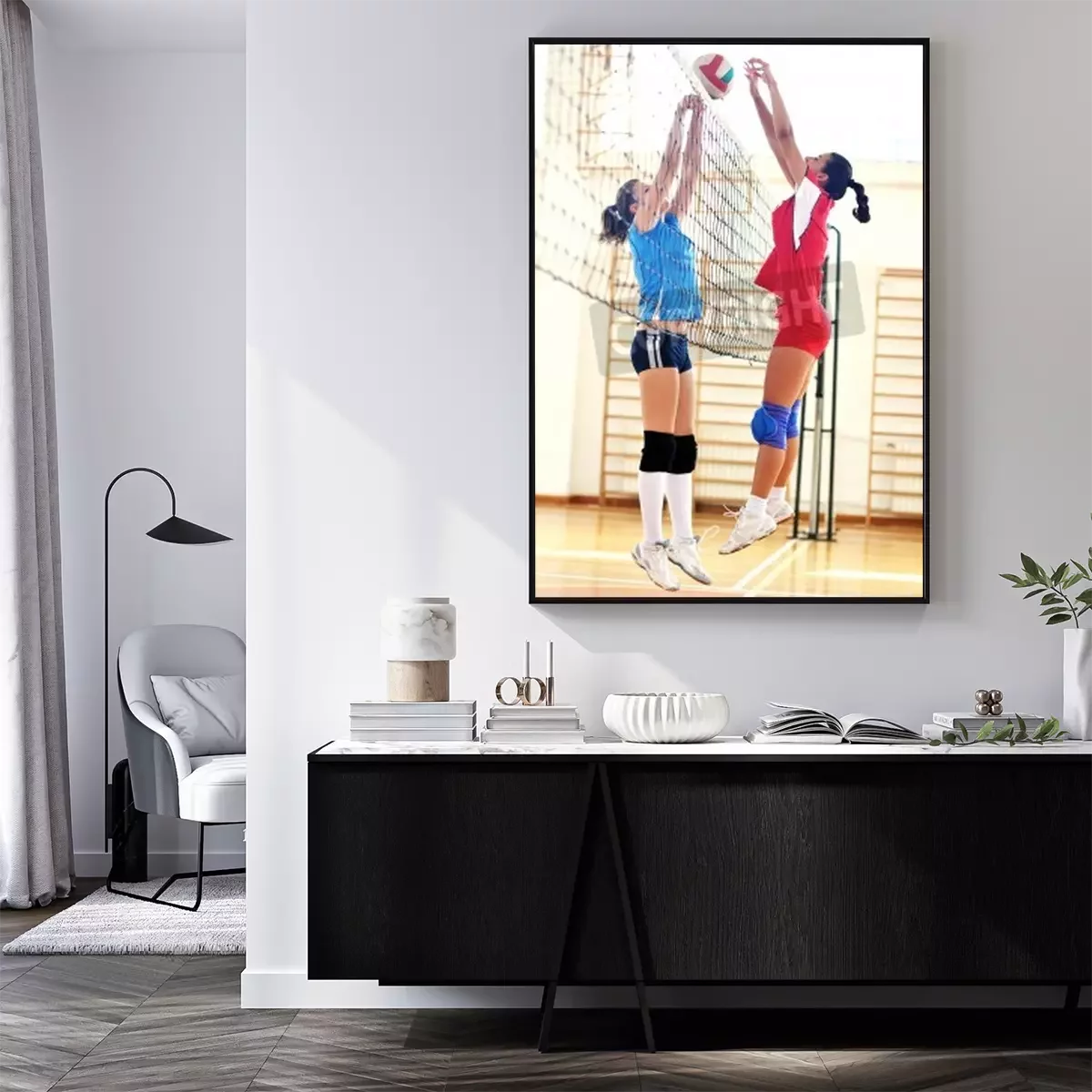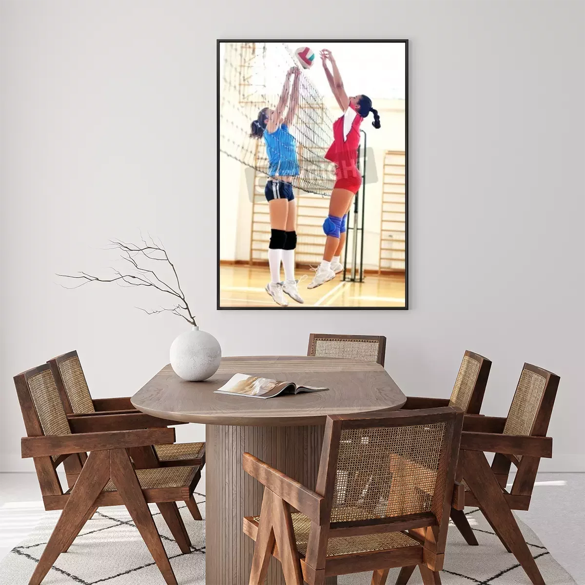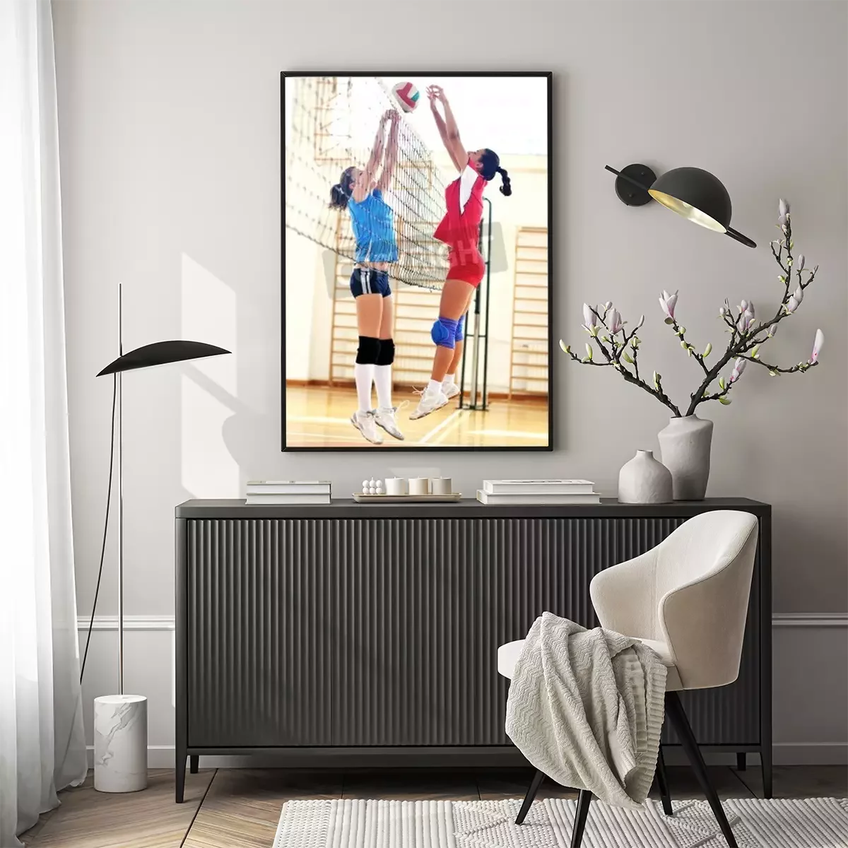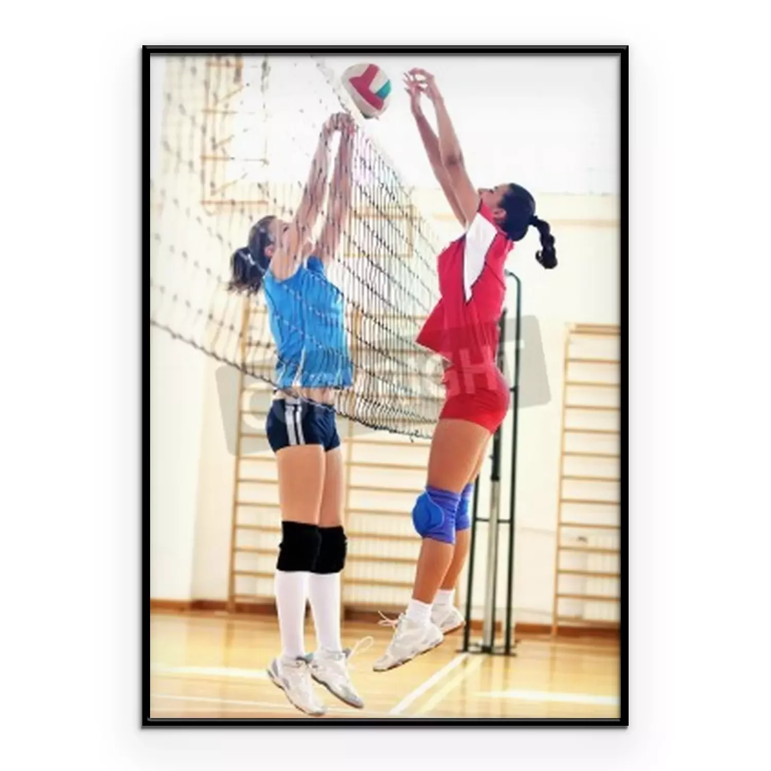 Poster: volleybal spel sport met groep van jonge mooie meisjes binnen in de sport arena