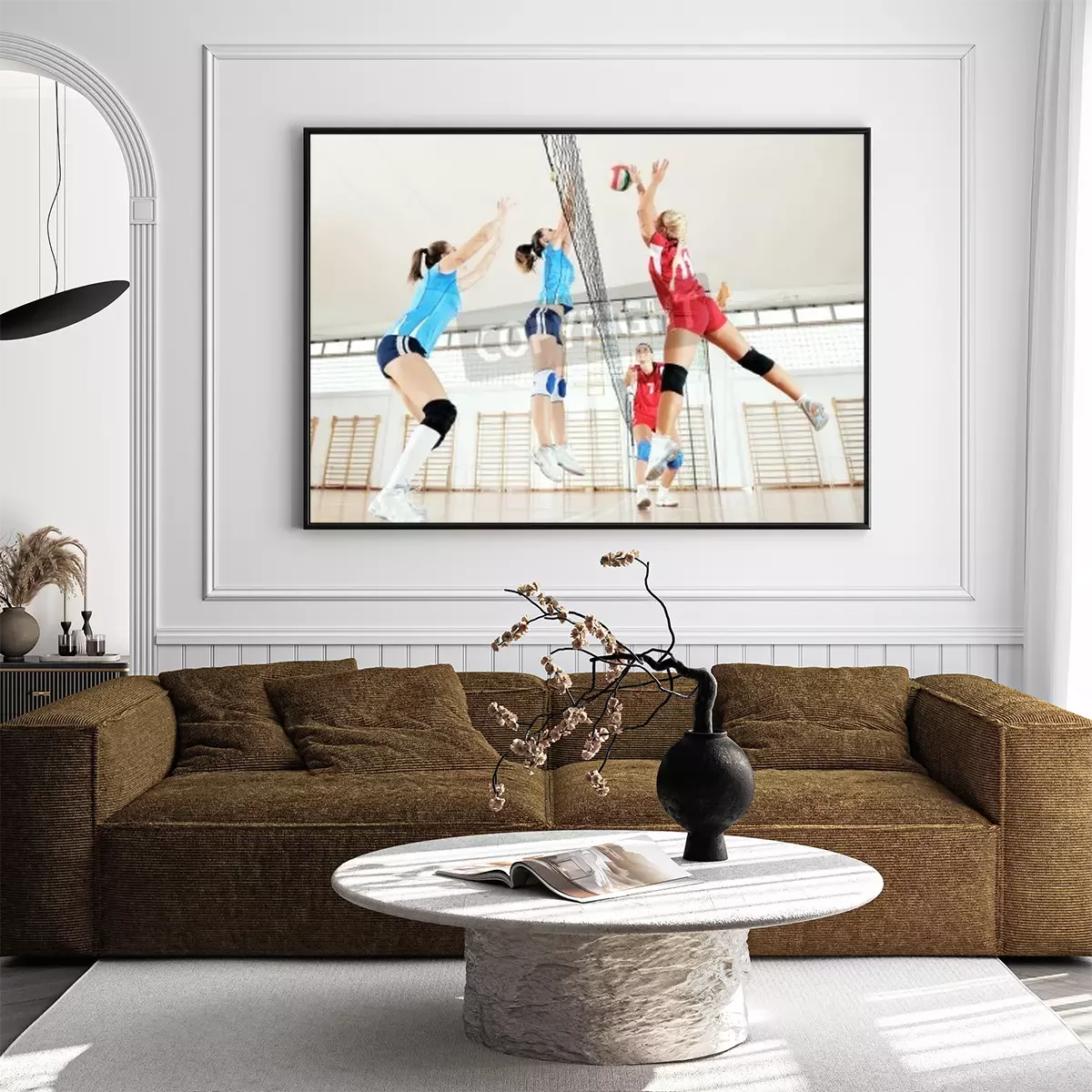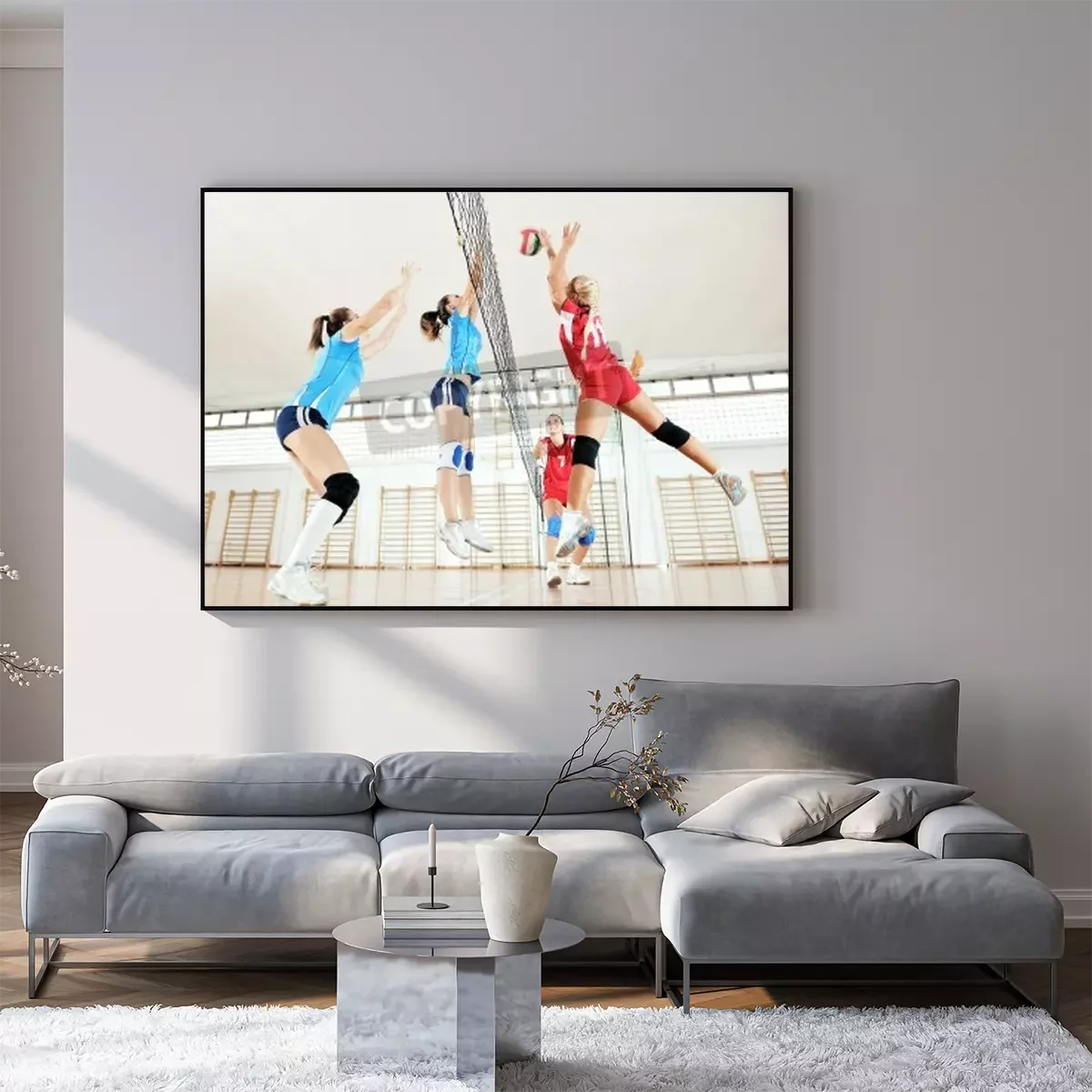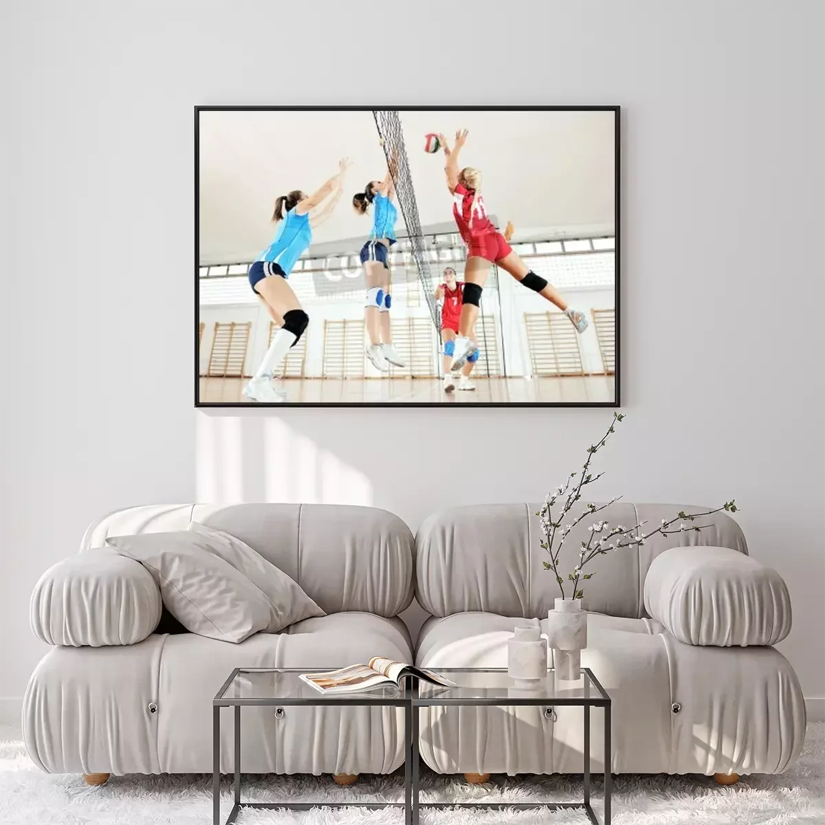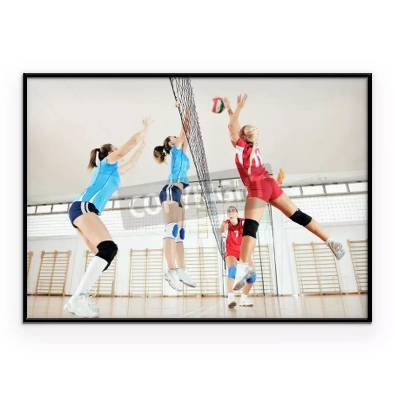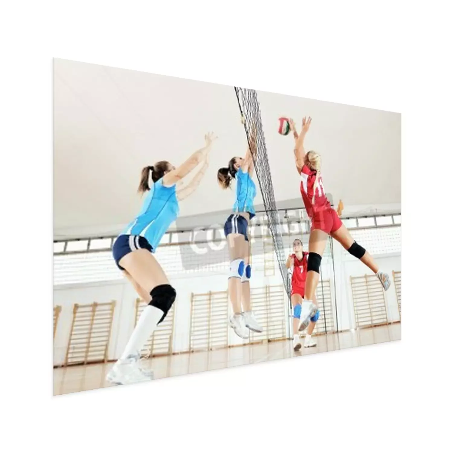 Poster: volleybal spel sport met groep van jonge mooie meisjes binnen in de sport arena