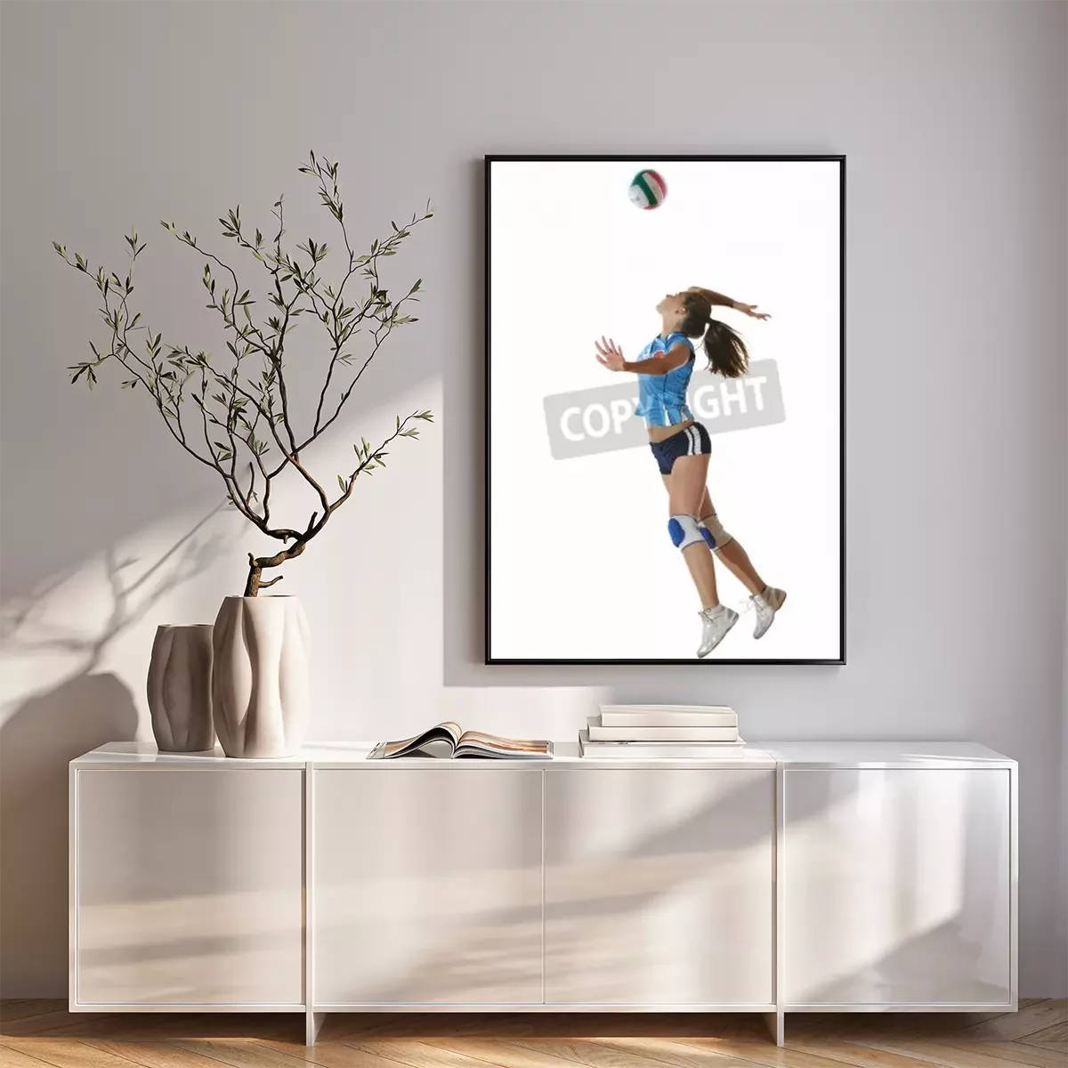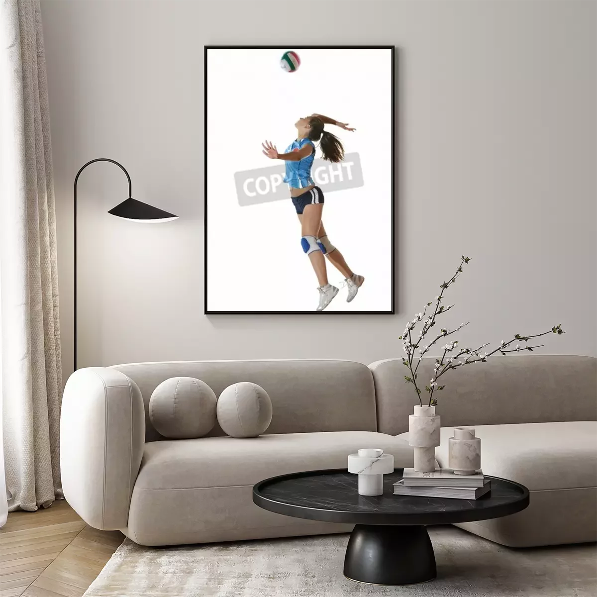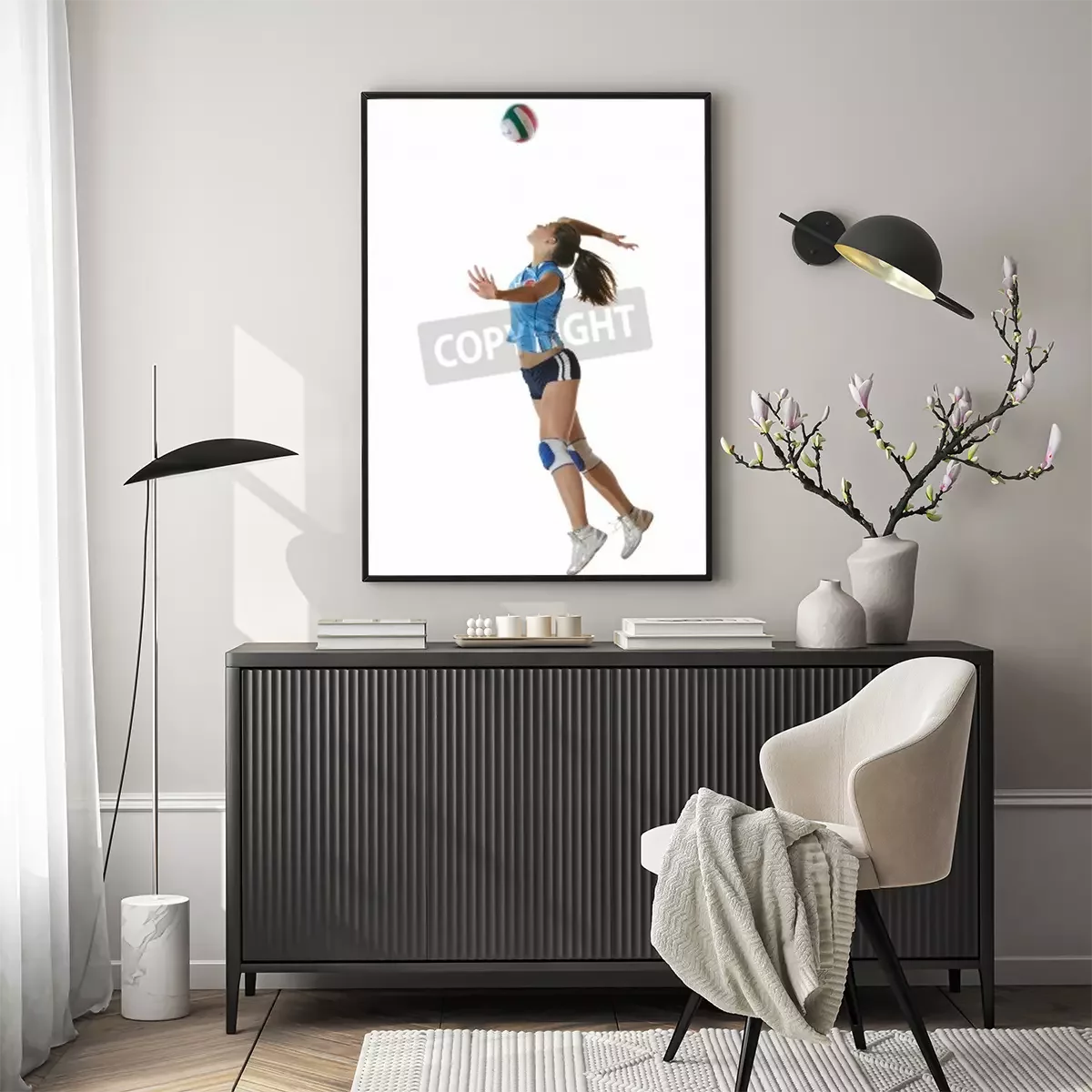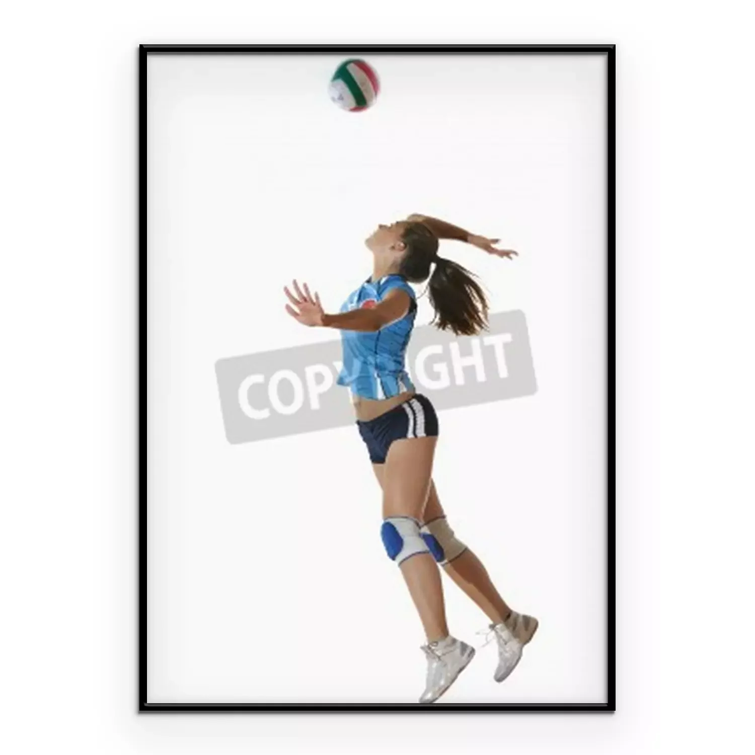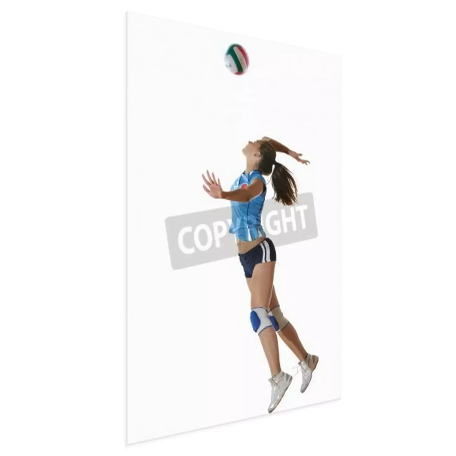 Poster: volleybal spel sport met neautoful jong meisje oslated onver witte achtergrond