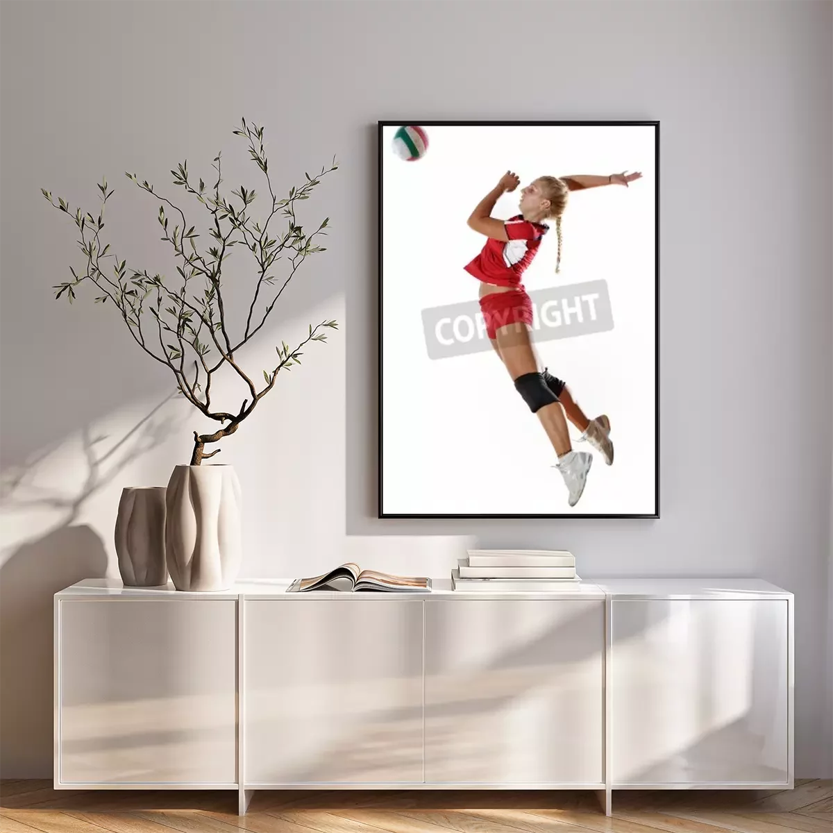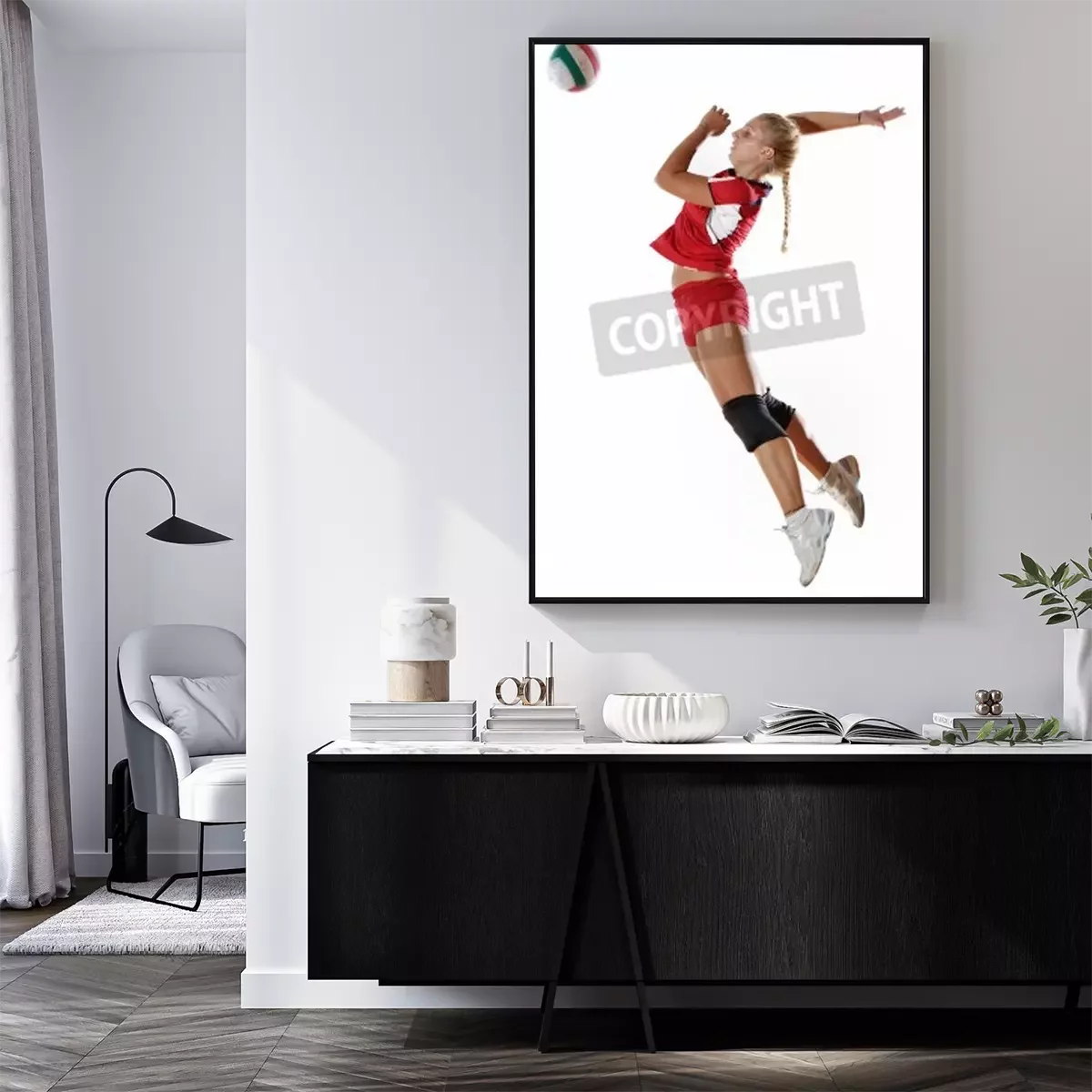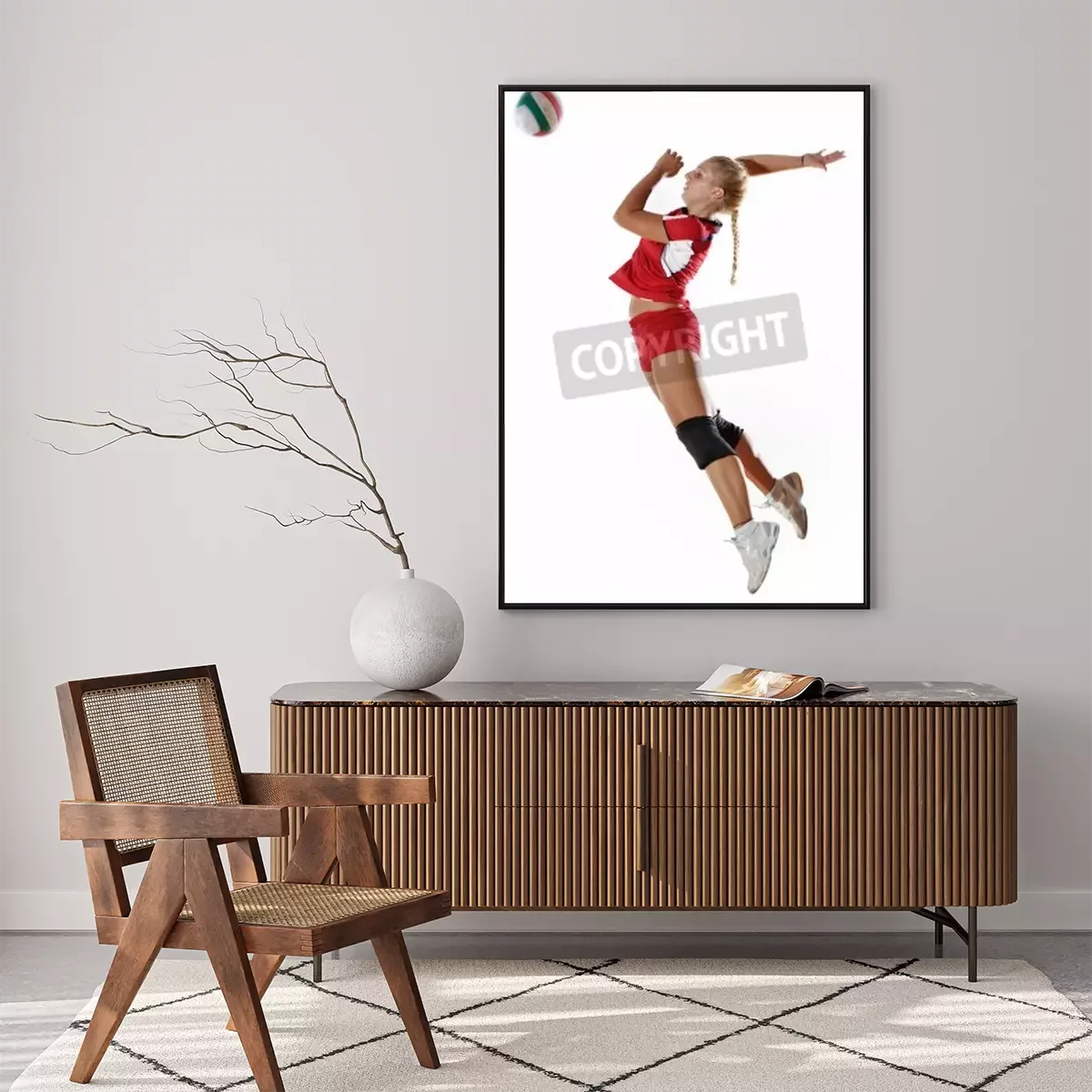 Poster: volleybal spel sport met neautoful jong meisje oslated onver witte achtergrond