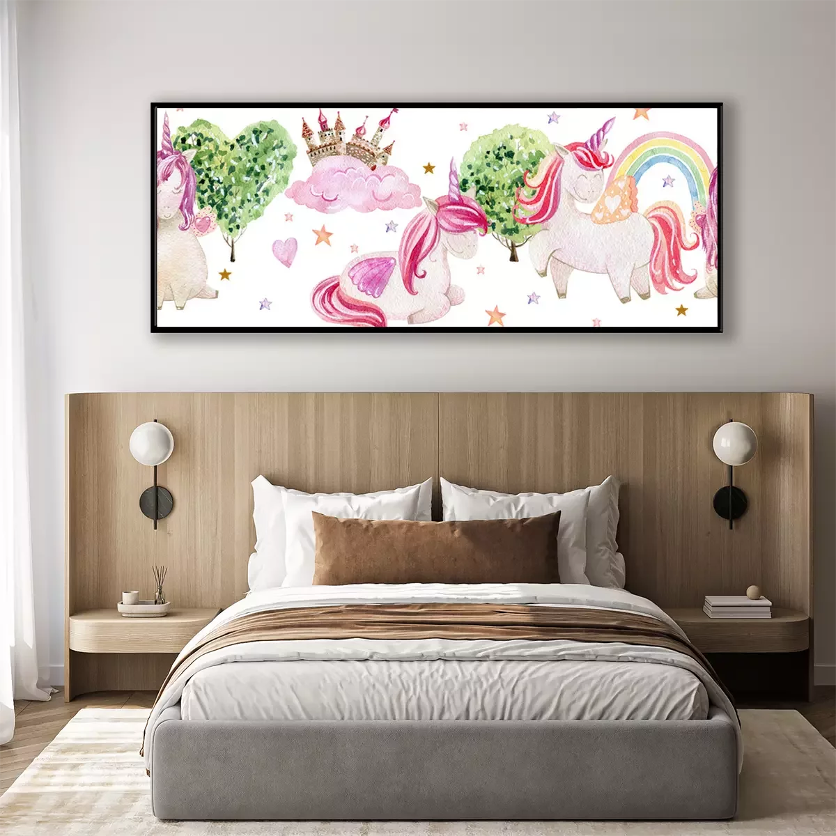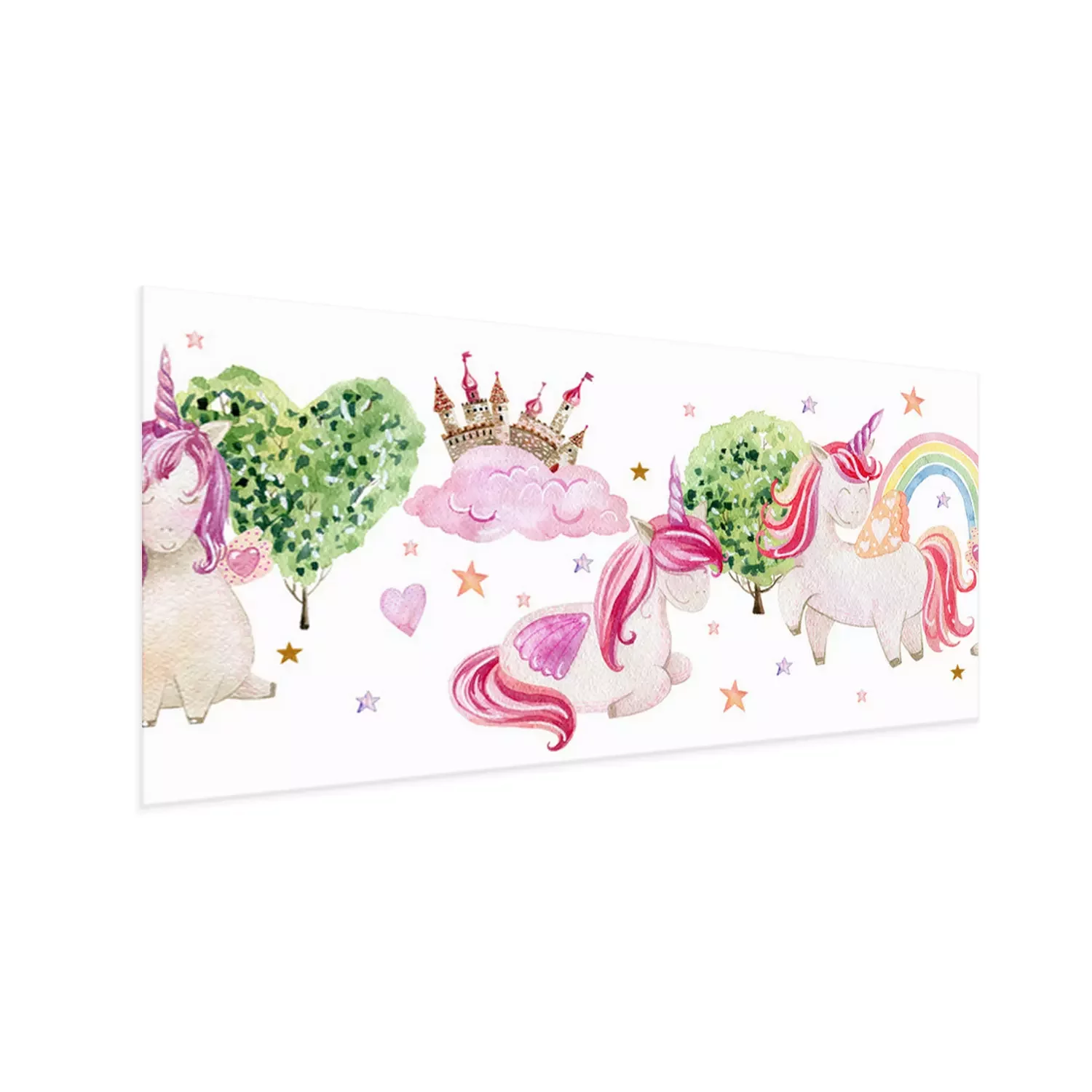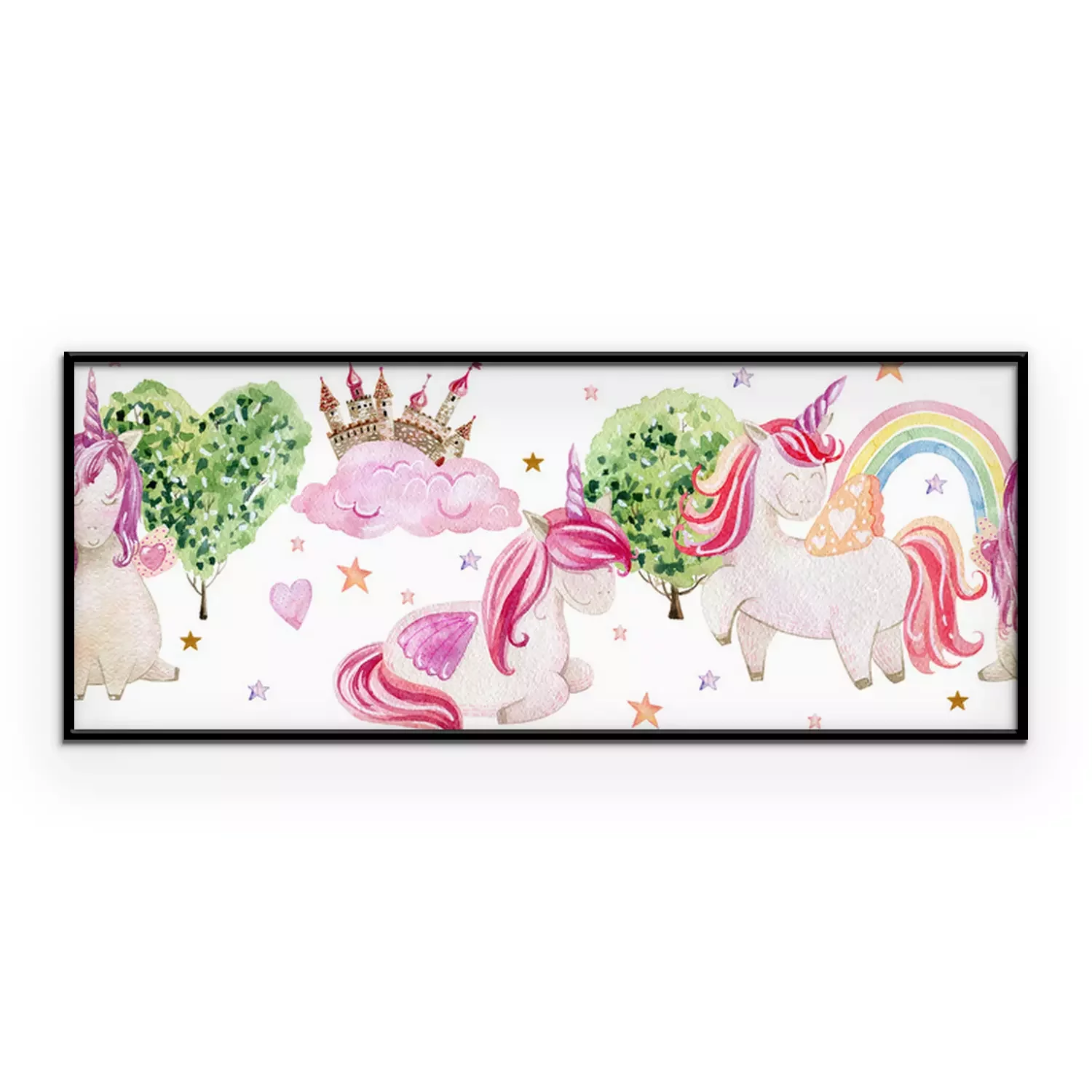 Poster: Vrolijke eenhoorns en een kasteel op de achtergrond