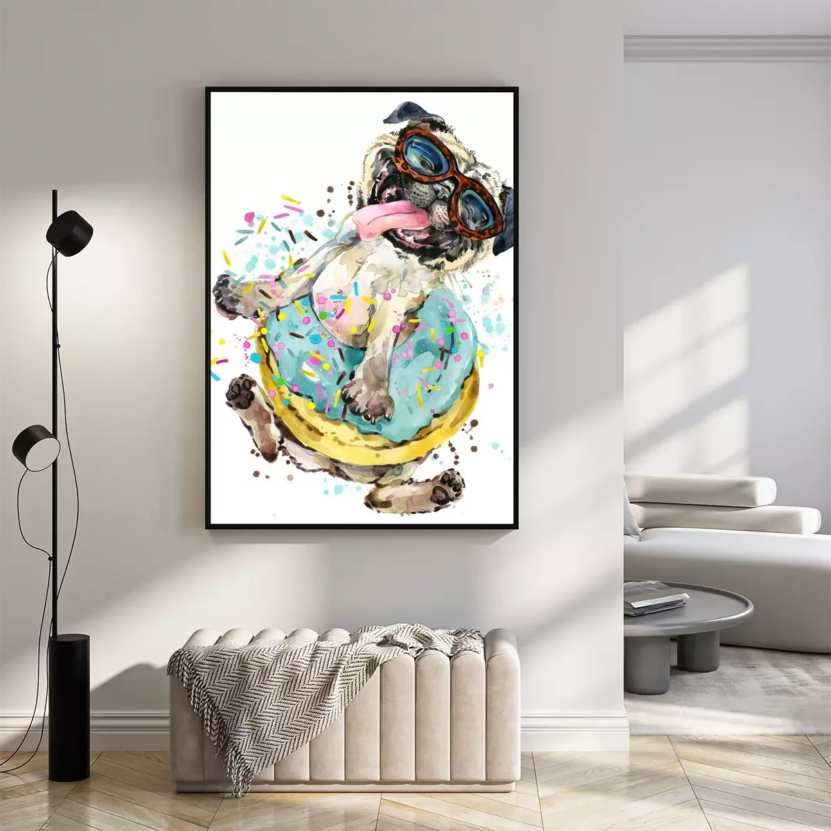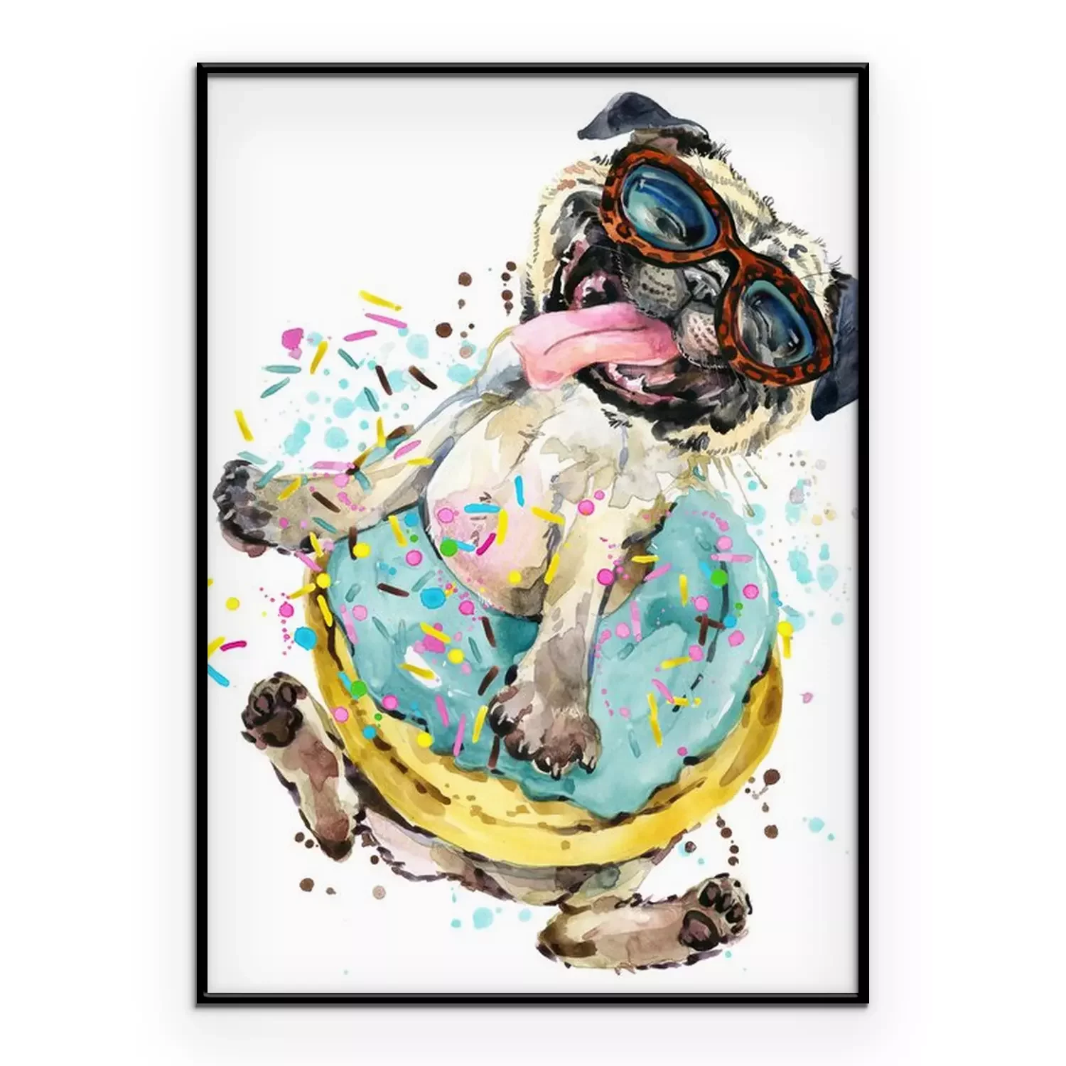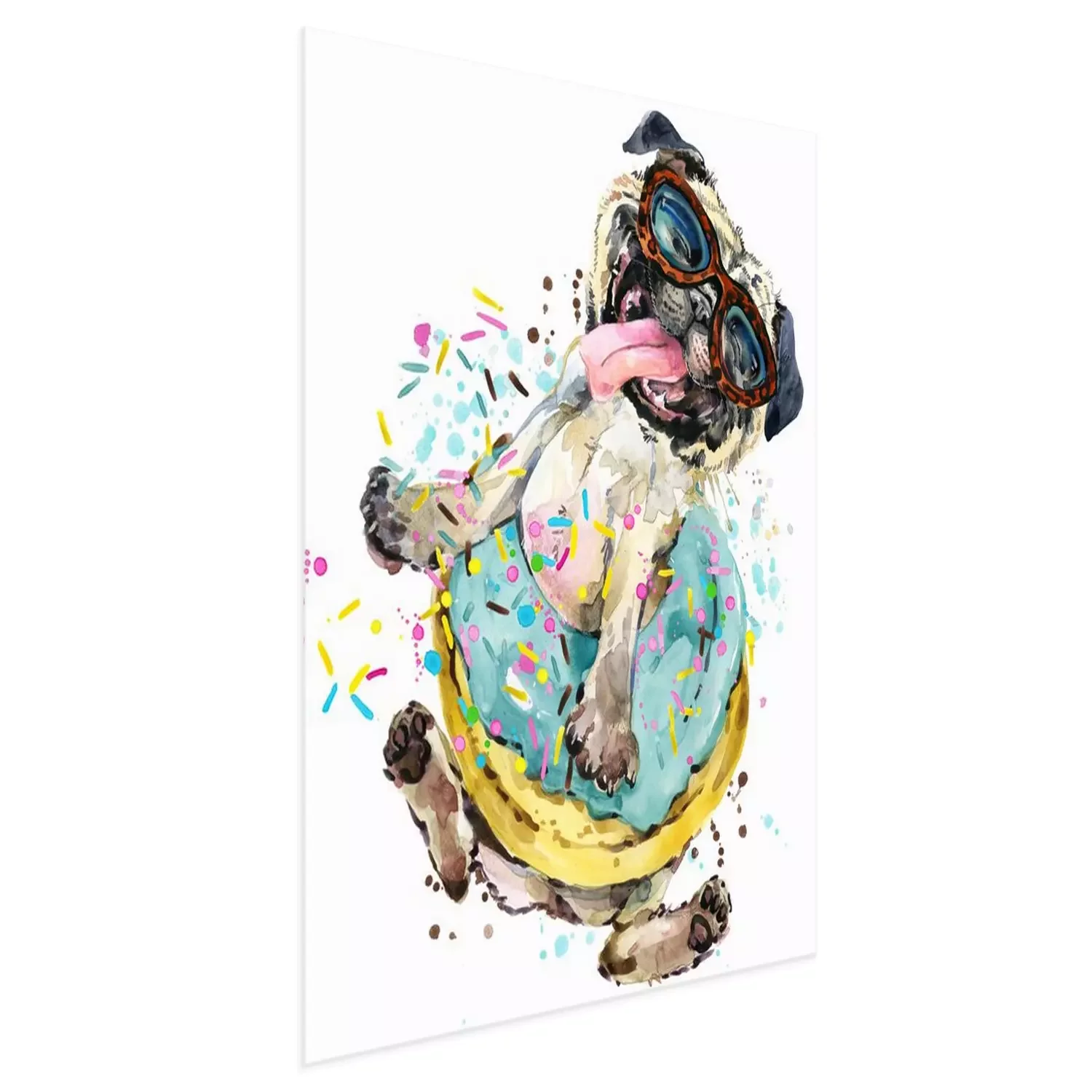 Poster: Vrolijke hond met bril in een donut