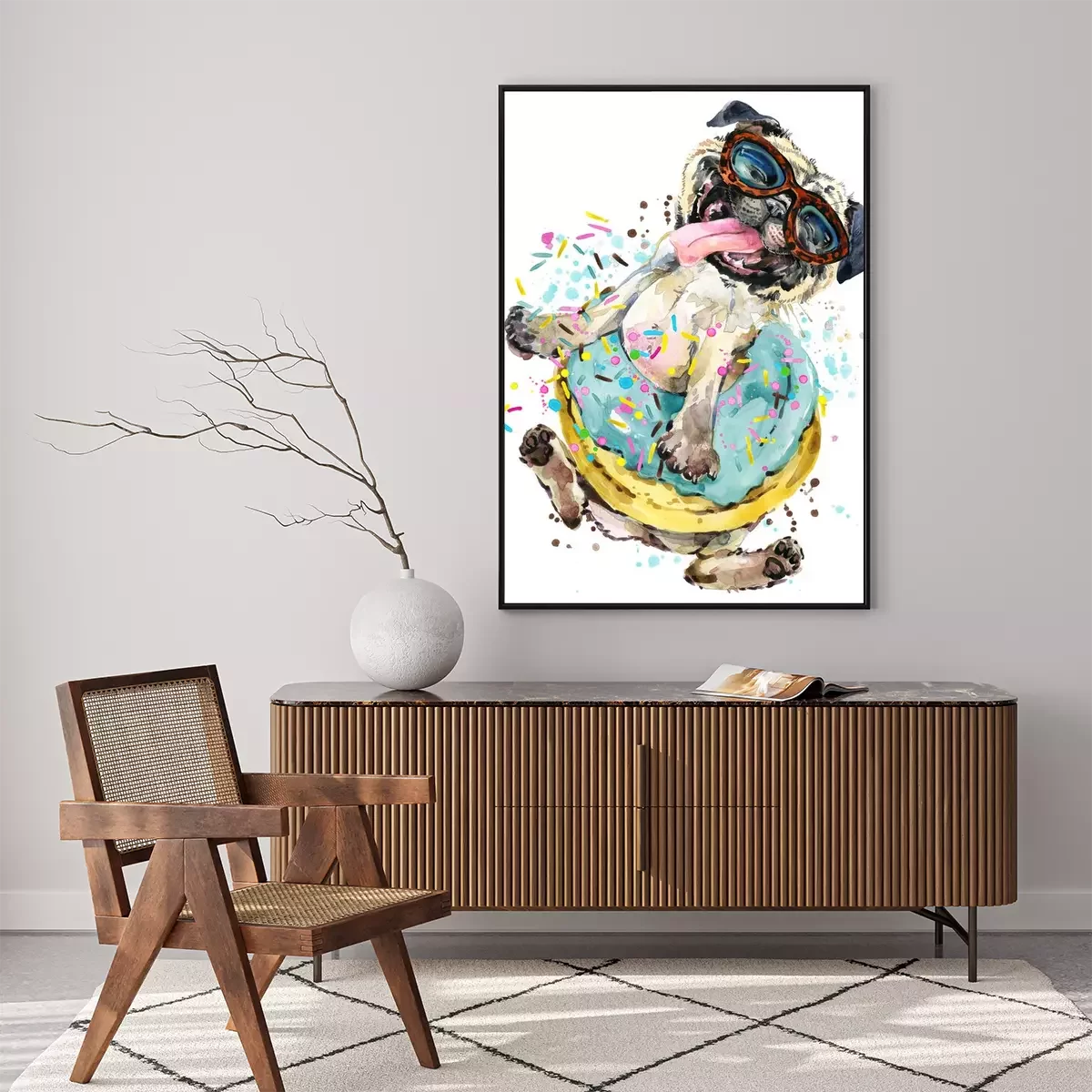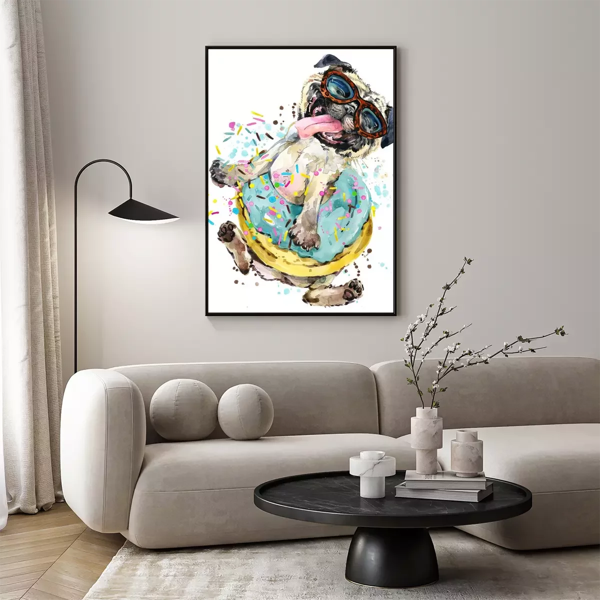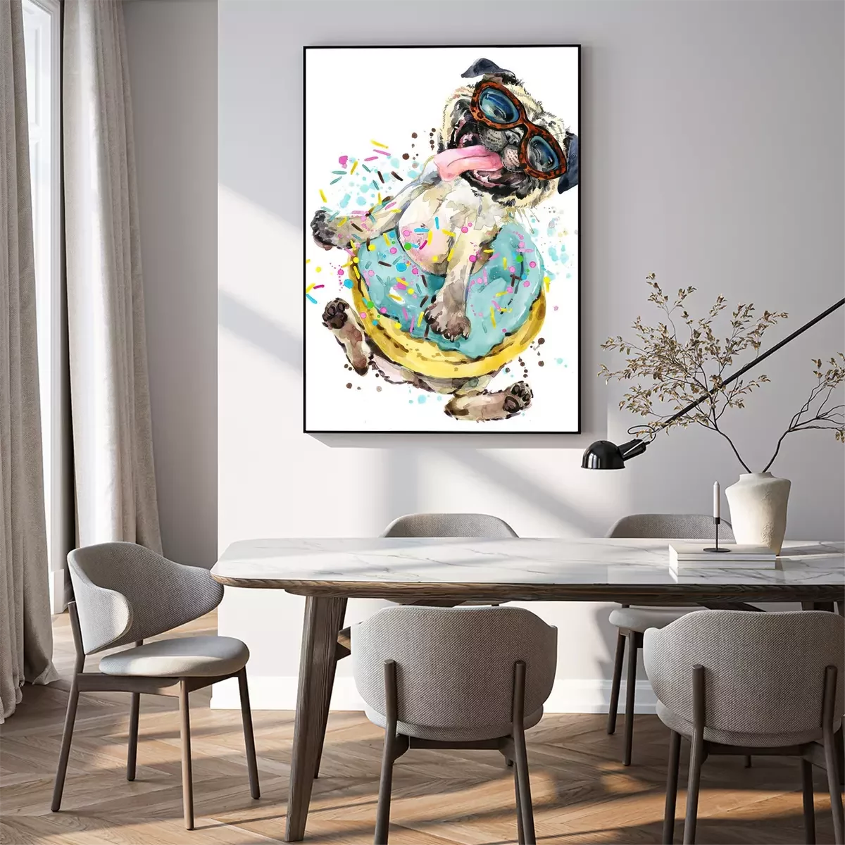 Poster: Vrolijke hond met bril in een donut