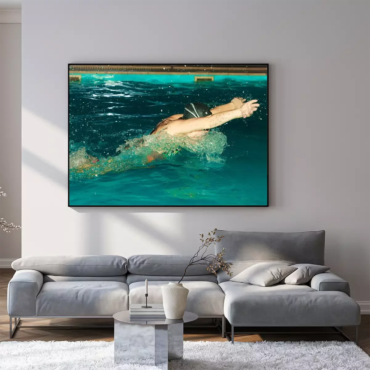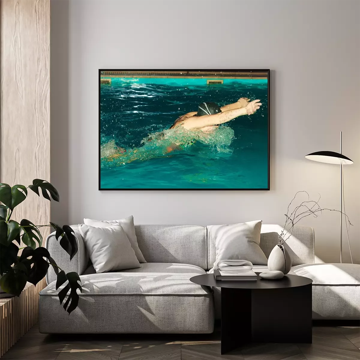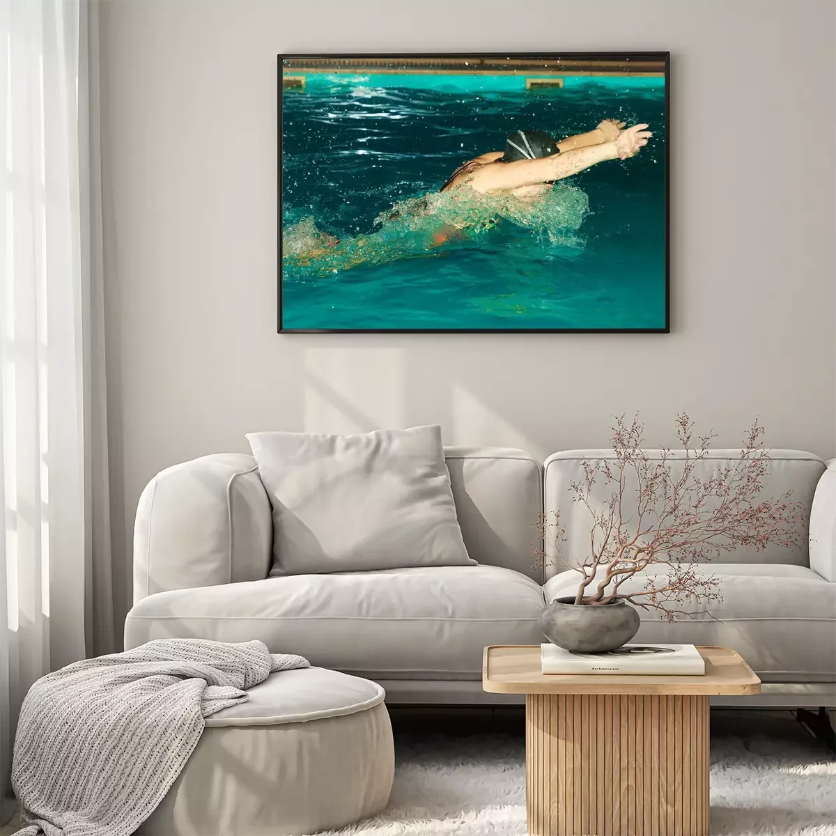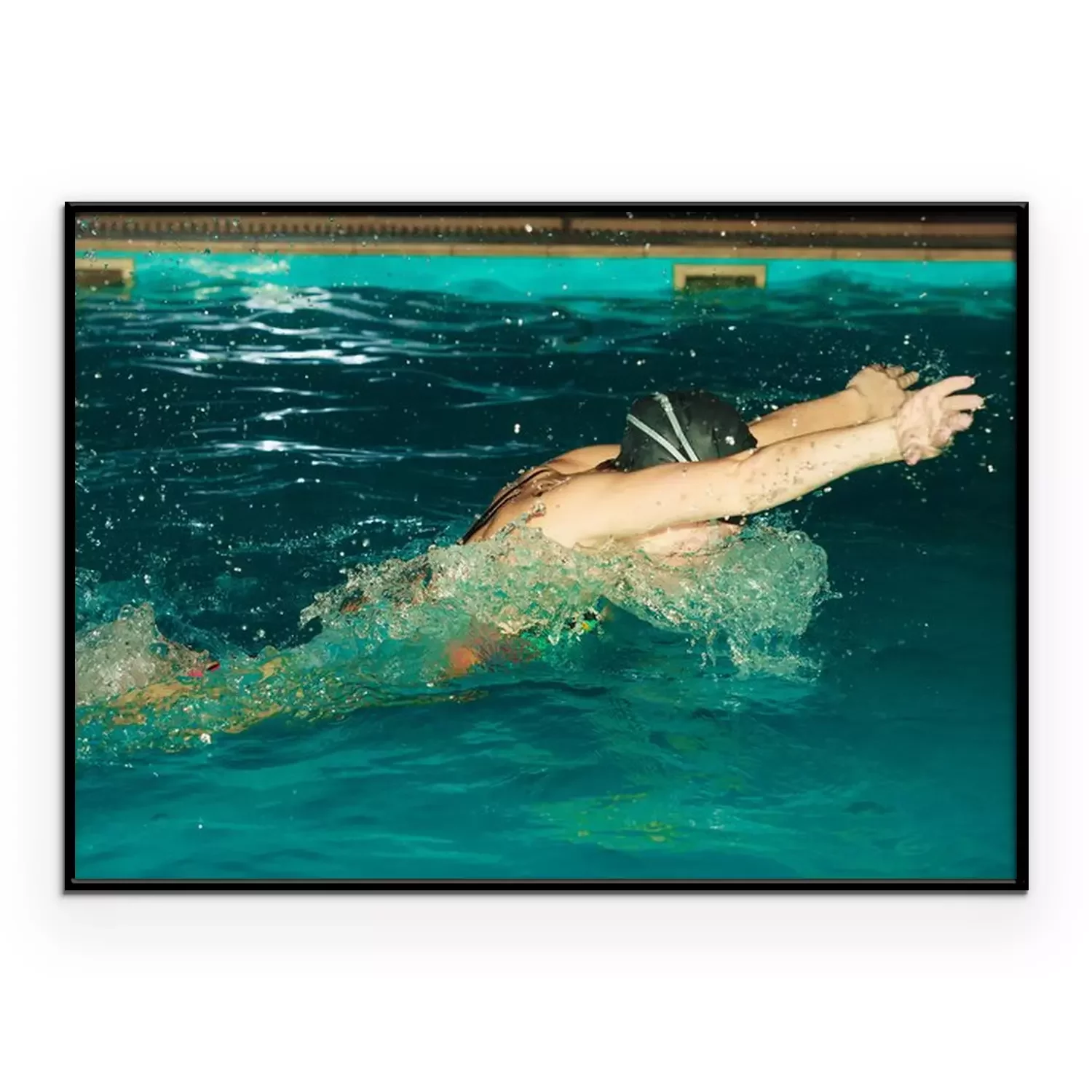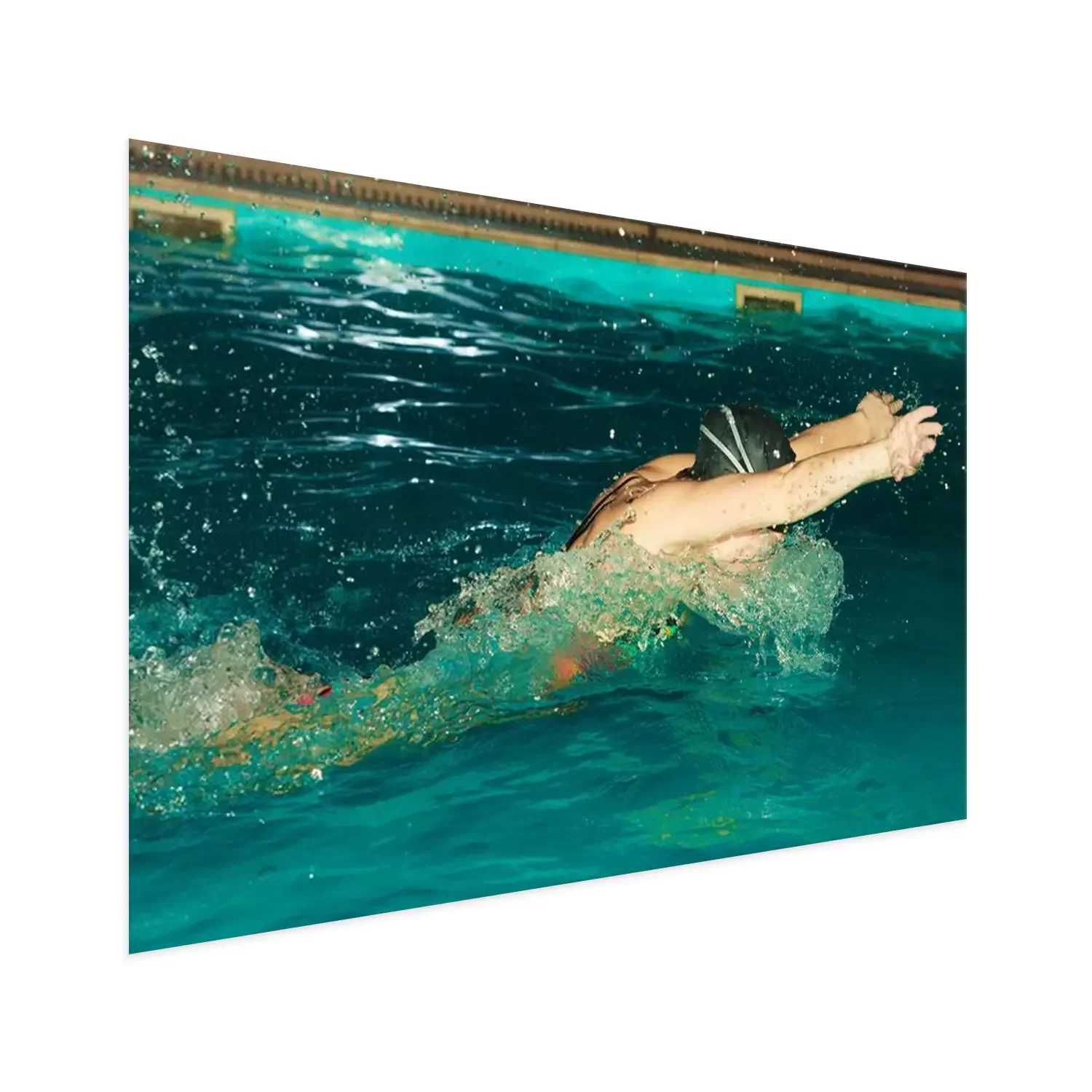 Poster: Vrouw atleet zwemmen vlinderslag in het zwembad.