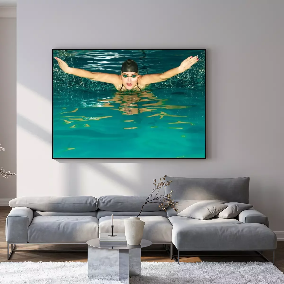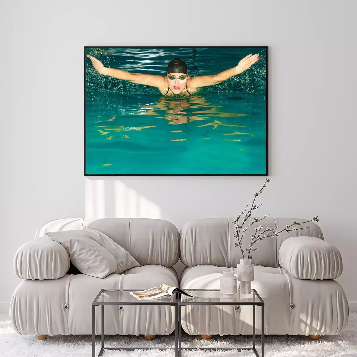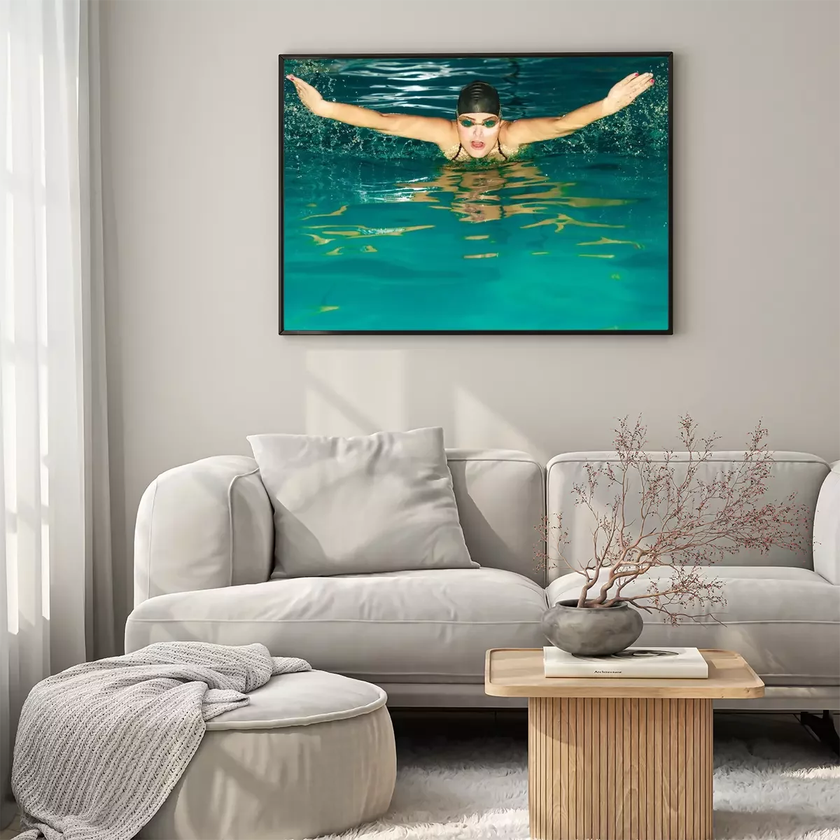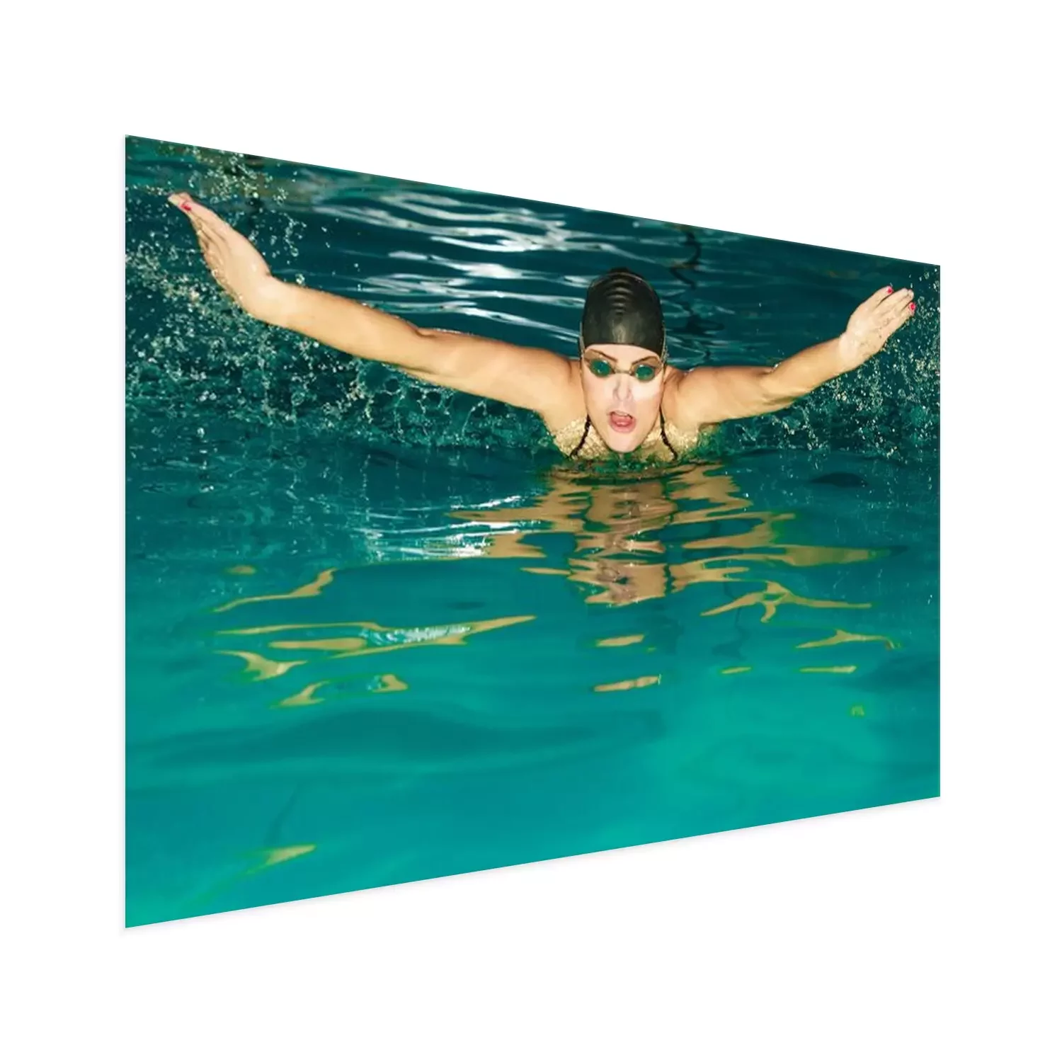 Poster: Vrouw atleet zwemmen vlinderslag in het zwembad.