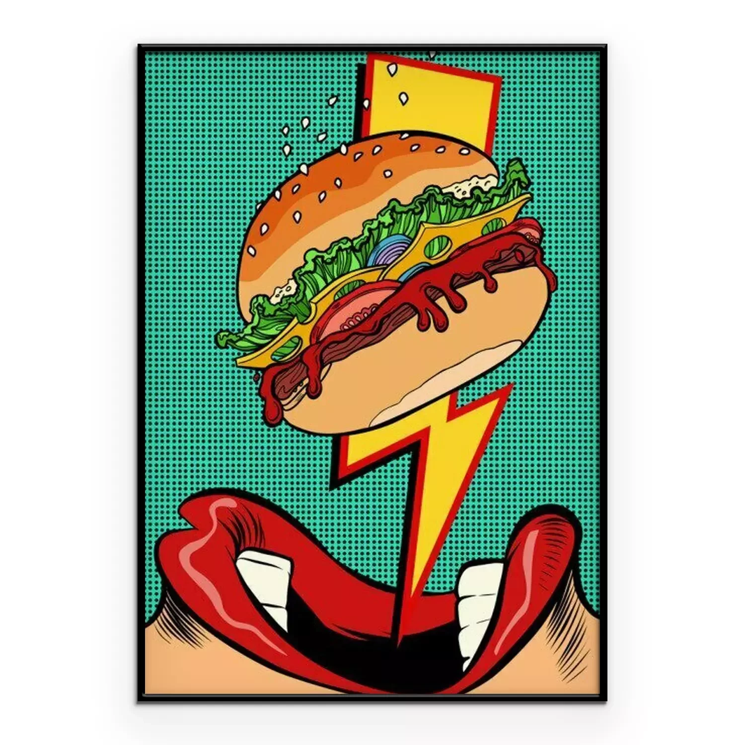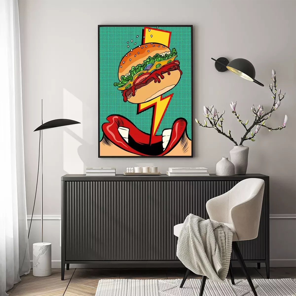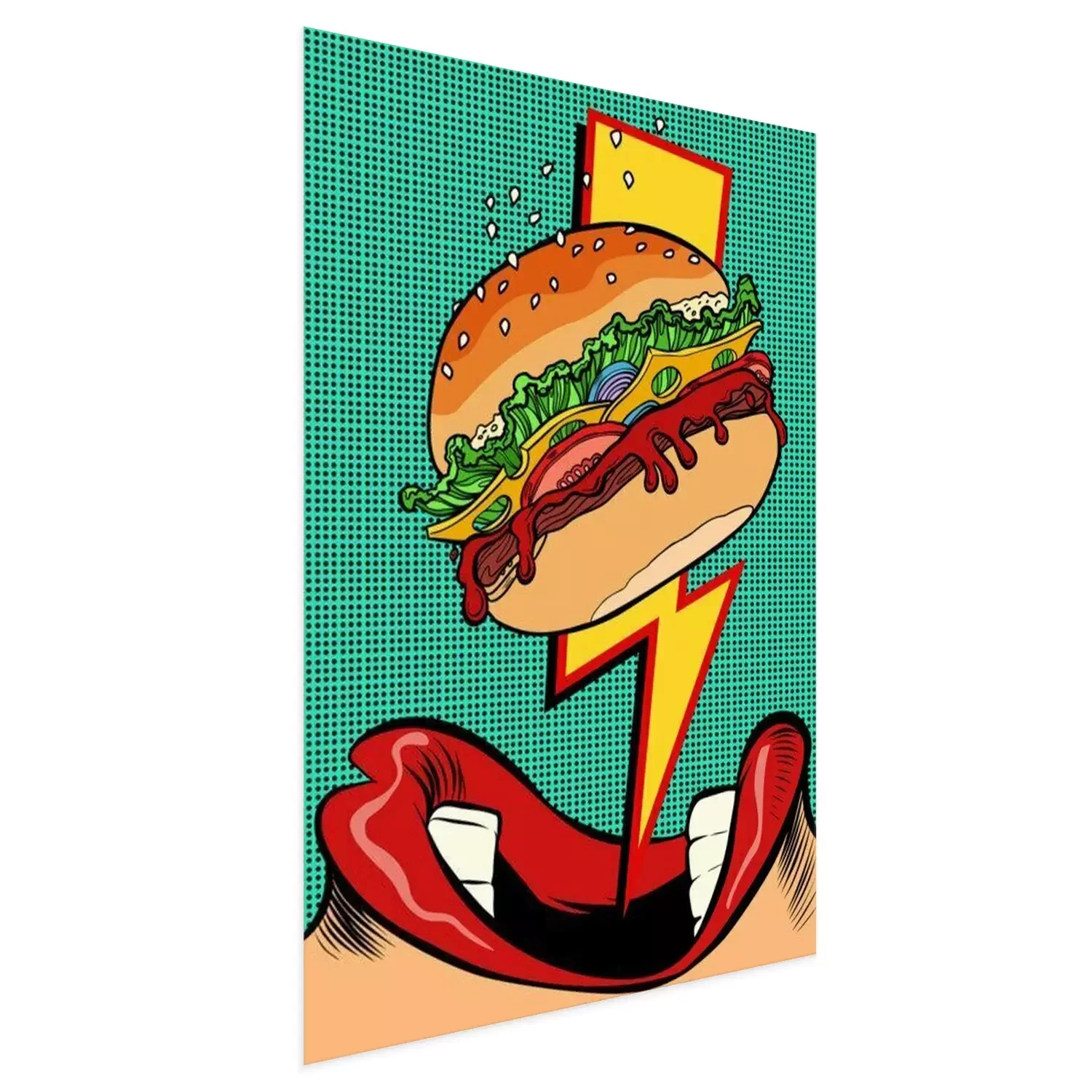 Poster Vrouw die Hamburger eet. Pop-art stijl. Vrouwelijke mond