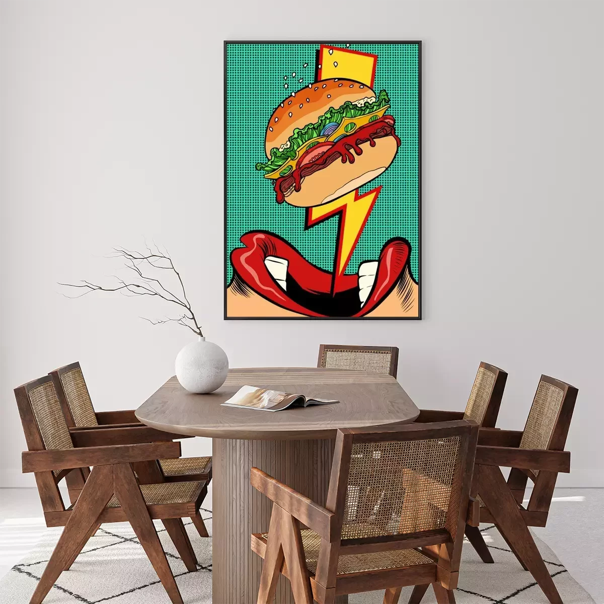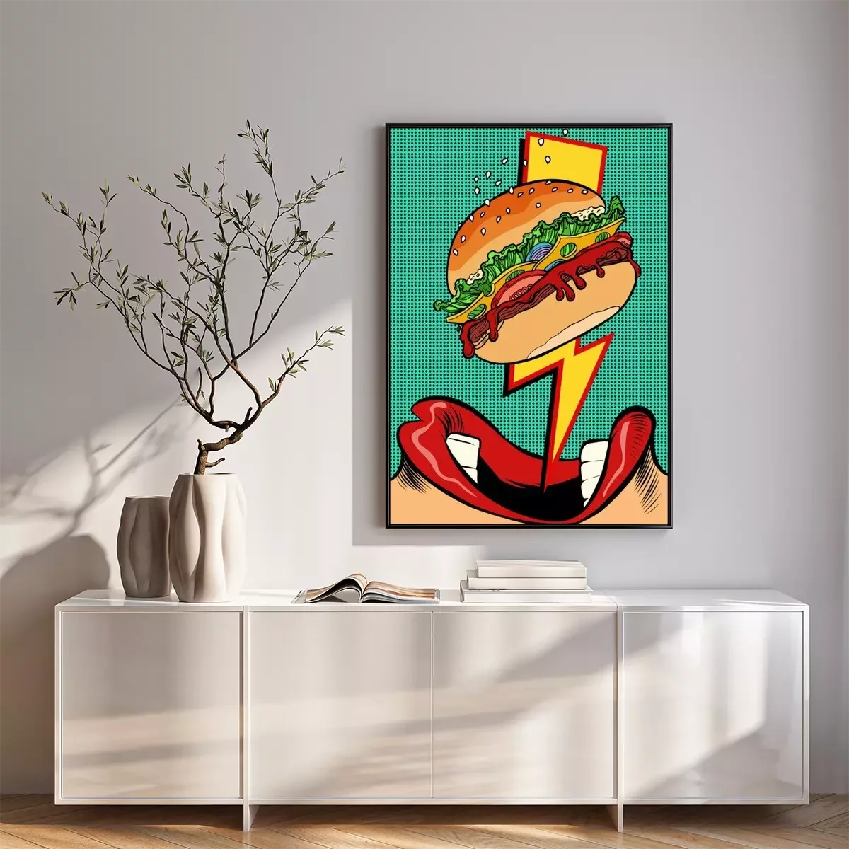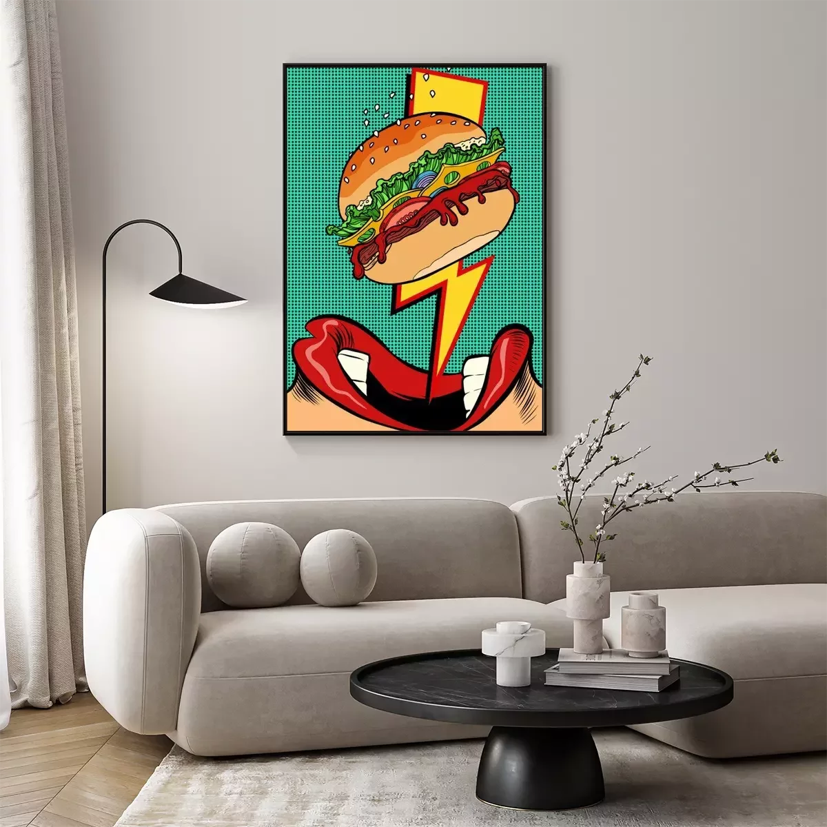 Poster Vrouw die Hamburger eet. Pop-art stijl. Vrouwelijke mond