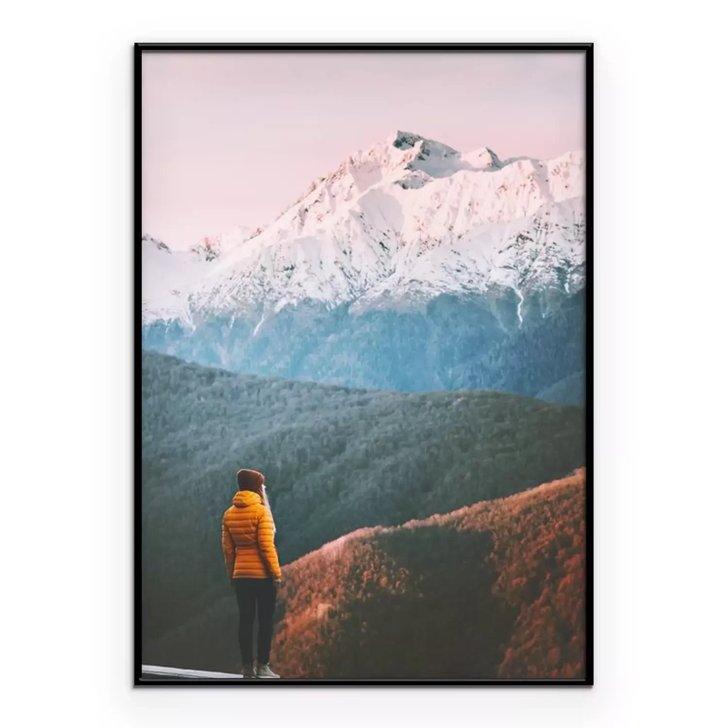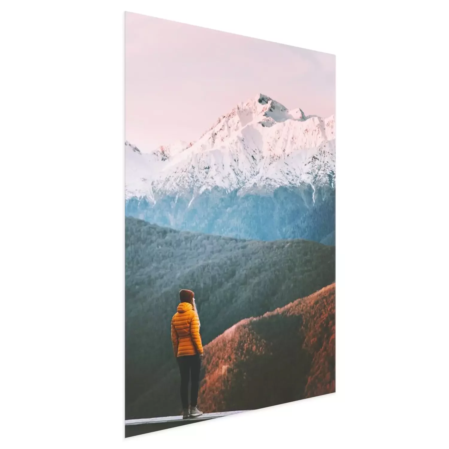 Poster Vrouw die van de de reislevensstijl van het bergenavontuur de vakanties van de de winterwinter openlucht onderzoeken alleen