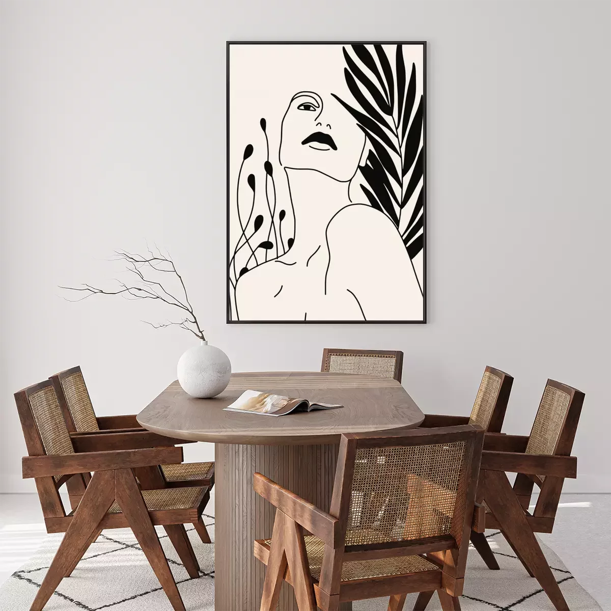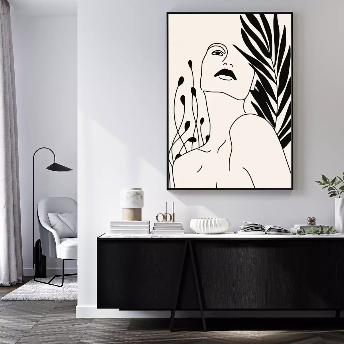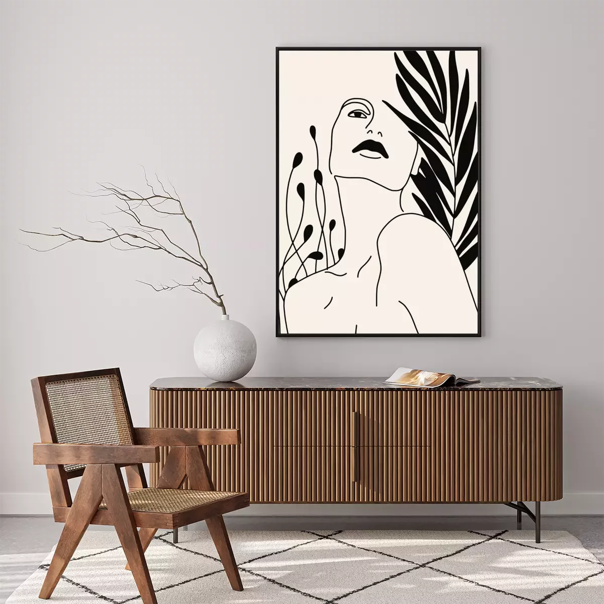 Poster: Vrouw en bladeren minimalistische afbeelding in zwart