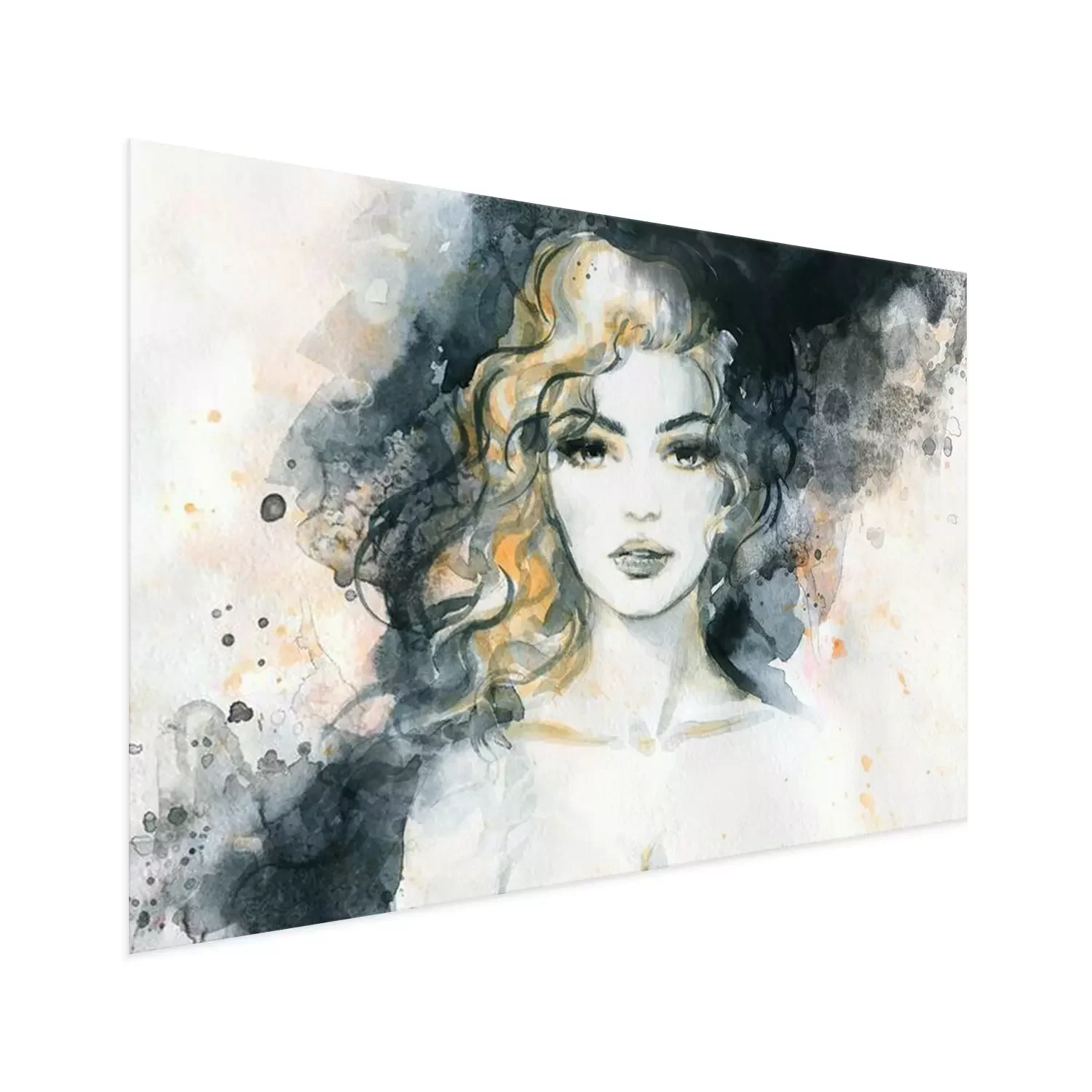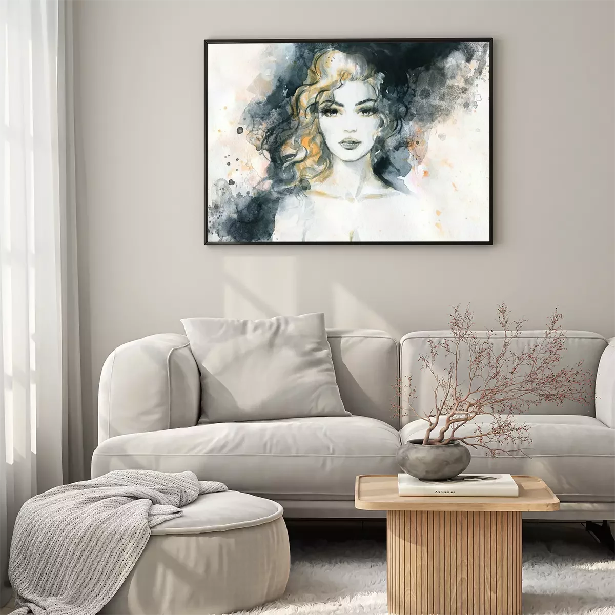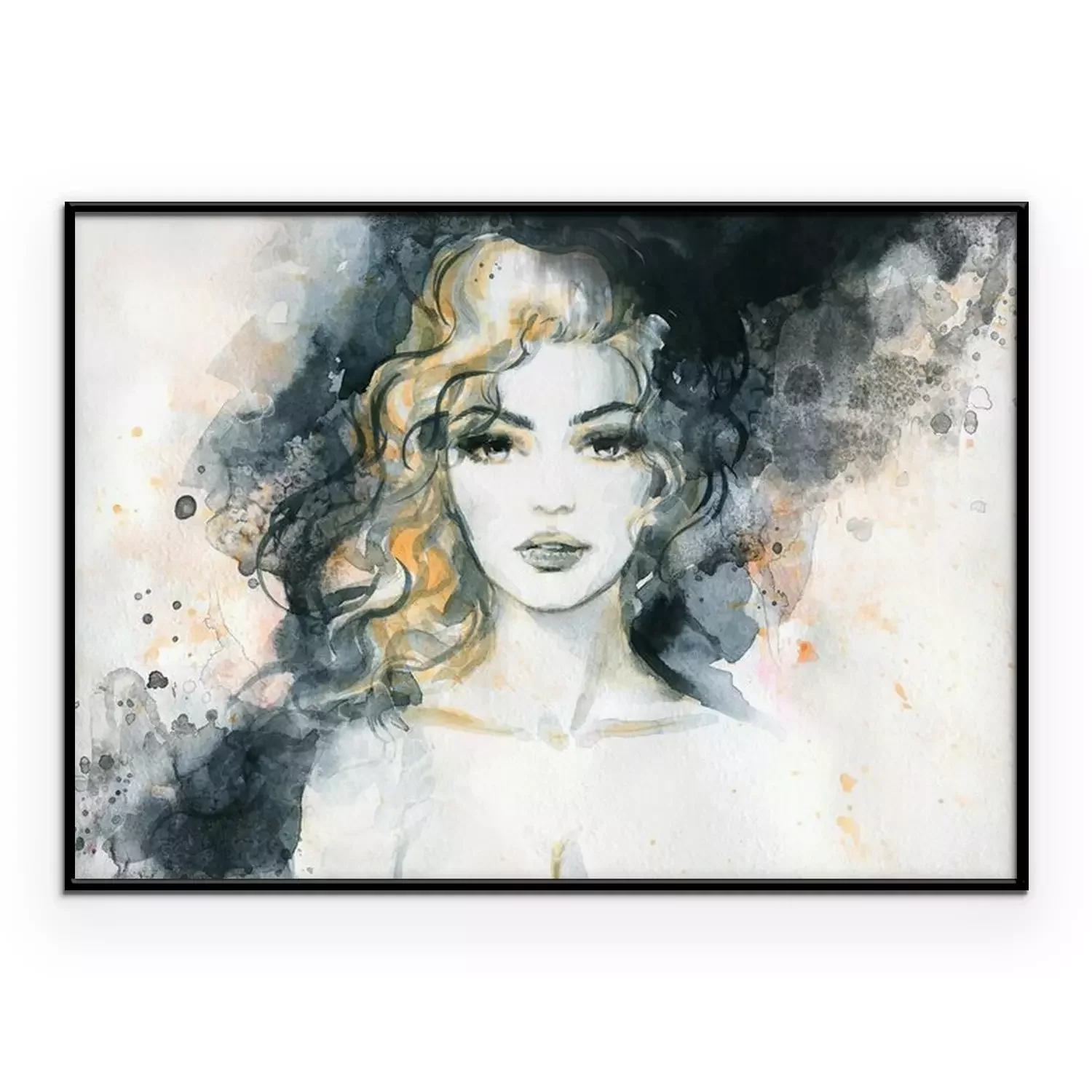 Poster: Vrouw gezicht en zwarte aquarel verf spatten