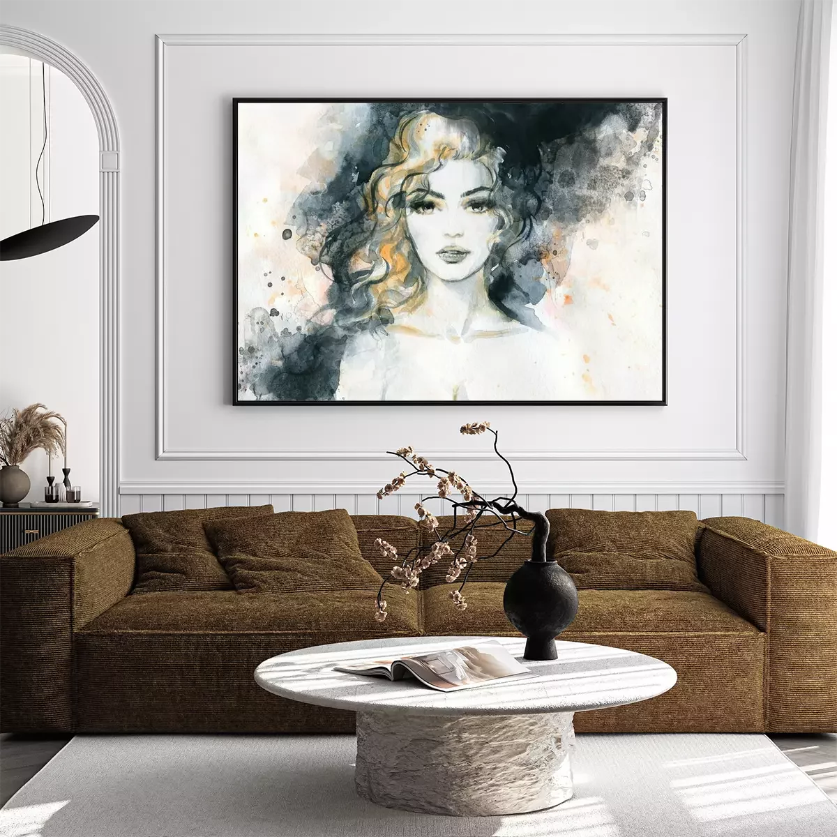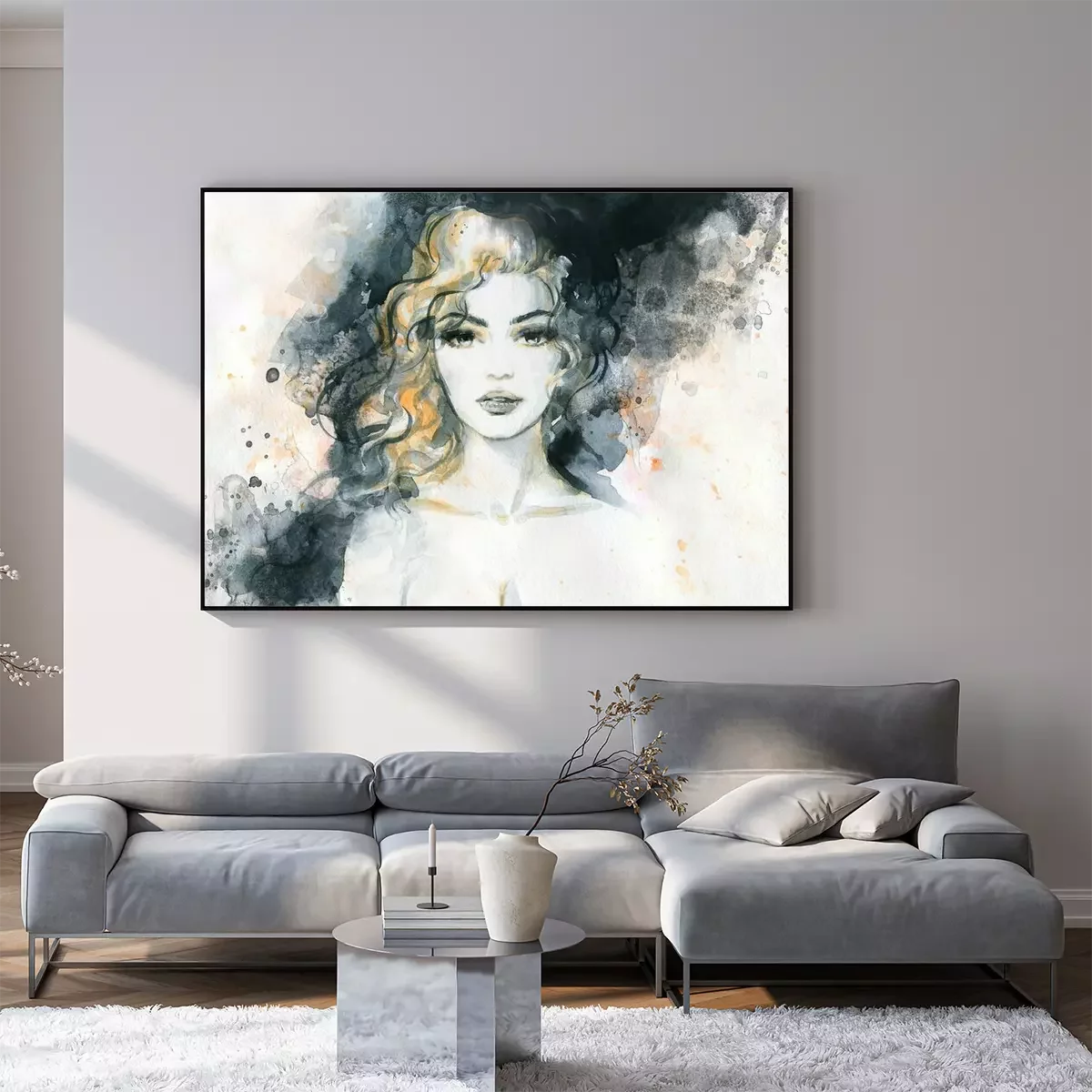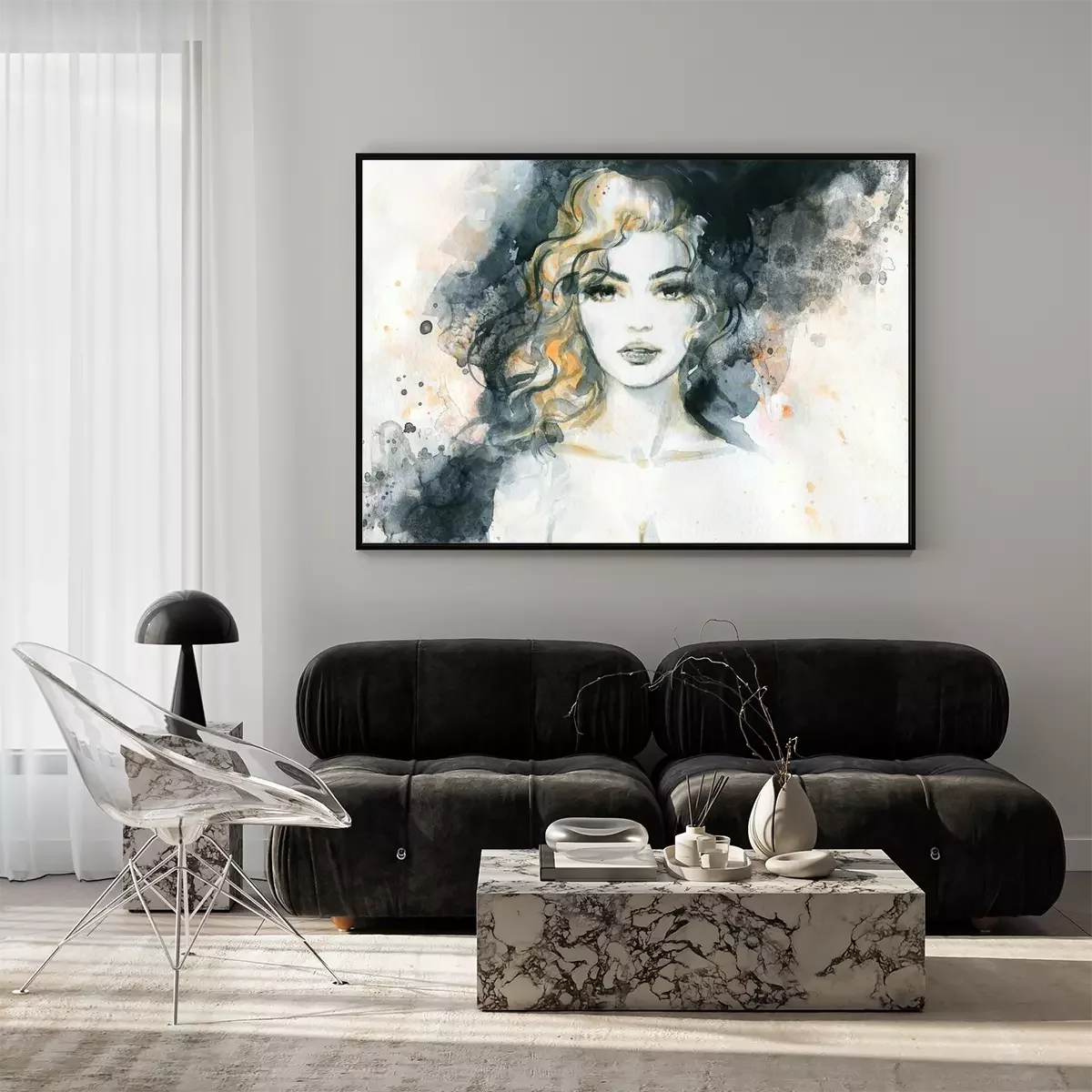 Poster: Vrouw gezicht en zwarte aquarel verf spatten