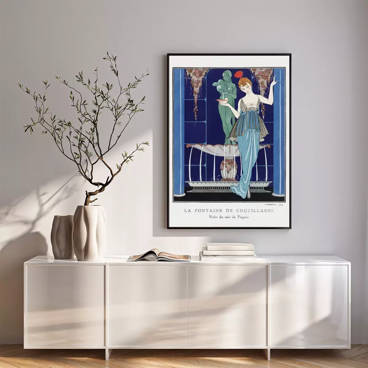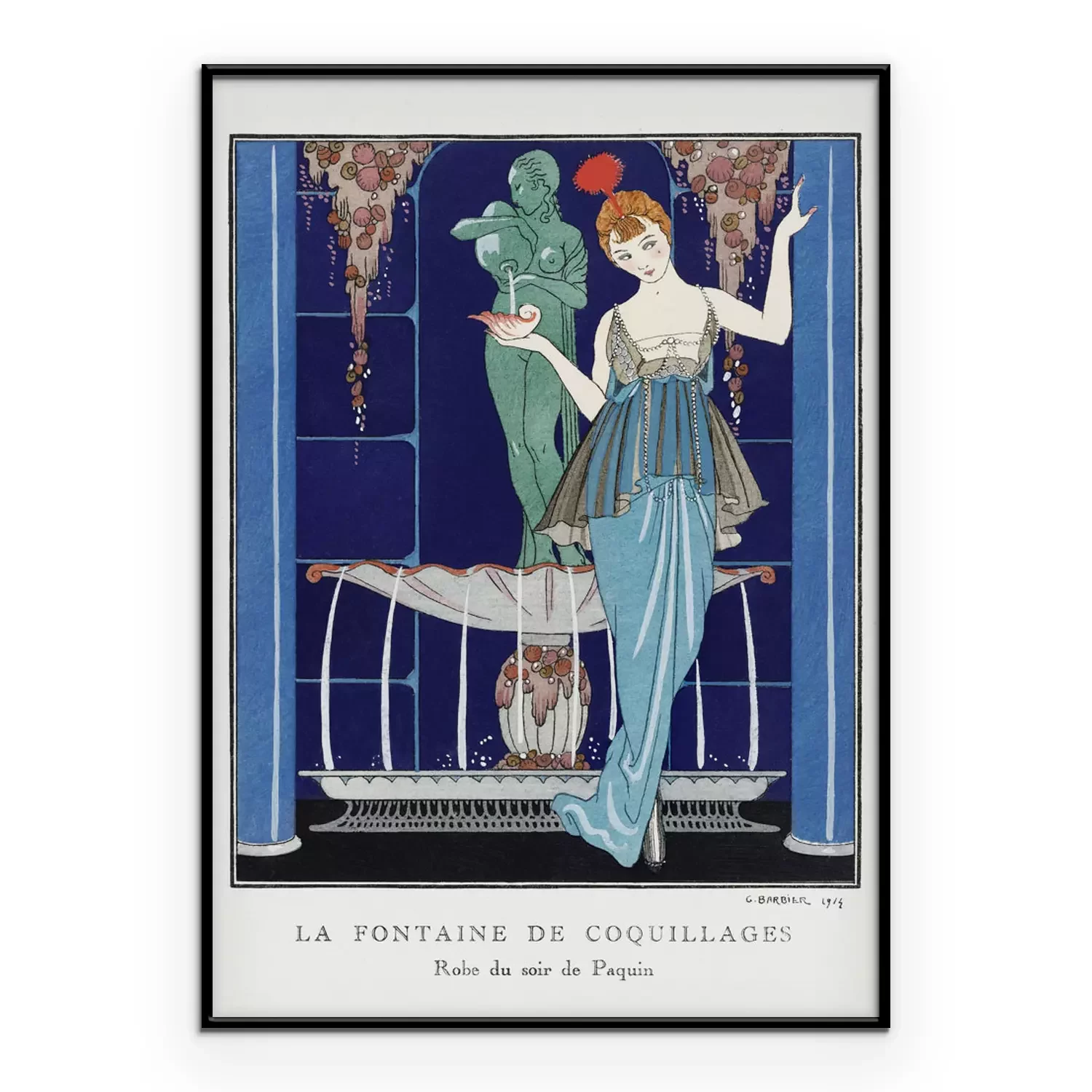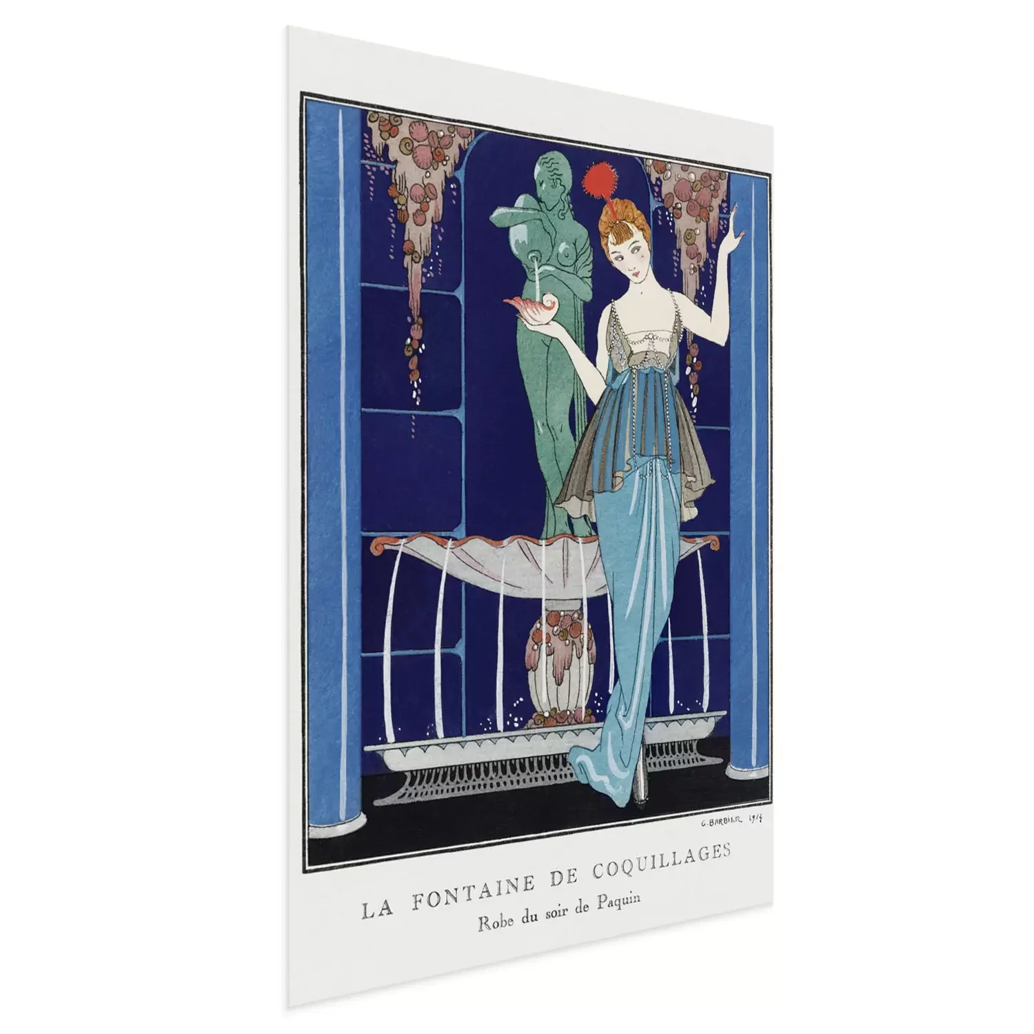 Poster: Vrouw in elegante jurk bij fontein