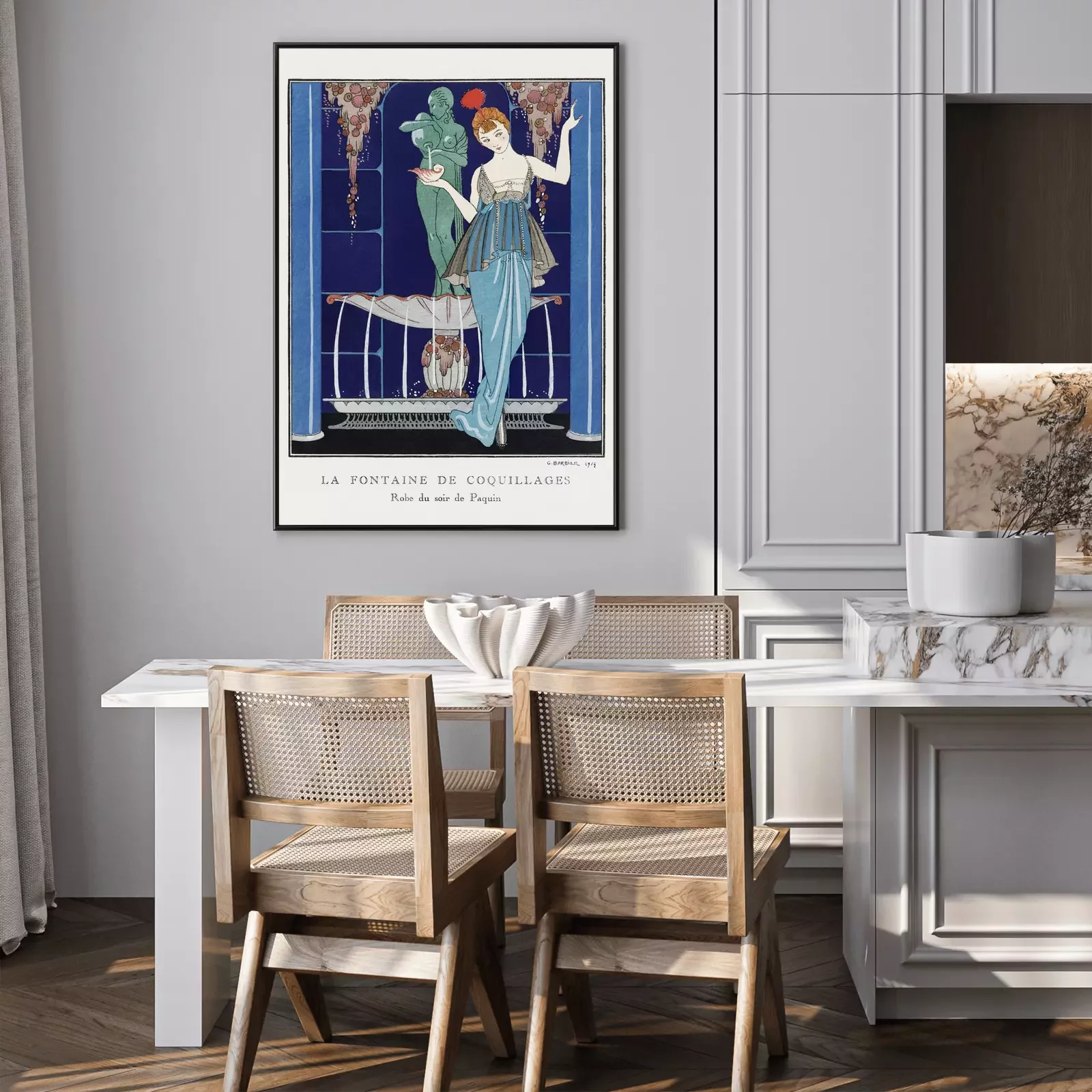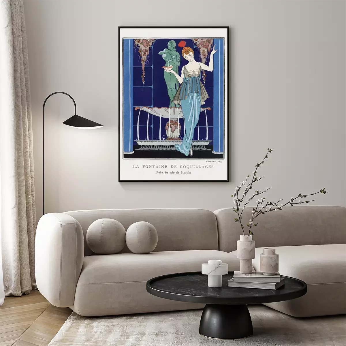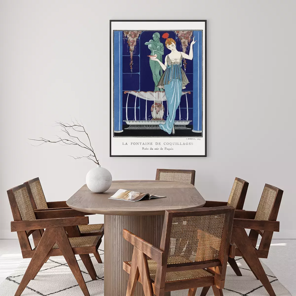 Poster: Vrouw in elegante jurk bij fontein