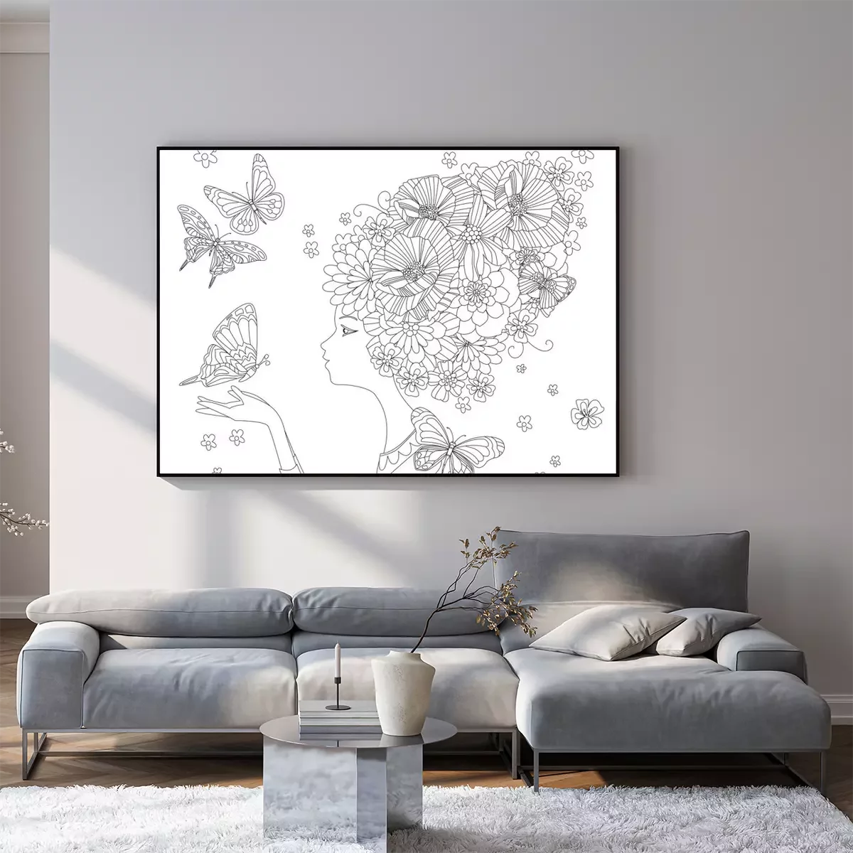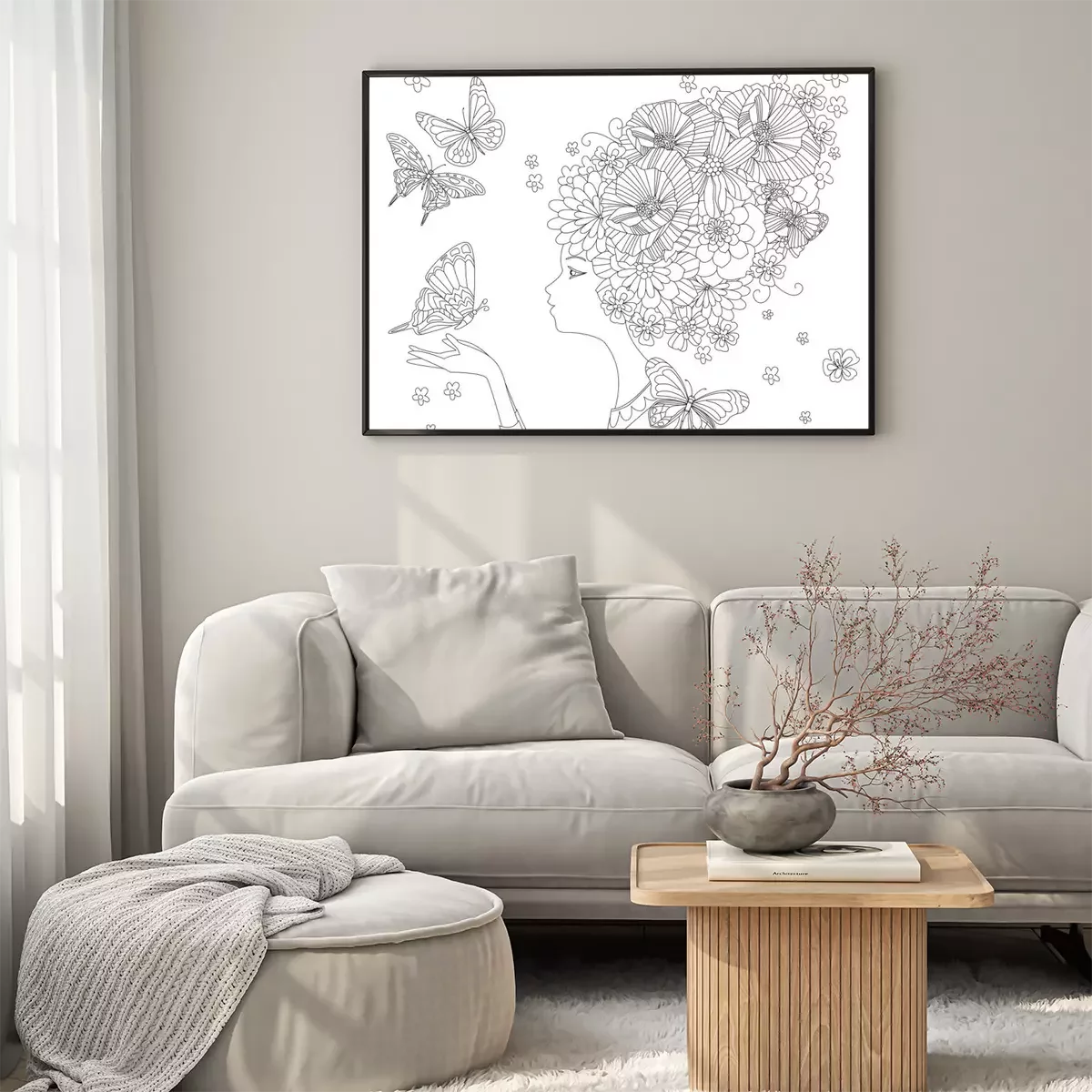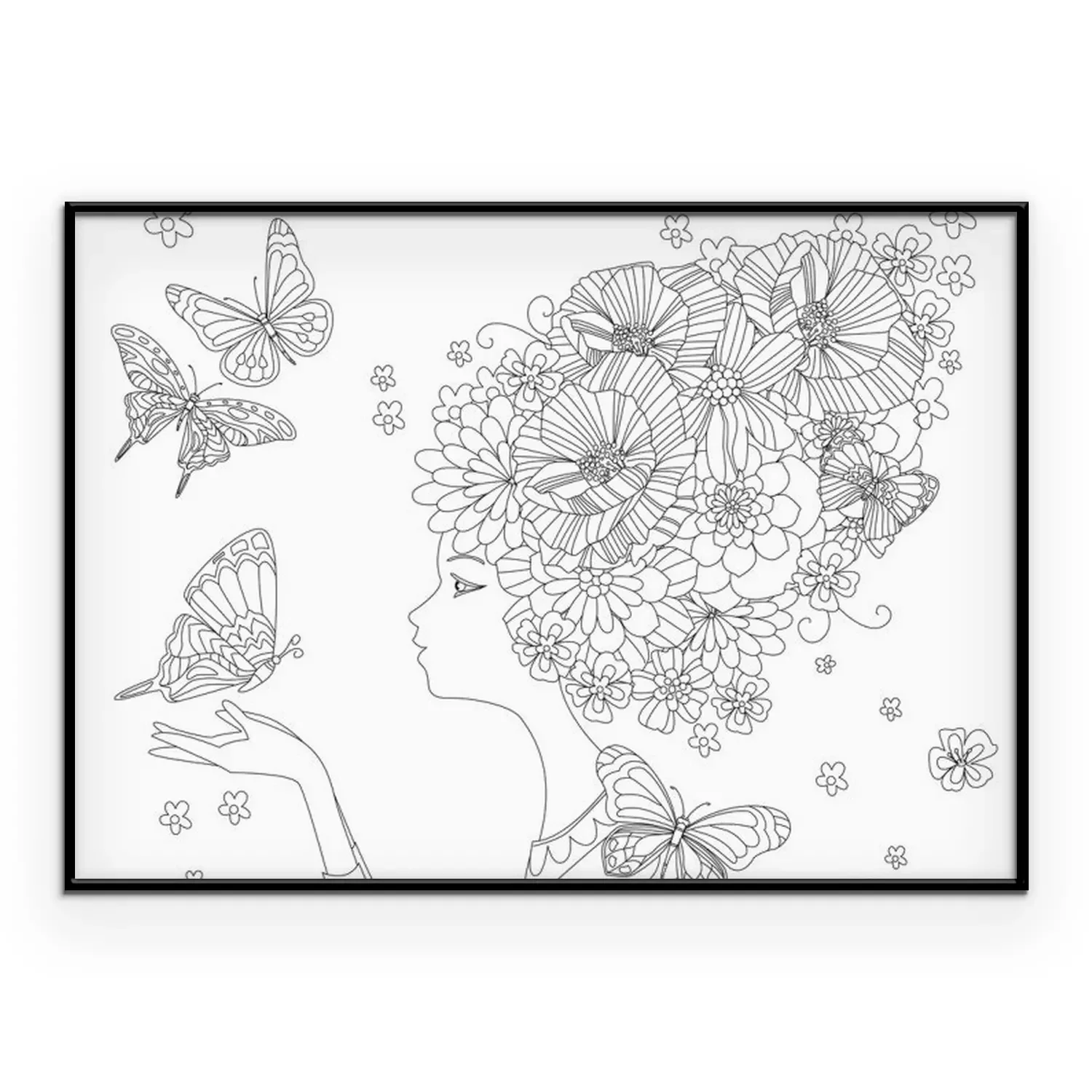 Poster: Vrouw met bloemen in plaats van haar en vlinders