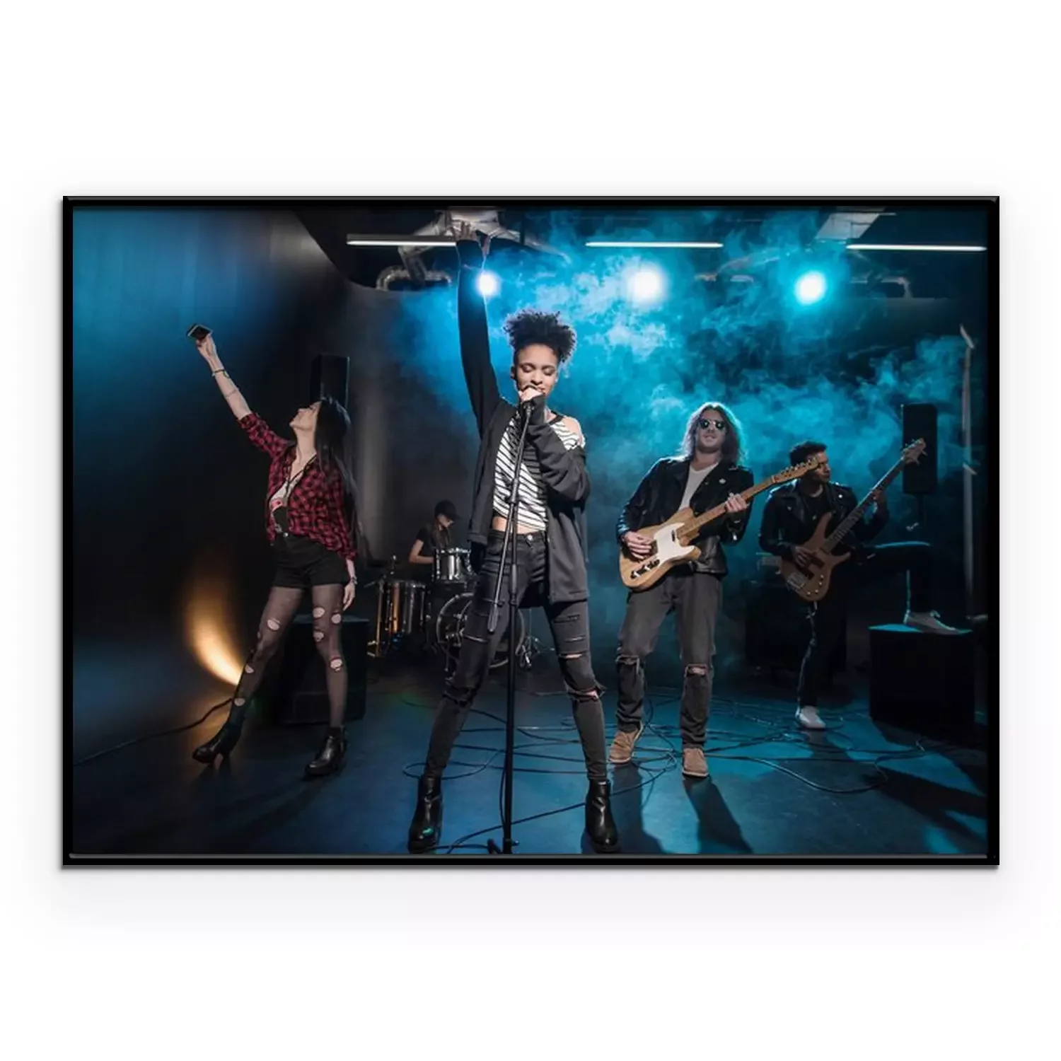 Poster: Vrouwelijke zangeres met microfoon en rock-and-roll band die hard rockmuziek uitvoeren op het podium