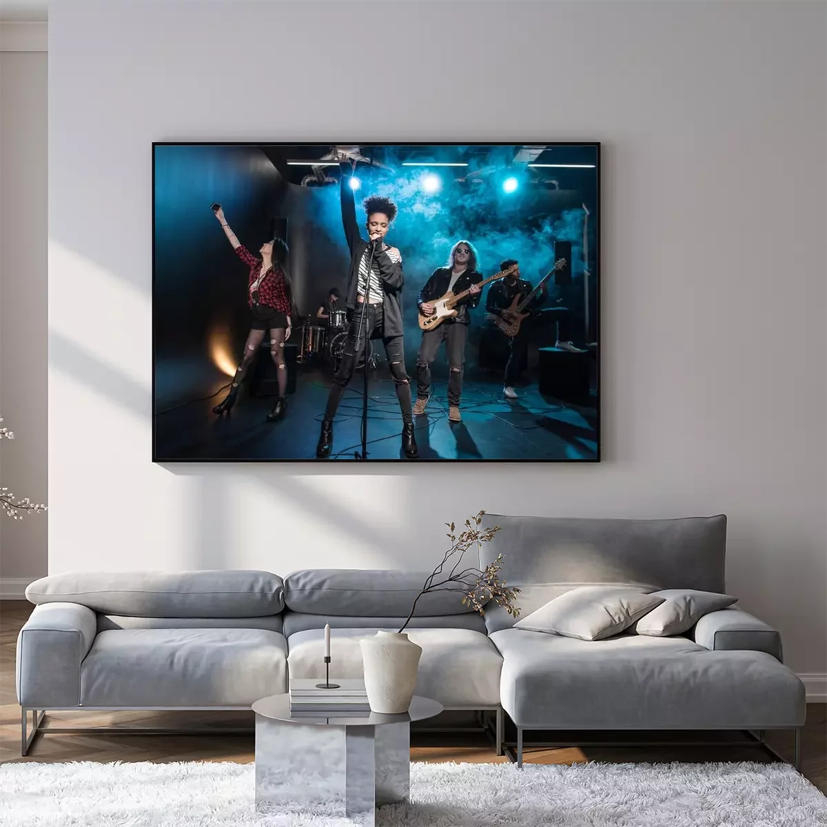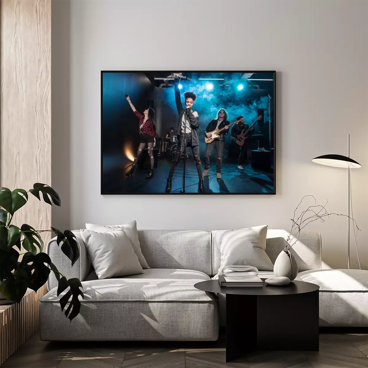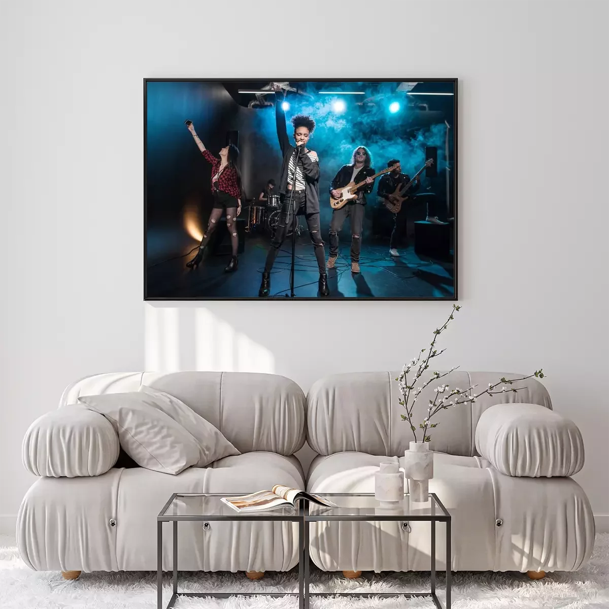 Poster Vrouwelijke zangeres met microfoon en rock-and-roll band die hard rockmuziek uitvoeren op het podium