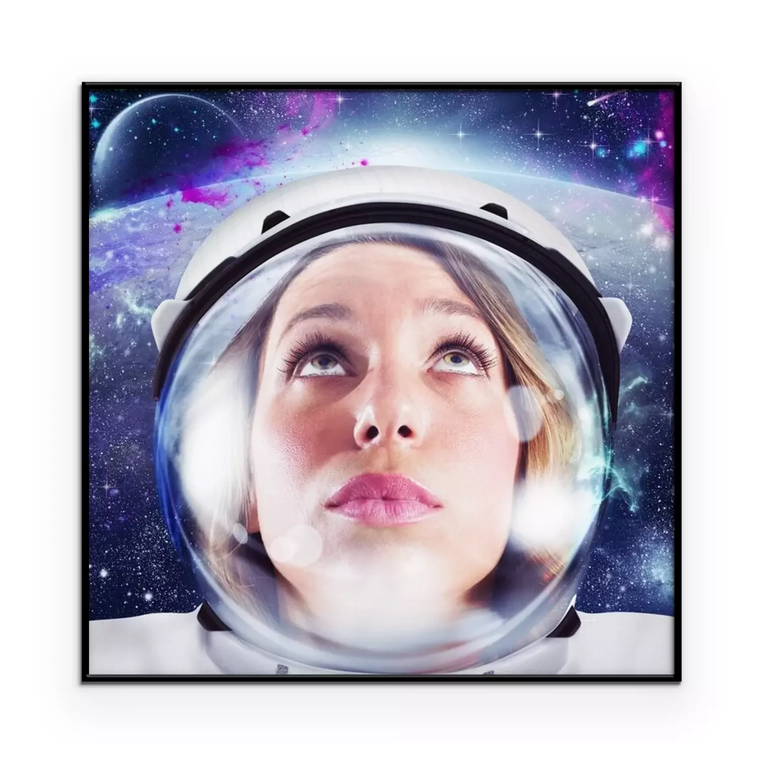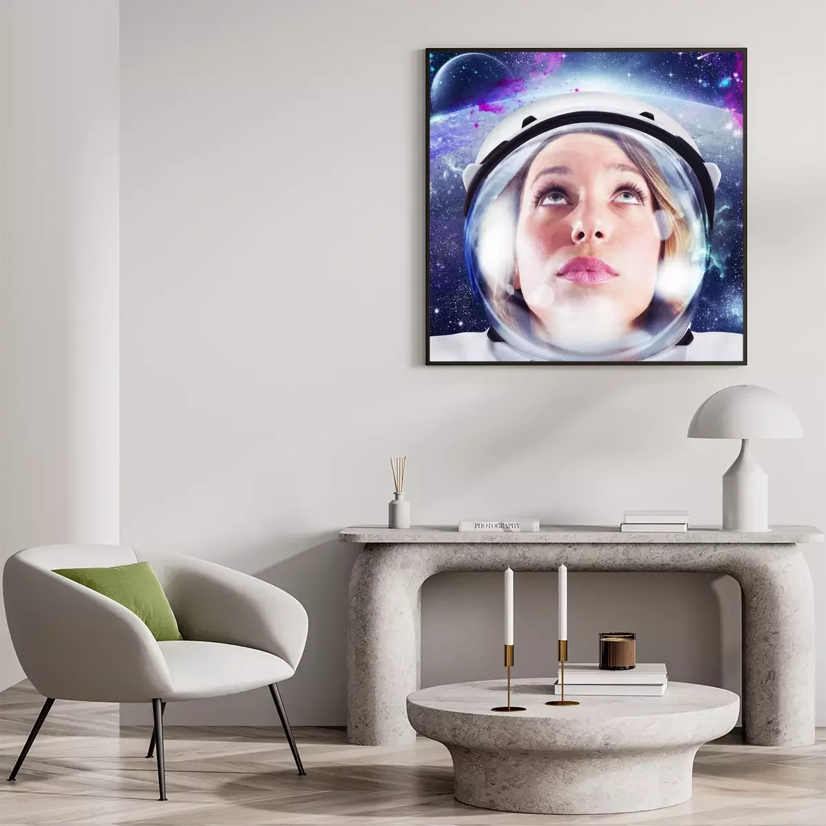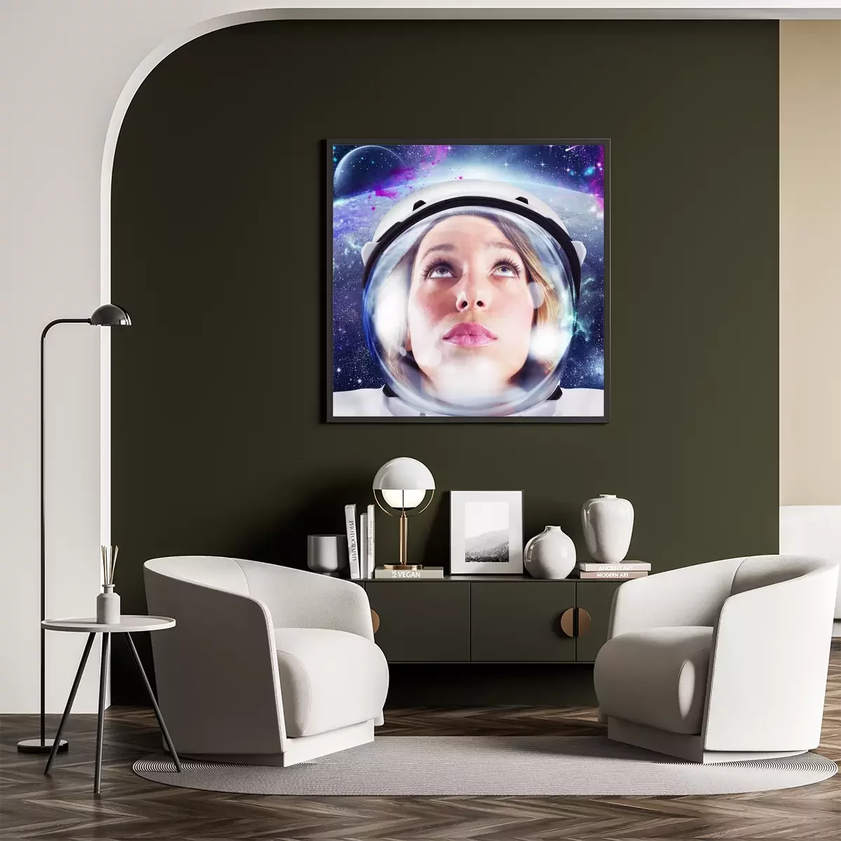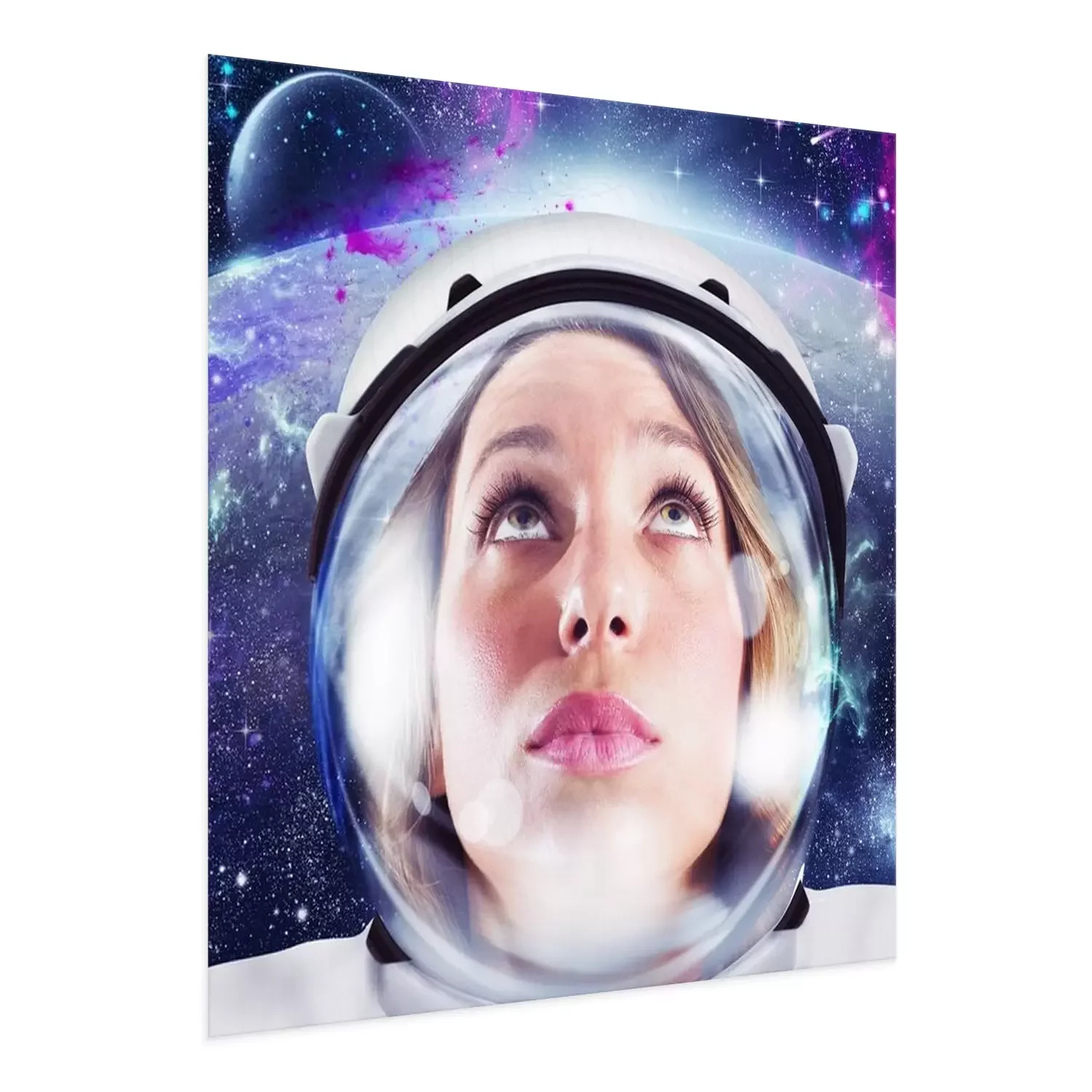 Poster: Vrouwenastronaut en kosmos als achtergrond