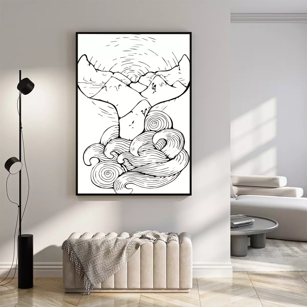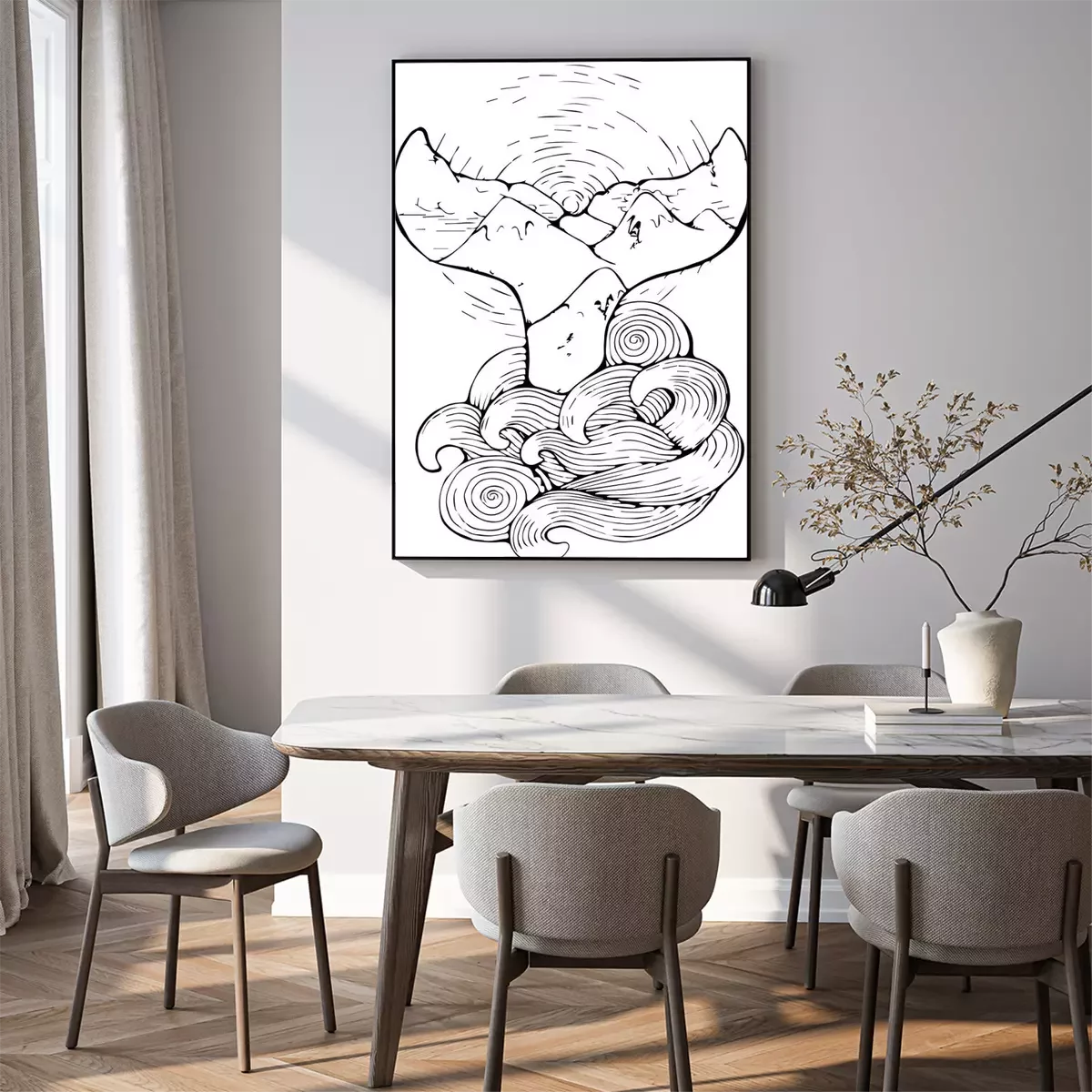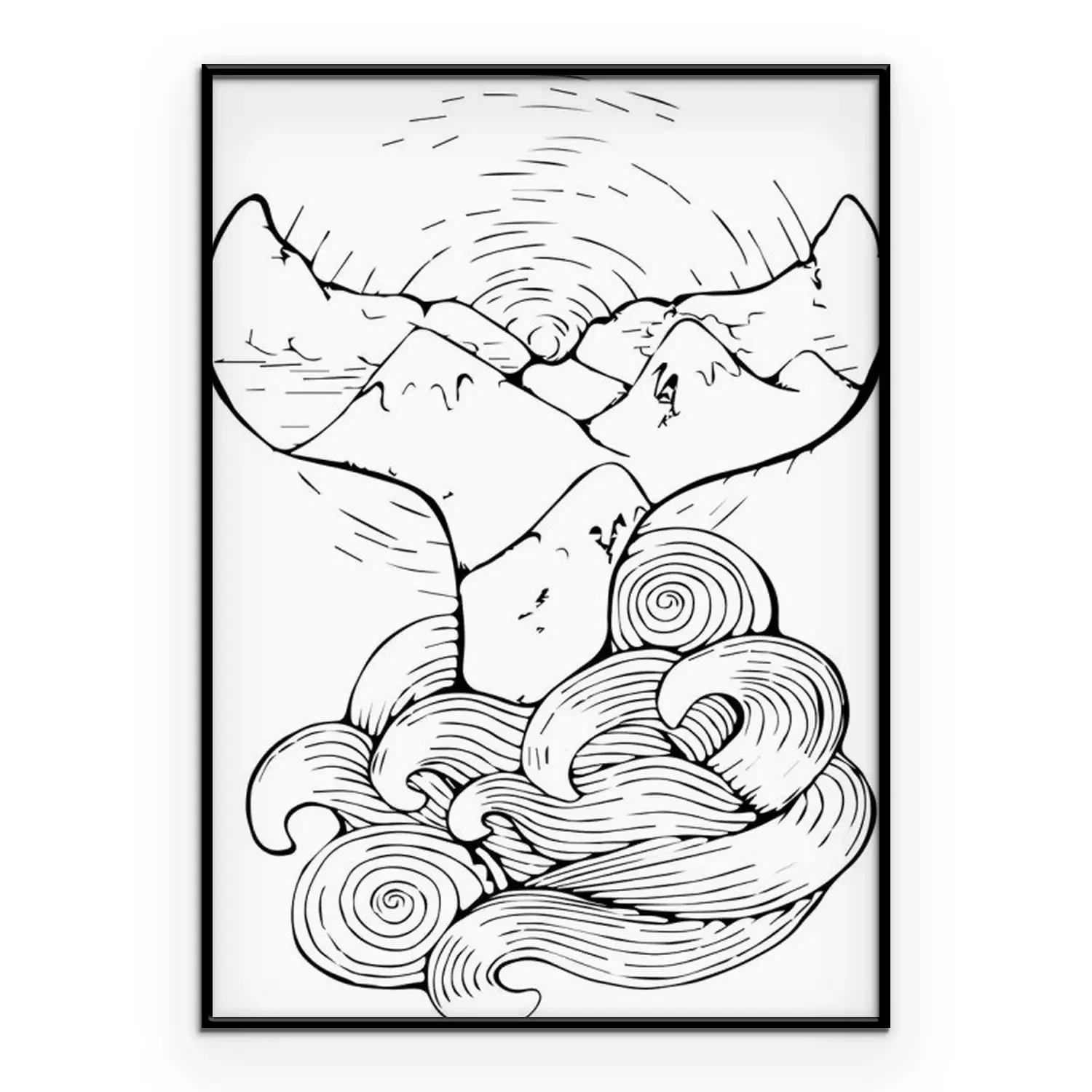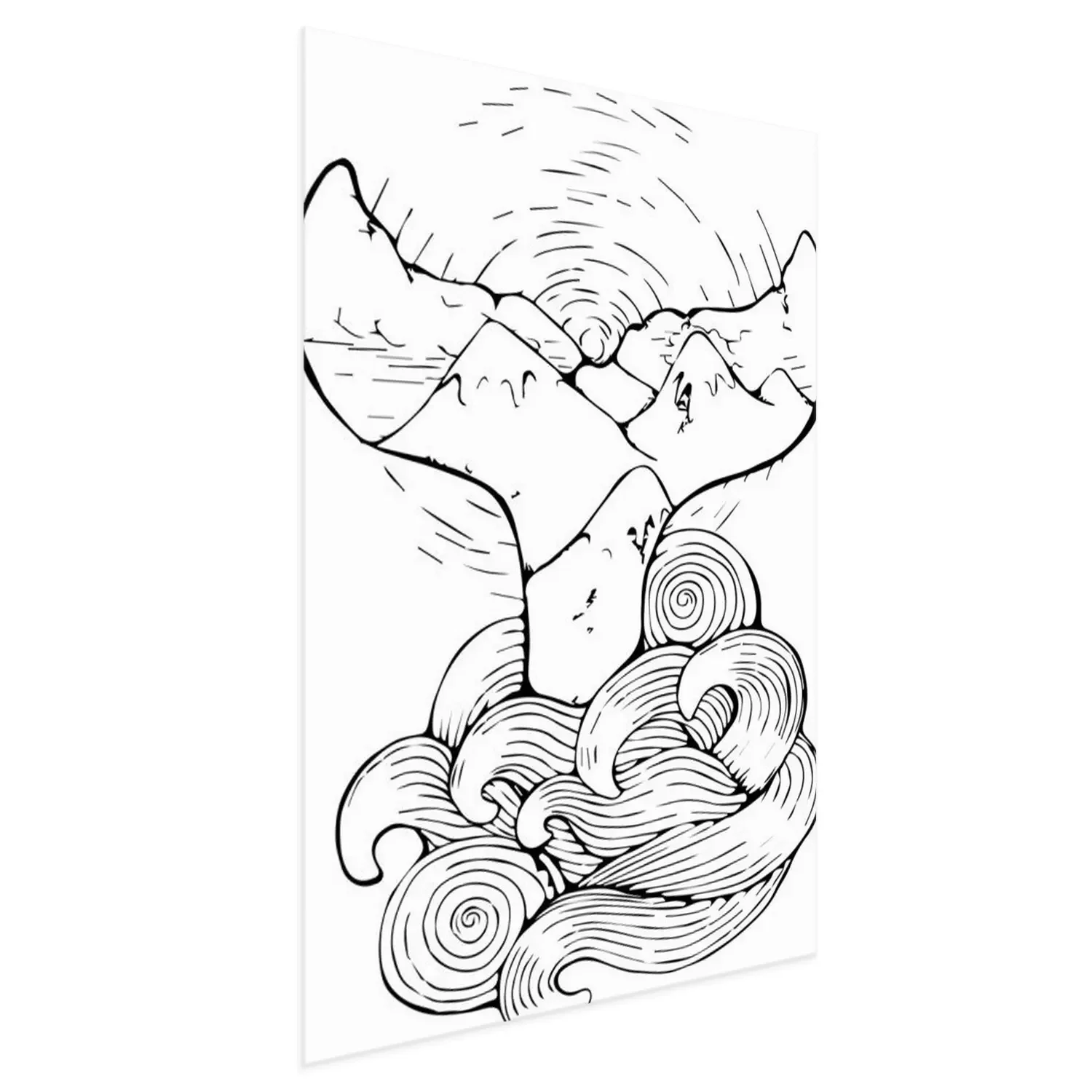 Poster: Walvisstaart die uit tekenfilmgolven tevoorschijn komt
