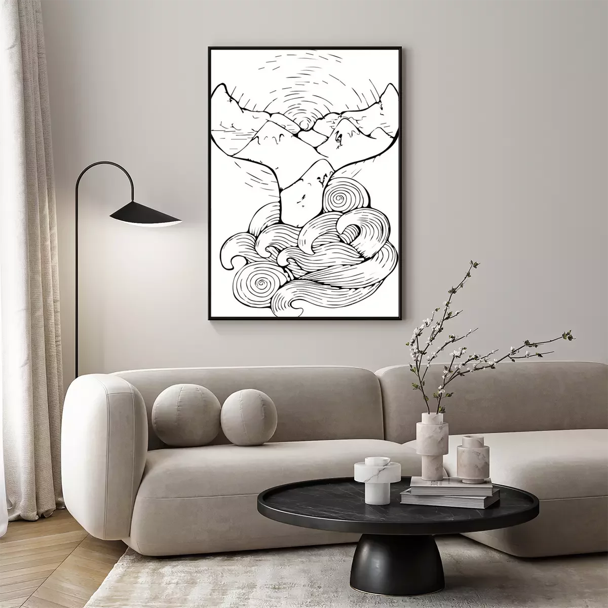 Zwart-wit tekening van ruwe zeegolven