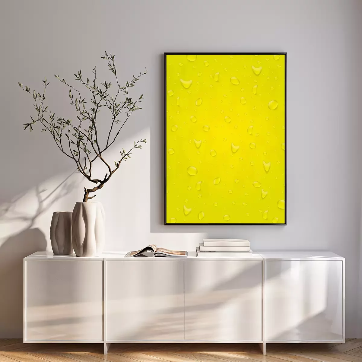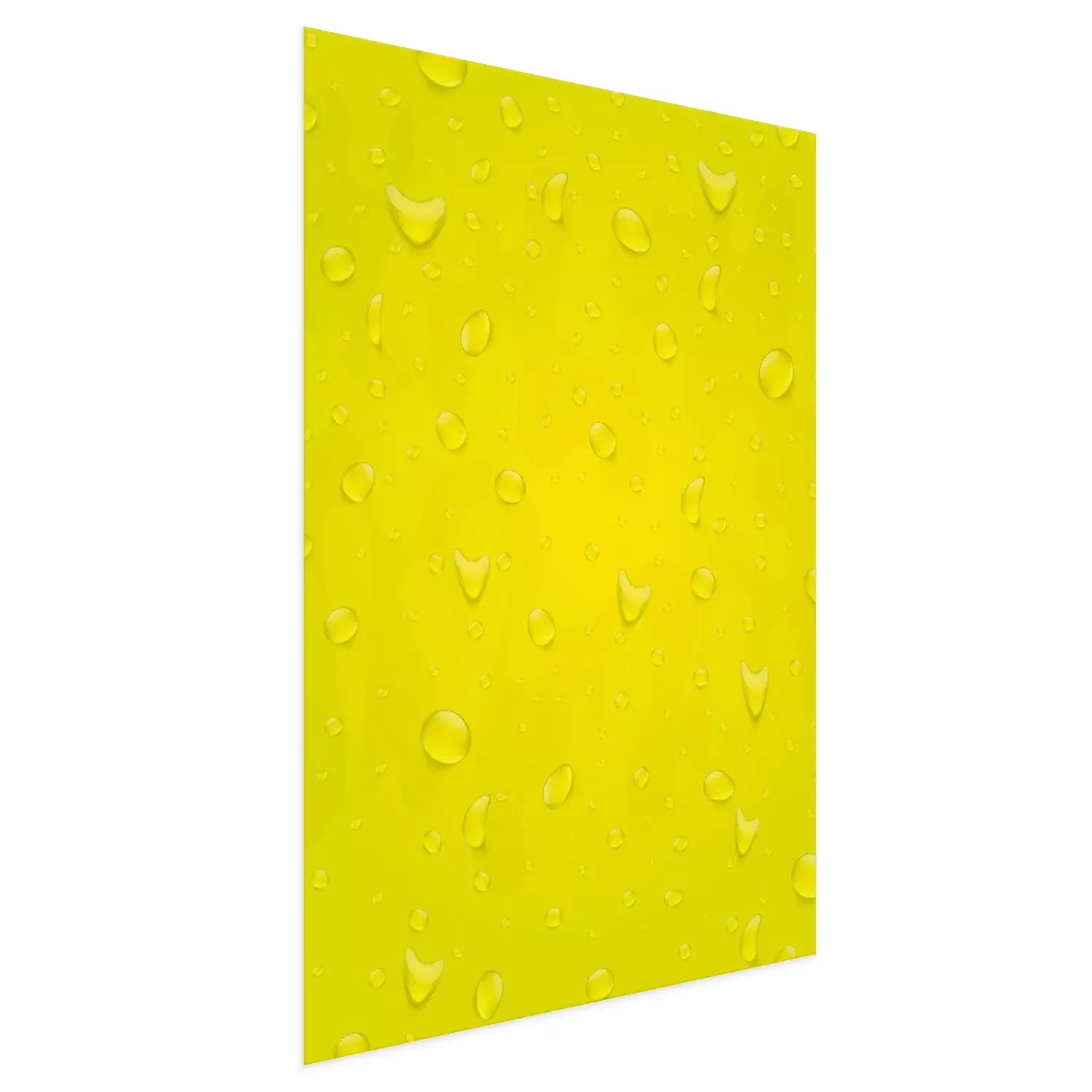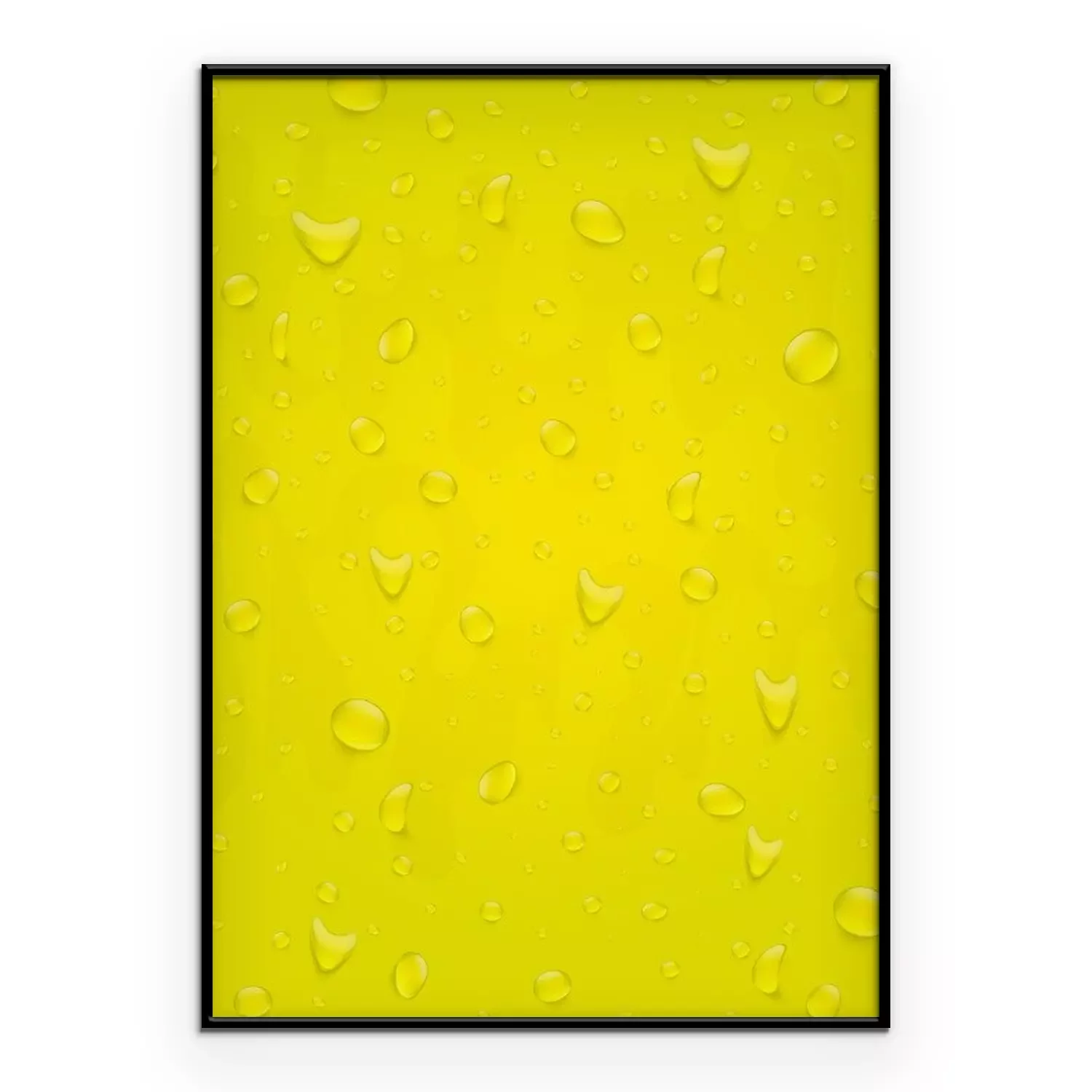 Poster: Water drops background. Rainfall over colorful glass surface. Yellow color drink beverage concept. 3d realistic vector illustration poster.
