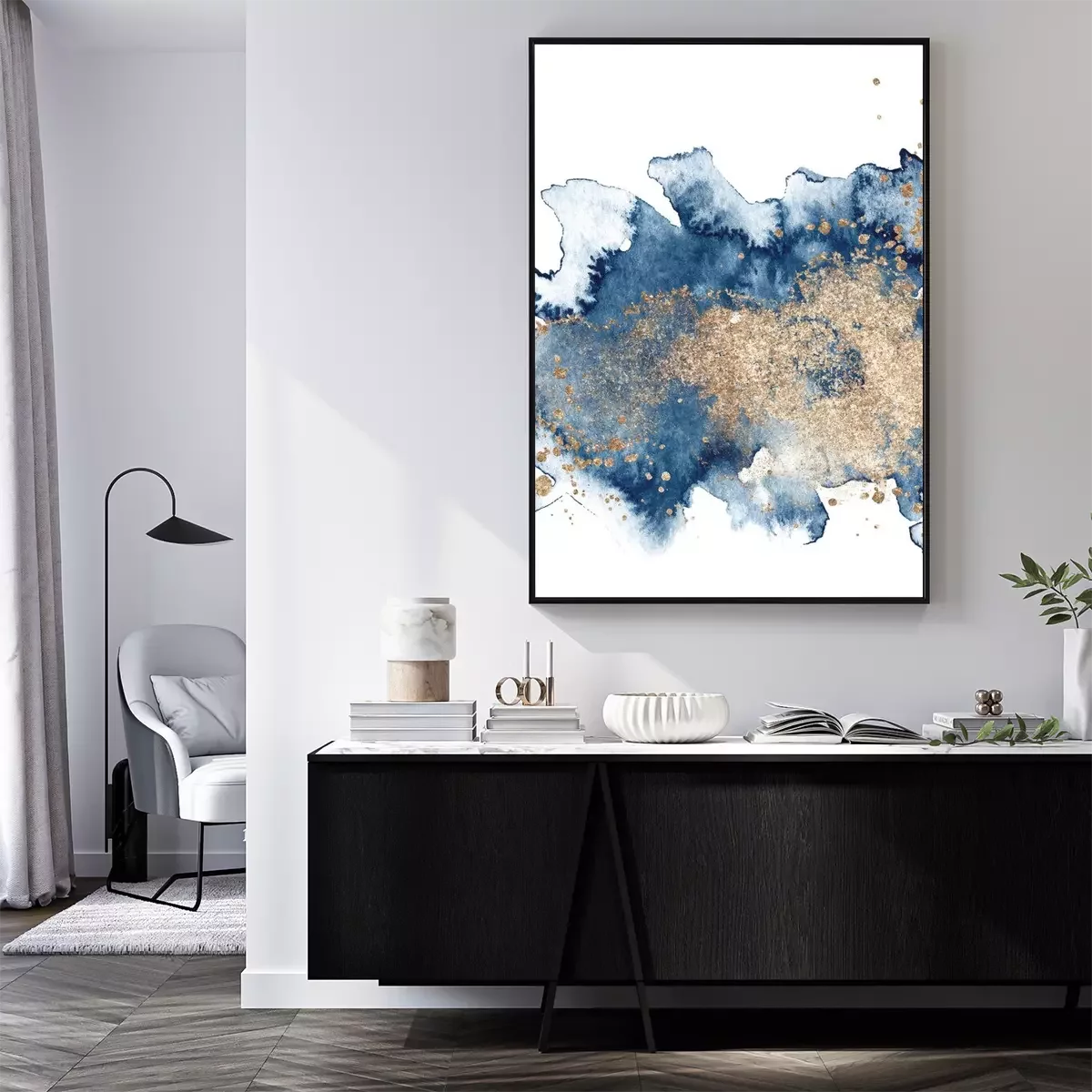 Poster Watercolor abstract classic blue and gold, background, hand drawn watercolour texture