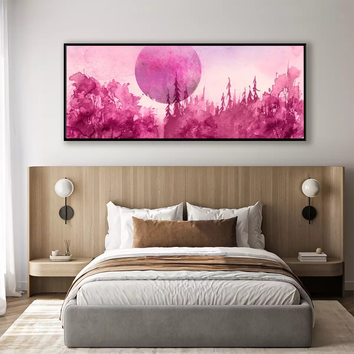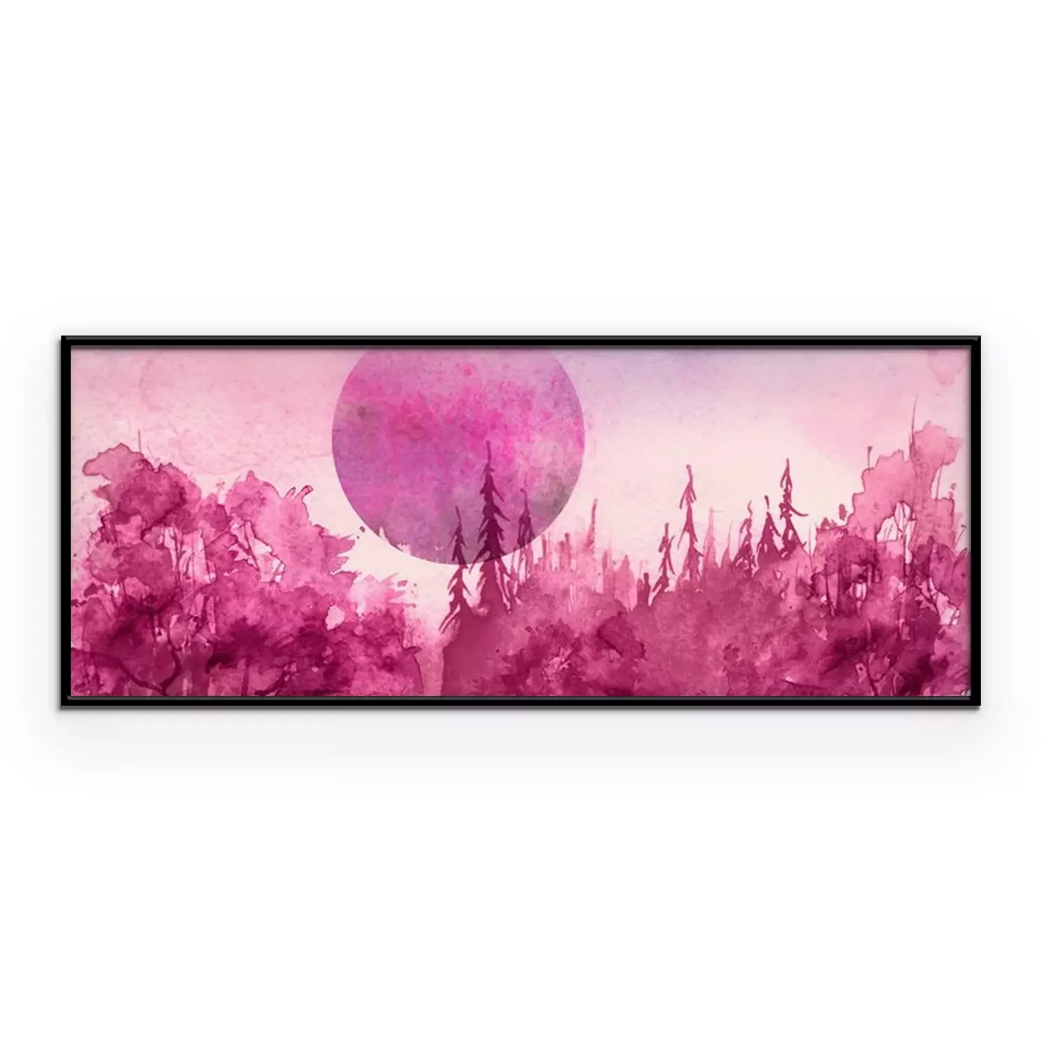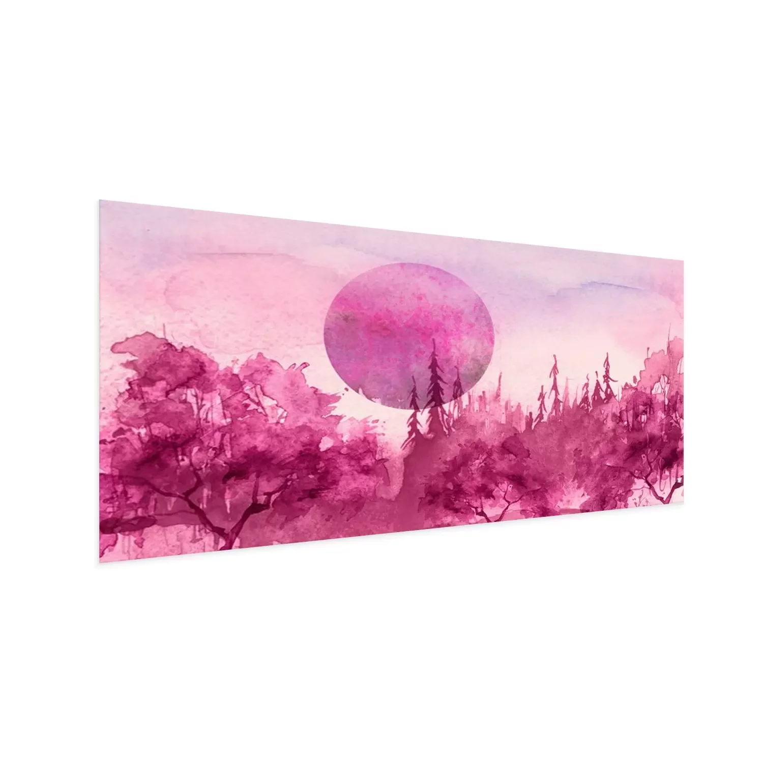 Poster Watercolor drawing, illustration. Forest landscape, fir, pine, tree, cedar, red, pink sun, sunset, sunrise. Splash paint, abstract illustration. Art painting. Winter landscape. Mystic forest
