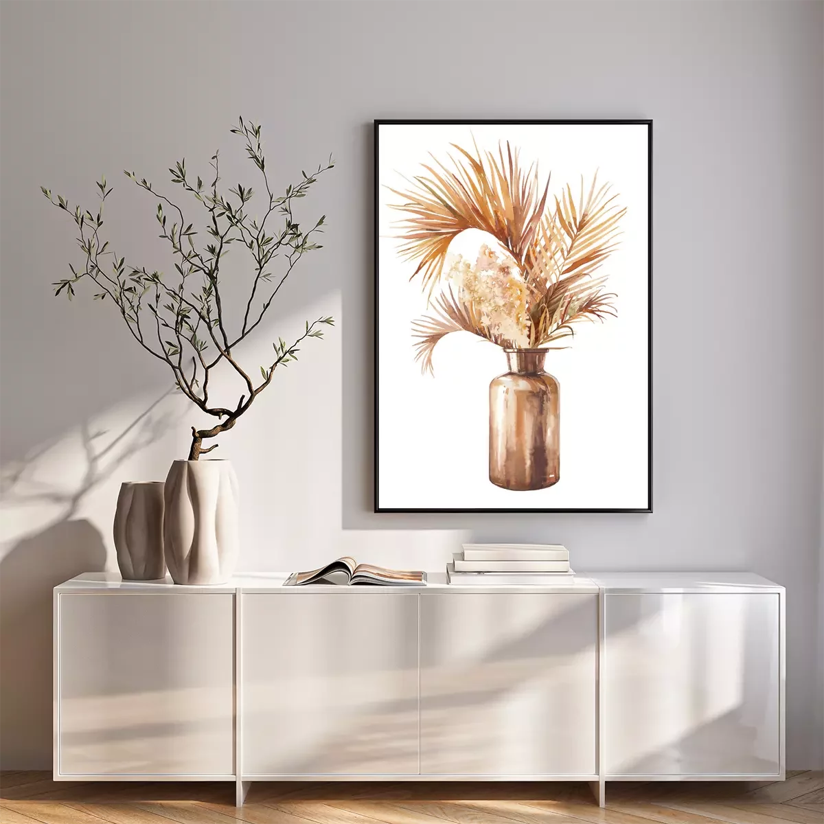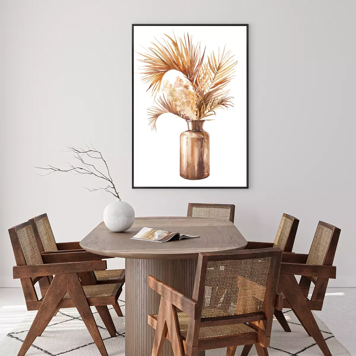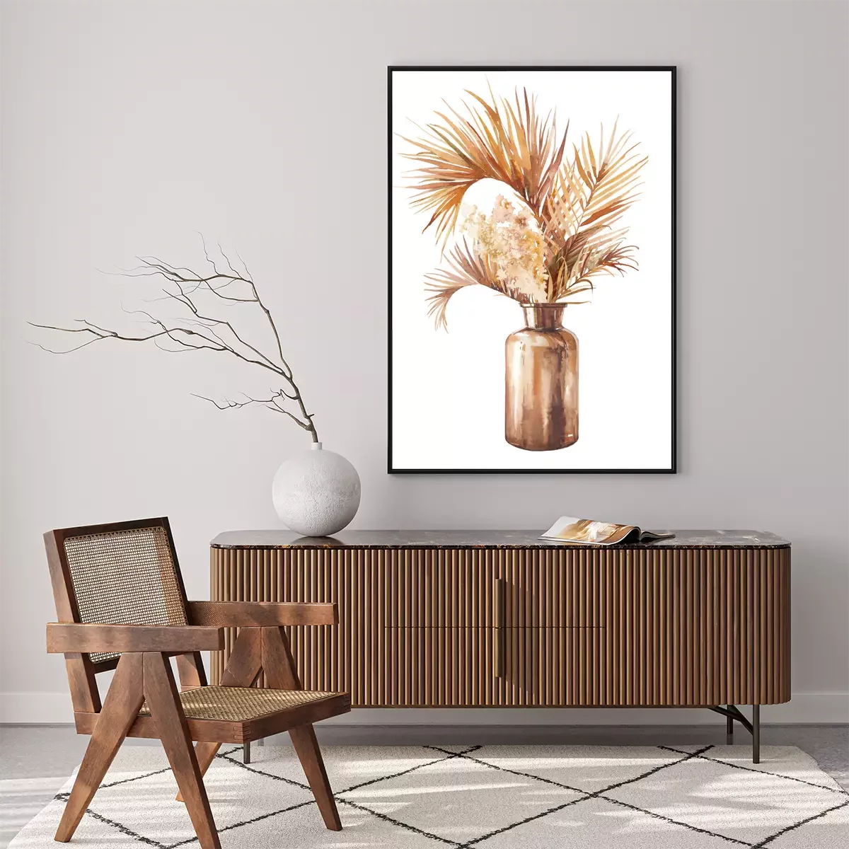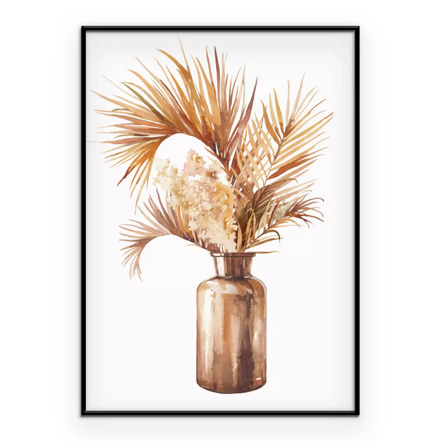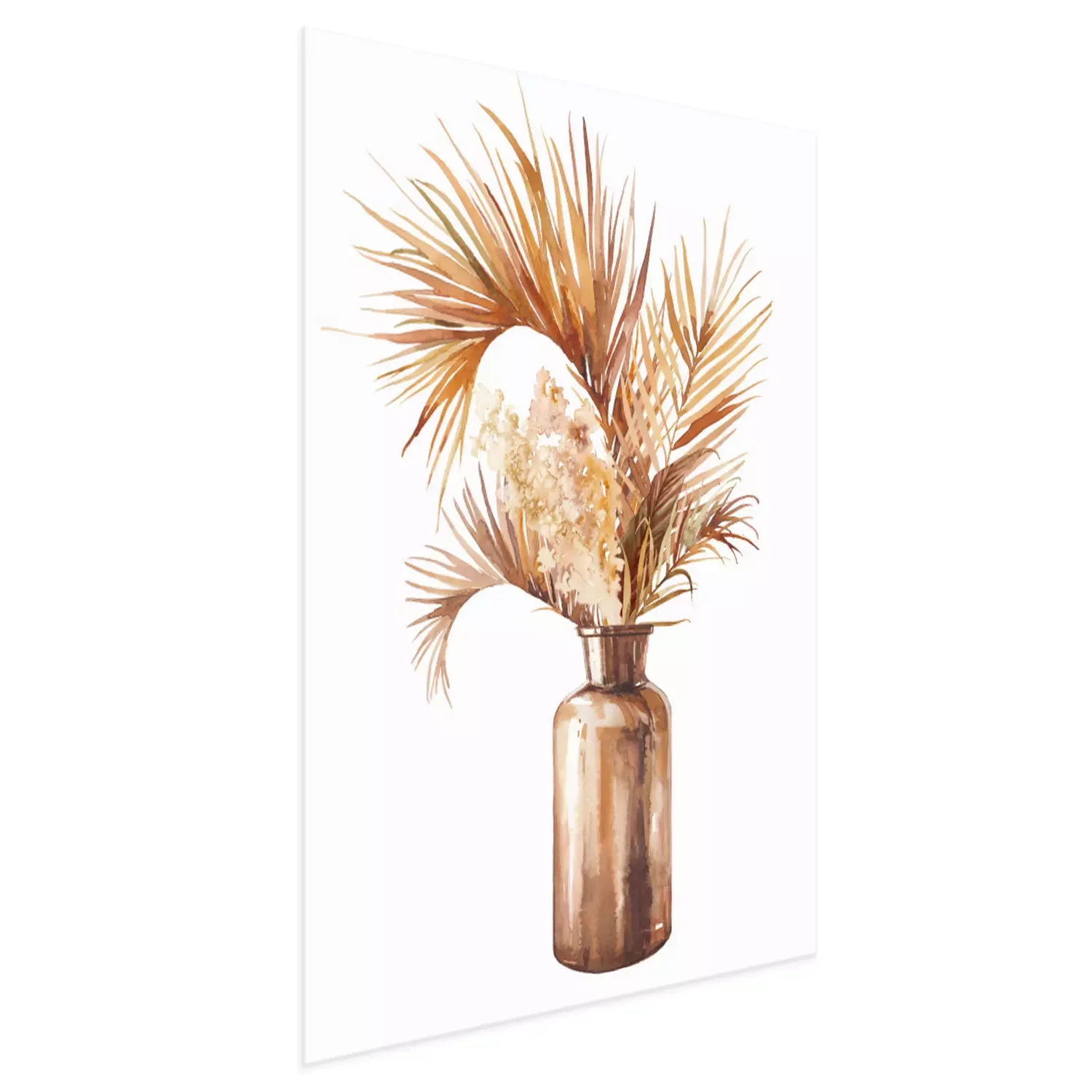 Poster: Watercolor dried tropical plants bouquet in glass bottle. Boho chic home decor. Isolated illustration on white background