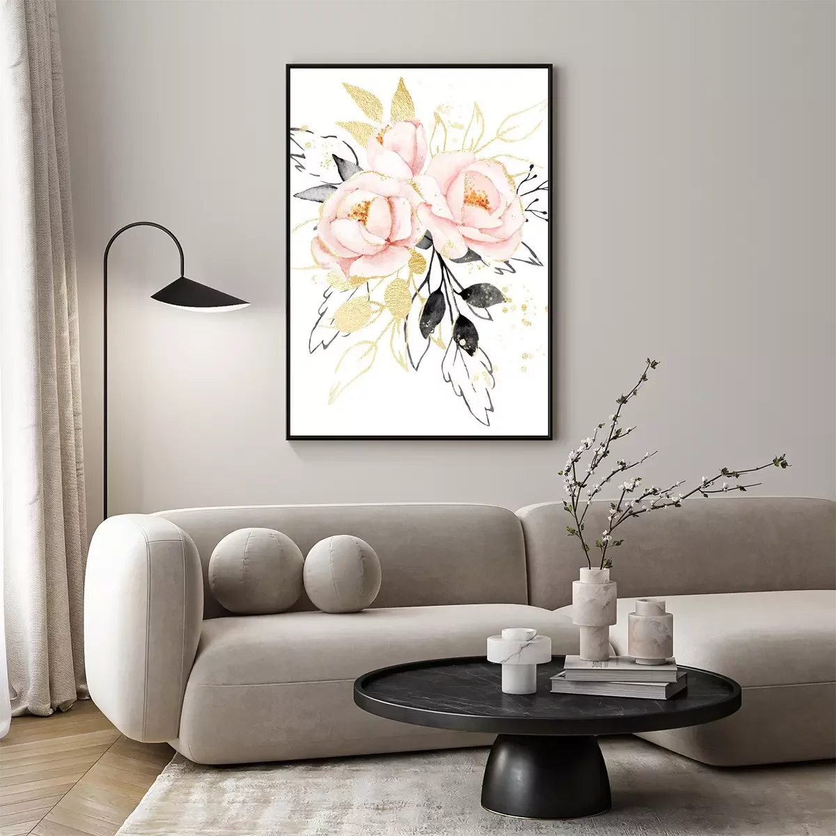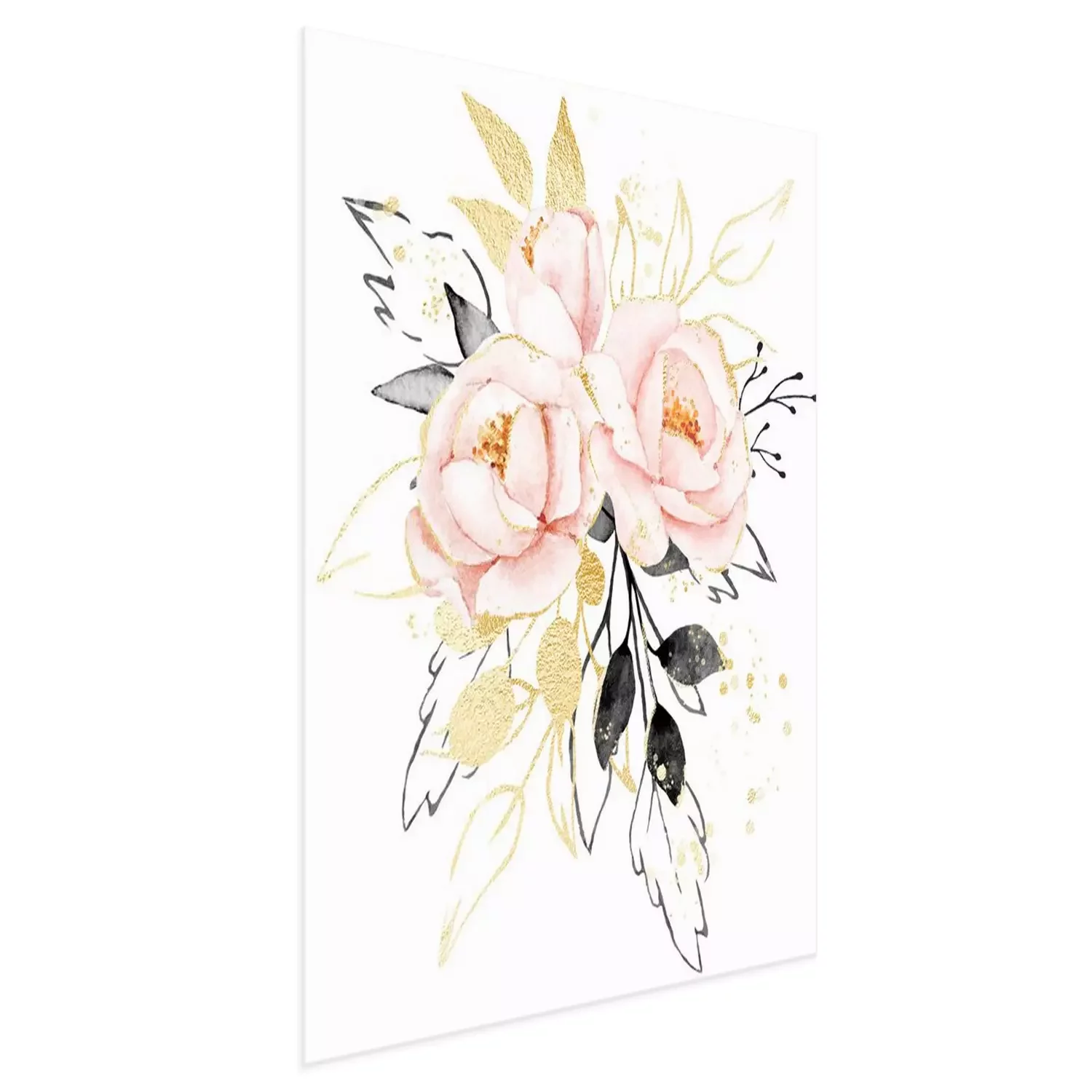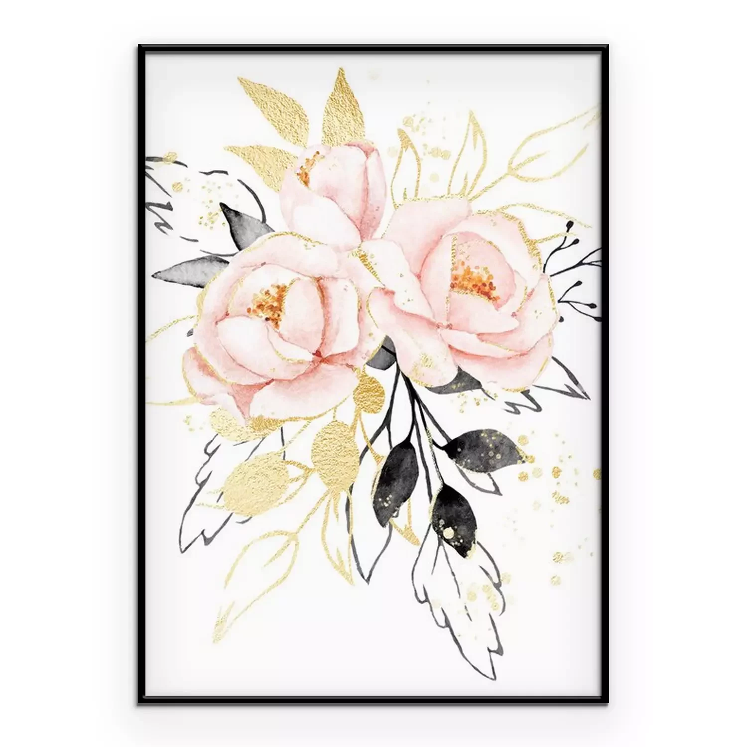 Poster Watercolor flowers, floral bouquet with gold gray leaves and blush pink peonies. Perfectly for print on greeting card, wedding invitation, poster. Hand drawing. Composition isolated on white.