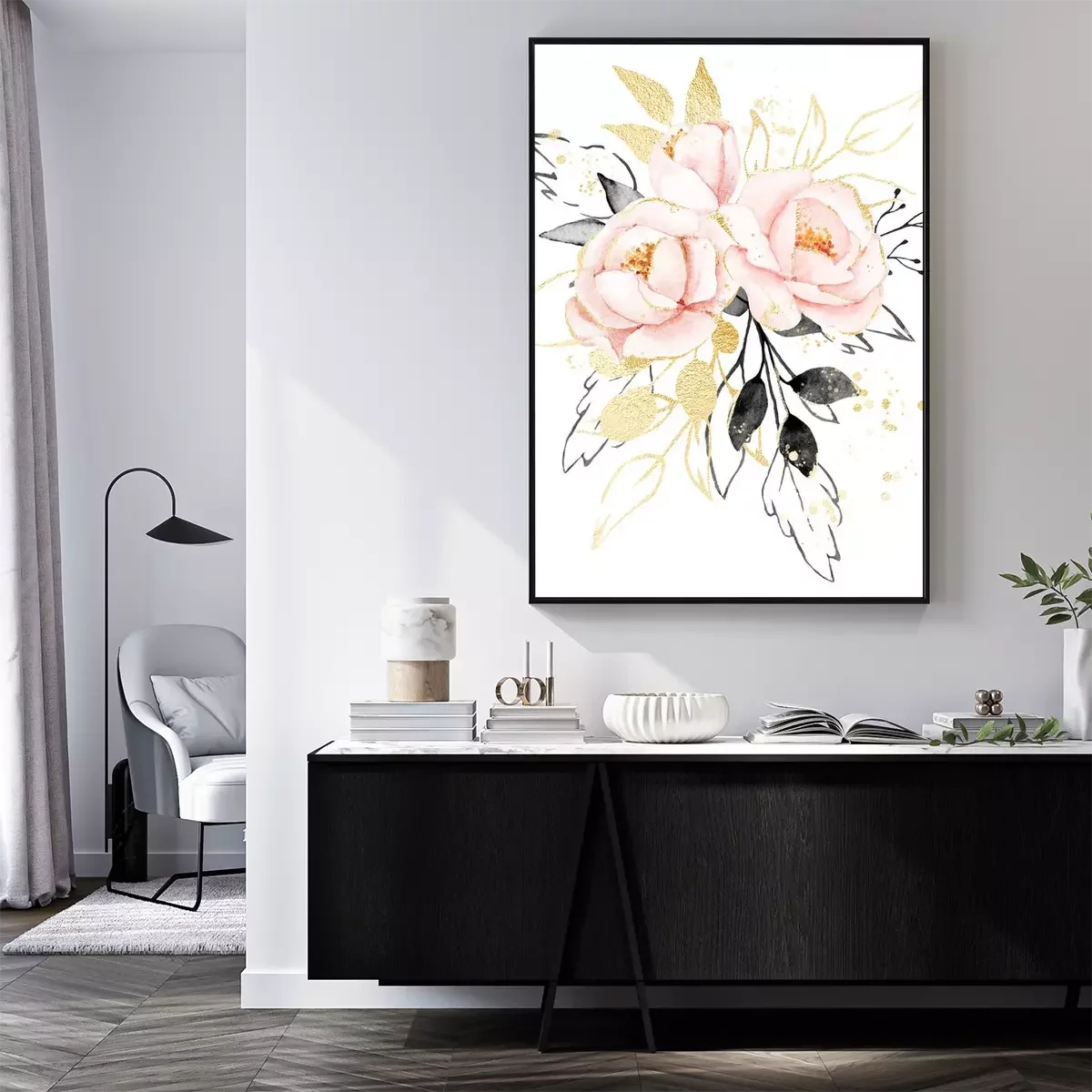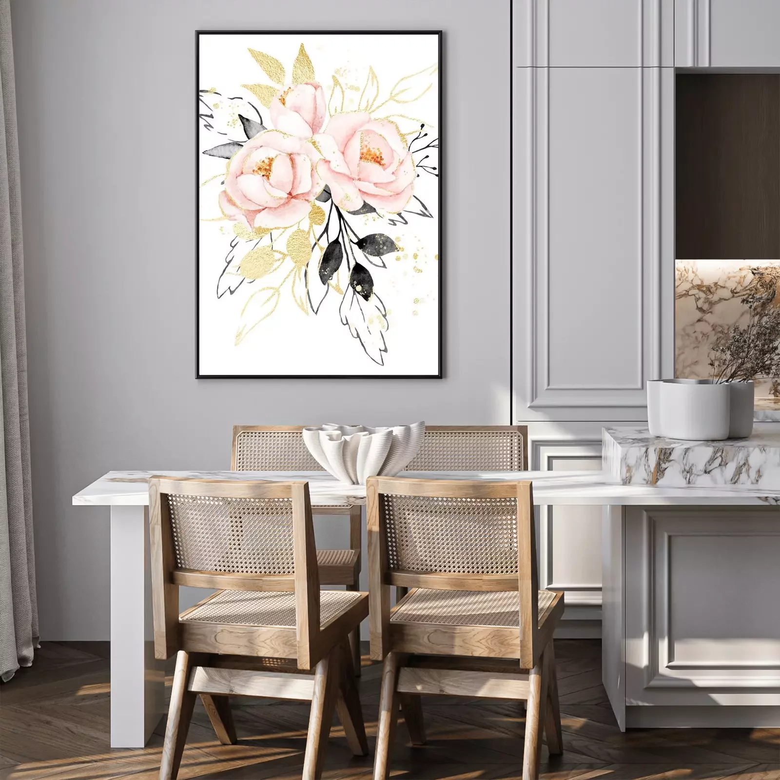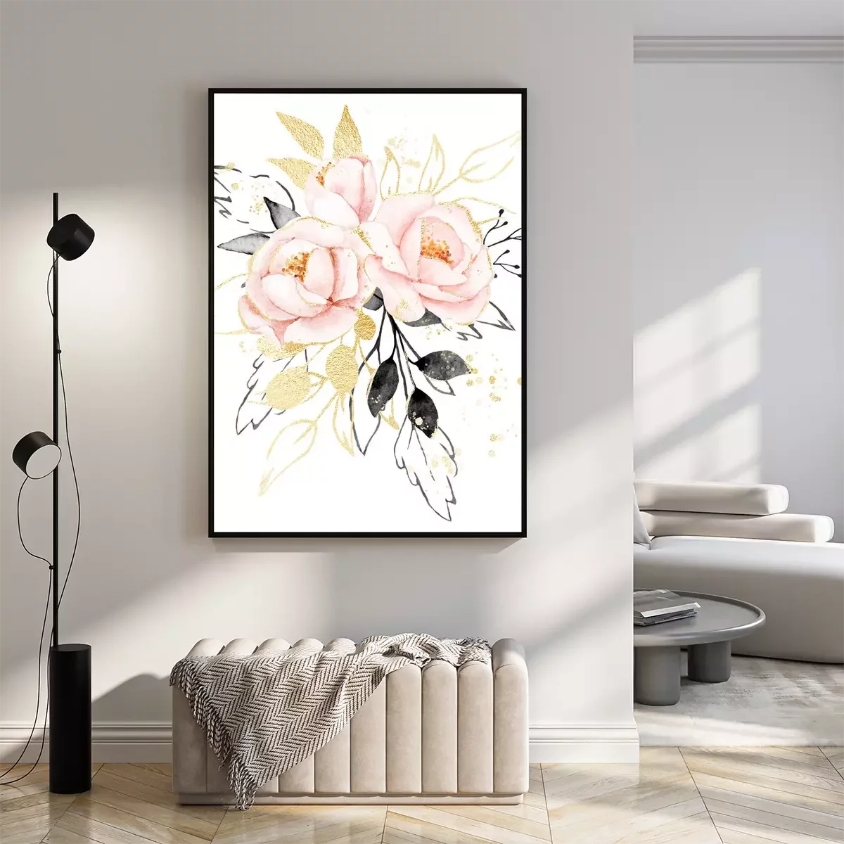 Poster Watercolor flowers, floral bouquet with gold gray leaves and blush pink peonies. Perfectly for print on greeting card, wedding invitation, poster. Hand drawing. Composition isolated on white.